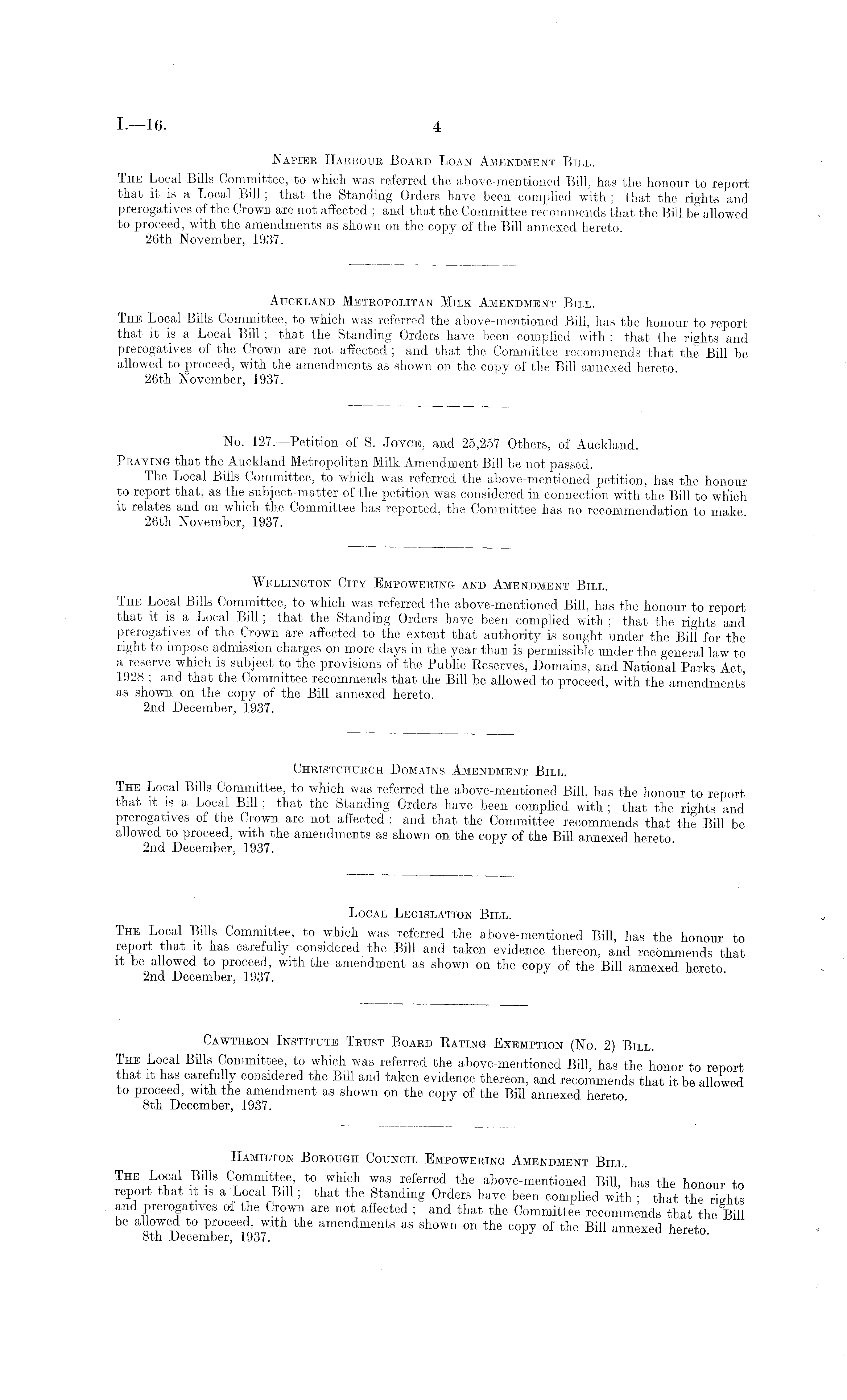 Napier Harbour Board Loan Amendment Bill. The Local Bills Committee, to which was referred the above-mentioned Bill, has the honour to report that it is a Local Bill ; that the Standing Orders have been complied with ; that the rights and prerogatives of the Crown are not affected ; and that the Committee recommends that the Bill be allowed to proceed, with the amendments as shown on the copy of the Bill annexed hereto. 26th November, 1937.