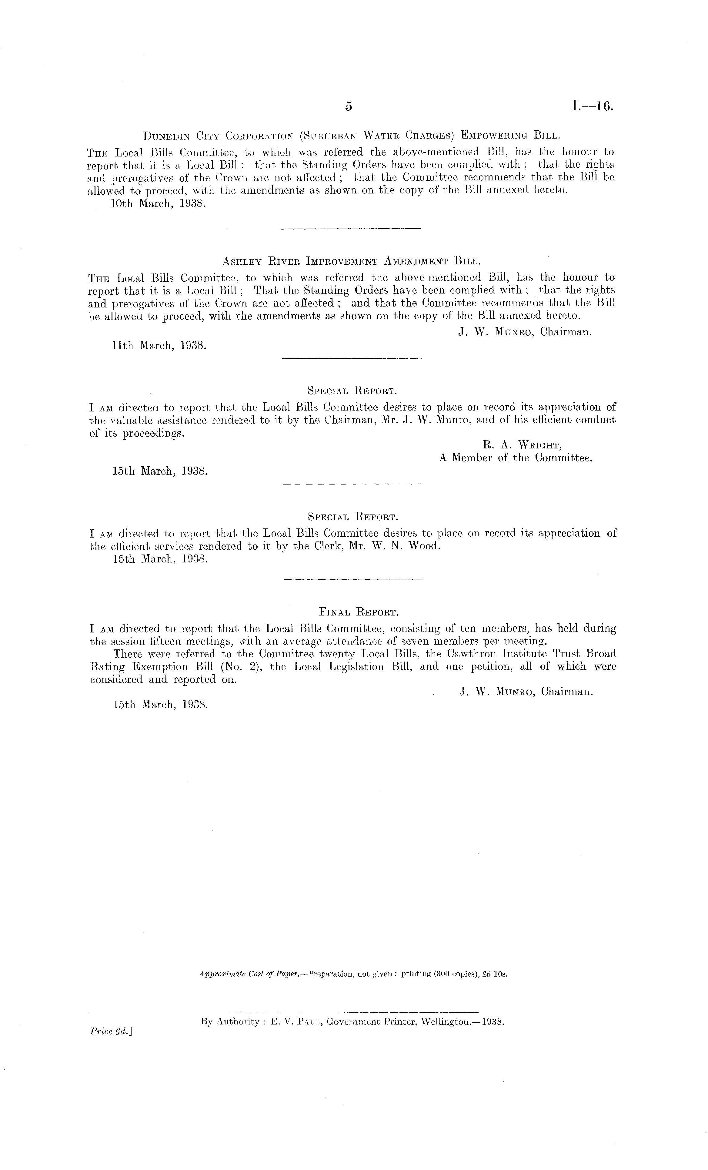 Special Report. I am directed to report that the Local Bills Committee desires to place on record its appreciation of the valuable assistance rendered to it by the Chairman, Mr. J. W. Munro, and of his efficient conduct of its proceedings. R. A. Wright, A Member of the Committee. 15th March, 1938.