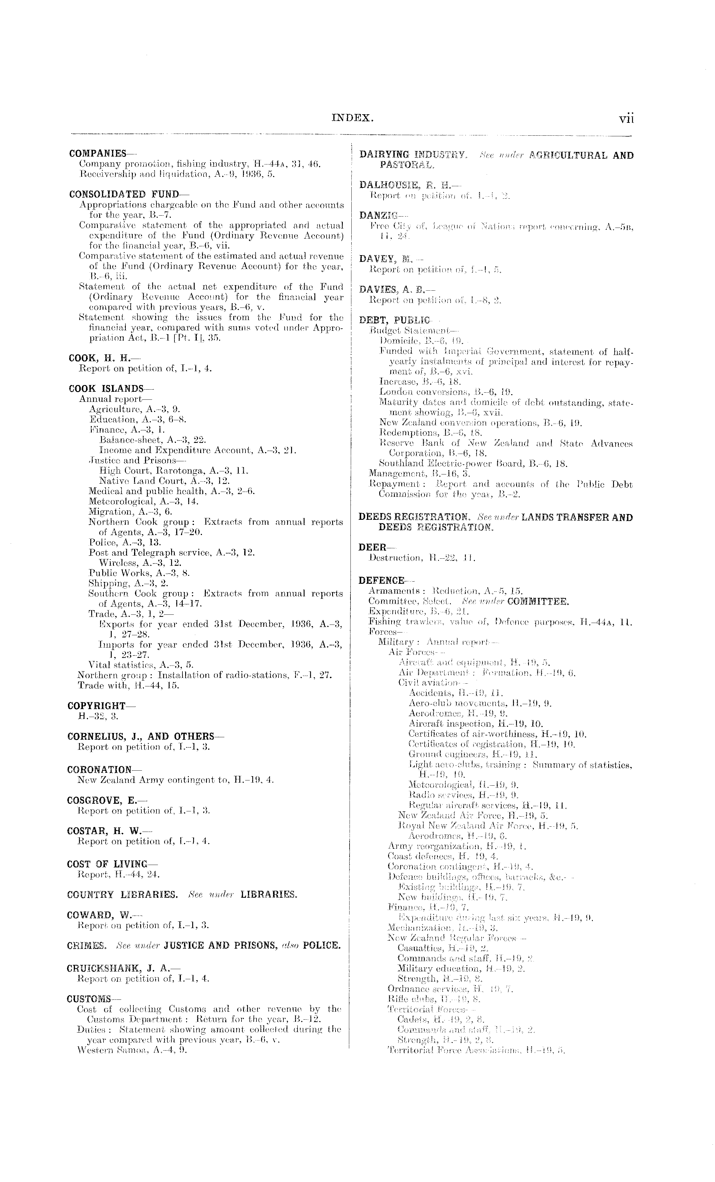 DAIRYING INDUSTRY. See under AGRICULTURAL AND PASTORAL. DALHOUSIE, R. H.— Report on petition of, 1.-l, "2, DANZIG— Free City of. League of Nations report concerning, A.-sb, 11, 24. DAVEY, M.— Report on petition of, 1.-l, 5. DAVIES, A. B.t— Report on petition of, 1.-8, 2. DEBT, PUBLIC— Budget Statement — Domicile, 8.-6, 19. Funded with Imperial Government, statement of halfyearly instalments of principal and interest for repayment of, 8.-6, xvi. Increase, 8.-6, 18. London conversions, 8.-6, 19. Maturity dates and domicile of debt outstanding, statement showing, 8.-6, xvii. New Zealand conversion operations, 8.-6, 19. Redemptions, 8.-6, 18. Reserve Bank of New Zealand and State Advances Corporation, 8.-6, 18. Southland Electric-power Board, 8.-6, 18. Management, 8.-16, 3. Repayment: Report and accounts of the Public Debt Commission for the year, 8.-2. DEEDS REGISTRATION. See under LANDS TRANSFER AND DEEDS REGISTRATION. DEER - Destruction, H.-22, 11. DEFENCE— Armaments : Reduction, A.-5, 15. Committee, Select. See under COMMITTEE. Expenditure, 8.-6, 21. Fishing trawlers, value of, Defence purposes, H.-44a, 11. Forces — Military : Annual report — Air Forces- — Aircraft and equipment, H.-19, 5. Air Department: Formation, fl.-l 9, 6. Civil aviation— Accidents, H.-19, 11. Aero-club movements, H.-19, 9. Aerodromes, H.-19, 9. Aircraft inspection, H.-19, 10. Certificates of air-worthiness, H.-19, 10. Certificates of registration, H.-19, 10. Ground engineers, H.-19, 11. Light aero-clubs, training : Summary of statistics, H.-19, 10. Meteorological, H.-19, 9. Radio services, H.-19, 9. Regular aircraft services, H.-19, 11. New Zealand Air Force, H.-19, 5. Royal New Zealand Air Force, H.-19, 5. Aerodromes, H.-19, 6. Army reorganization, H.-19, 1. Coast defences, H.-19, 4. Coronation contingent, 11. -19. 4. Defence buildings, offices, barracks, &c. — Existing buildings, H.-19, 7. New buildings, H.-19, 7. Finance, H.-19, 7. Expenditure during last six years, 11.-19, 9. Mechanization, H.-19, 3. New Zealand Regular Forces — Casualties, H.-19, 2. Commands and staff, H.-19, 2. Military education, H.-19, 2. Strength, H.-19, 8. Ordnance services, H.-19, 7. Rifle clubs, H.-19, 8. Territorial Forces — Cadets, H.-19, 2, 8. Commands and staff, H.—l9, 2. Strength, H.-19, 2, 8. Territorial Force Associations, H.-19, 5,