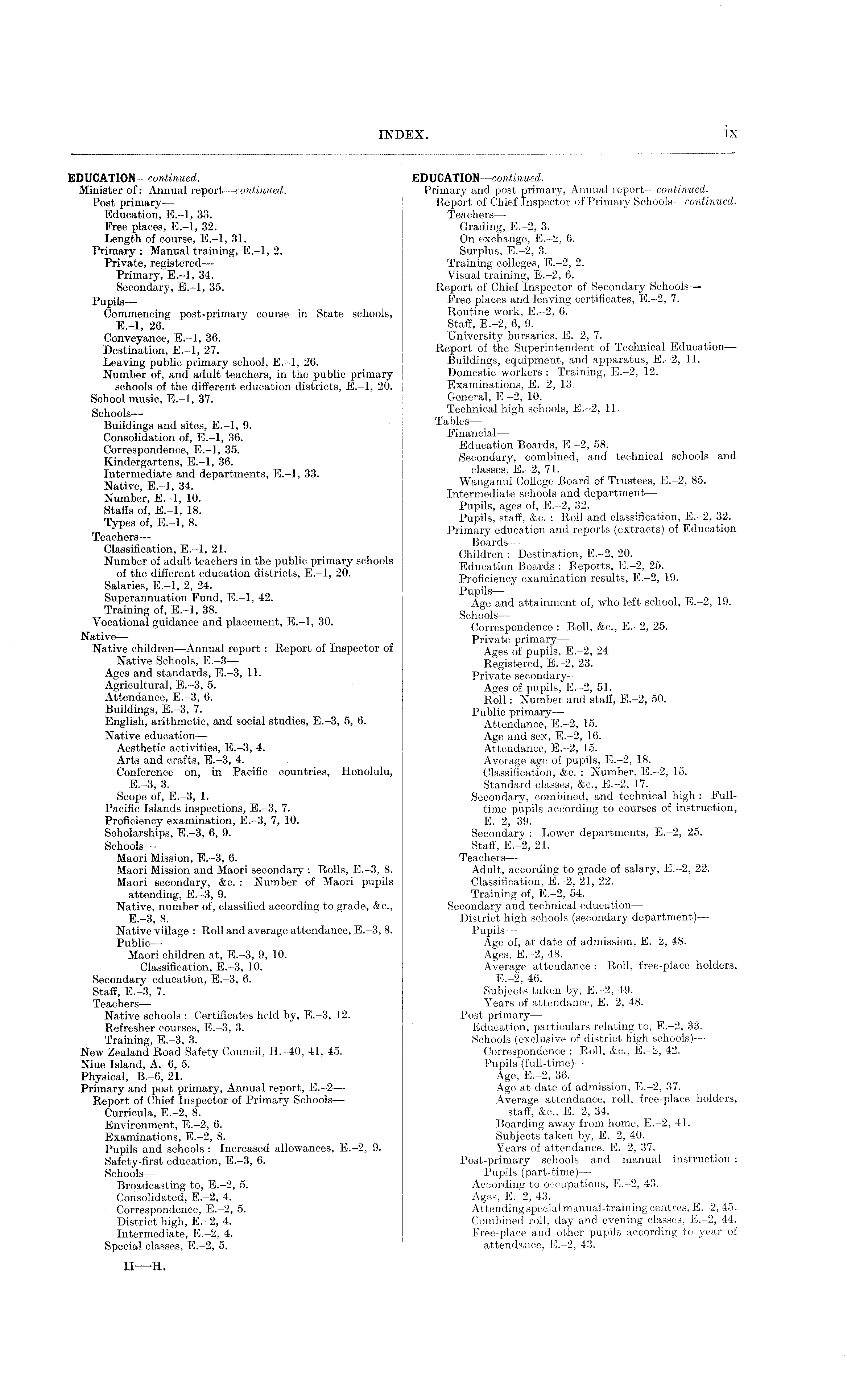 EDUCATION —continued. Primary and post primary, Annual report —continued. Report of Chief Inspector of Primary Schools —continued. Teachers — Grading, E.-2, 3. On exchange, E.-ss, 6. Surplus, E.-2, 3. Training colleges, E.-2, 2. Visual training, E.-2, 6. Report of Chief Inspector of Secondary Schools— Free places and leaving certificates, E.-2, 7. Routine work, E.-2, 6. Staff, E.-2, 6, 9. University bursaries, E.-2, 7. Report of the Superintendent of Technical Education— Buildings, equipment, and apparatus, E.-2, 11. Domestic workers : Training, E.-2, 12. Examinations, E.—2, 13. General, E -2, 10. Technical high schools, E.-2, 11. Tables— Financial — Education Boards, E -2, 58. Secondary, combined, and technical schools and classes, E.-2, 71. Wanganui College Board of Trustees, E.-2, 85. Intermediate schools and department— Pupils, ages of, E.-2, 32. Pupils, staff, &c. : Roll and classification, E.-2, 32. Primary education and reports (extracts) of Education Boards — Children : Destination, E.-2, 20. Education Boards : Reports, E.-2, 25. Proficiency examination results, E.-2, 19. Pupils— Age and attainment of, who left school, E.-2, 19. Schools — Correspondence : Roll, &c., E.-2, 25. Private primary— Ages of pupils, E.-2, 24. Registered, E.-2, 23. Private secondary— Ages of pupils, E.-2, 51. Roll: Number and staff, E.-2, 50. Public primary— Attendance, E.-2, 15. Age and sex, E.-2, 16. Attendance, E.-2, 15. Average age of pupils, E.-2, 18. Classification, &c. : Number, E.-2, 15. Standard classes, &c., E.-2, 17. Secondary, combined, and technical high : Fulltime pupils according to courses of instruction, E.-2, 39. Secondary : Lower departments, E..-2, 25. Staff, E.-2, 21. Teachers — Adult, according to grade of salary, E.-2, 22. Classification, E.-2, 21, 22. Training of, E.-2, 54. Secondary and technical education — District high schools (secondary department)— Pupils — Age of, at date of admission, E.-2, 48. Ages, E.—2, 48. Average attendance : Roll, free-place holders, E.-2, 46. Subjects taken by, E.-2, 49. Years of attendance, E.-2, 48. Post primary— Education, particulars relating to, E.-2, 33. Schools (exclusive of district high schools) — Correspondence : Roll, &c., E.-2, 42. Pupils (full-time) — Age, E.-2, 36. Age at date of admission, E.-2, 37. Average attendance, roll, free-place holders, staff, &c., E.-2, 34. Boarding away from home, E.-2, 41. Subjects taken by, E.-2, 40. Years of attendance, E.-2, 37. Post-primary schools and manual instruction : Pupils (part-time)— According to occupations, E.-2, 43. Ages, E.-2, 43. Attending special manual-training centres, E.-2,45. Combined roll, day and evening classes, E.-2, 44. Free-place and other pupils according to year of attendance, E.-2, 43.
