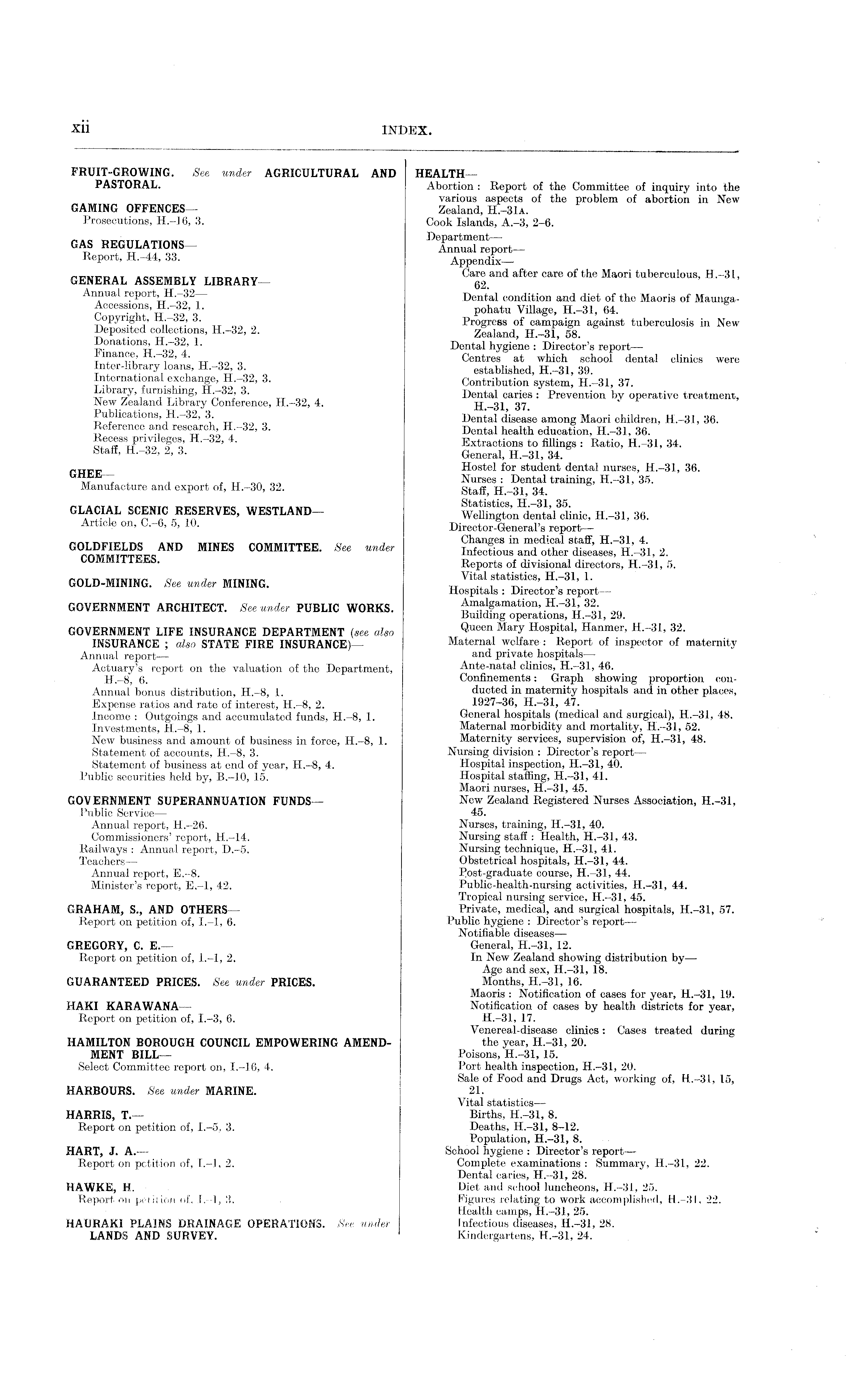 FRUIT-GROWING. See under AGRICULTURAL AND PASTORAL. GAMING OFFENCES— Prosecutions, H.-16, 3. GAS REGULATIONS— Report, H.-44, 33. GENERAL ASSEMBLY LIBRARY— Annual report, H.-32— Accessions, H.-32, 1. Copyright, H.-32, 3. Deposited collections, H.-32, 2. Donations, H.-32, 1. Finance, H.-32, 4. Inter-library loans, H.-32, 3. International exchange, H.-32, 3. Library, furnishing, H.-32, 3. New Zealand Library Conference, H.-32, 4. Publications, H.-32, 3. Reference and research, 11.-32, 3. Recess privileges, H.-32, 4. Staff, H.-32, 2, 3. GHEE— Manufacture and export of, H.-30, 32. GLACIAL SCENIC RESERVES, WESTLAND— Article on, C.-6, 5, 10. GOLDFIELDS AND MINES COMMITTEE. See under COMMITTEES. GOLD-MINING. See under MINING. GOVERNMENT ARCHITECT. See under PUBLIC WORKS. GOVERNMENT LIFE INSURANCE DEPARTMENT (see also INSURANCE ; also STATE FIRE INSURANCE)— Annual report — Actuary's report on the valuation of the Department, H.-8, 6. Annual bonus distribution, H.-8, 1. Expense ratios and rate of interest, H.-8, 2. Income : Outgoings and accumulated funds, H.-8, 1. Investments, A. -8, 1. New business and amount of business in force, H.-8, 1. Statement of accounts, H.-8, 3. Statement of business at end of year, H.-8, 4. Public securities held by, 8.-10, 15. GOVERNMENT SUPERANNUATION FUNDS— Public Service— Annual report, H.-26. Commissioners' report, H.-14. Railways : Annual report, D.-5. Teachers — Annual report, E.-8. Minister's report, E.-l, 42. GRAHAM, S., AND OTHERS— Report on petition of, I. 1, 6. GREGORY, C. E.— Report on petition of, 1.-l, 2. GUARANTEED PRICES. See under PRICES. HAKI KARAWANA— Report on petition of, 1.-3, 6. HAMILTON BOROUGH COUNCIL EMPOWERING AMENDMENT BILL Select Committee report on, 1.-16, 4. HARBOURS. See under MARINE. HARRIS, T.— Report on petition of, 1.-5, 3. HART, J. A.— Report on petition of, 1.-l, 2. HAWKE, H. Report on petition of, 1.-l, 3. HAUKAKI PLAINS DRAINAGE OPERATIONS. See under LANDS AND SURVEY.