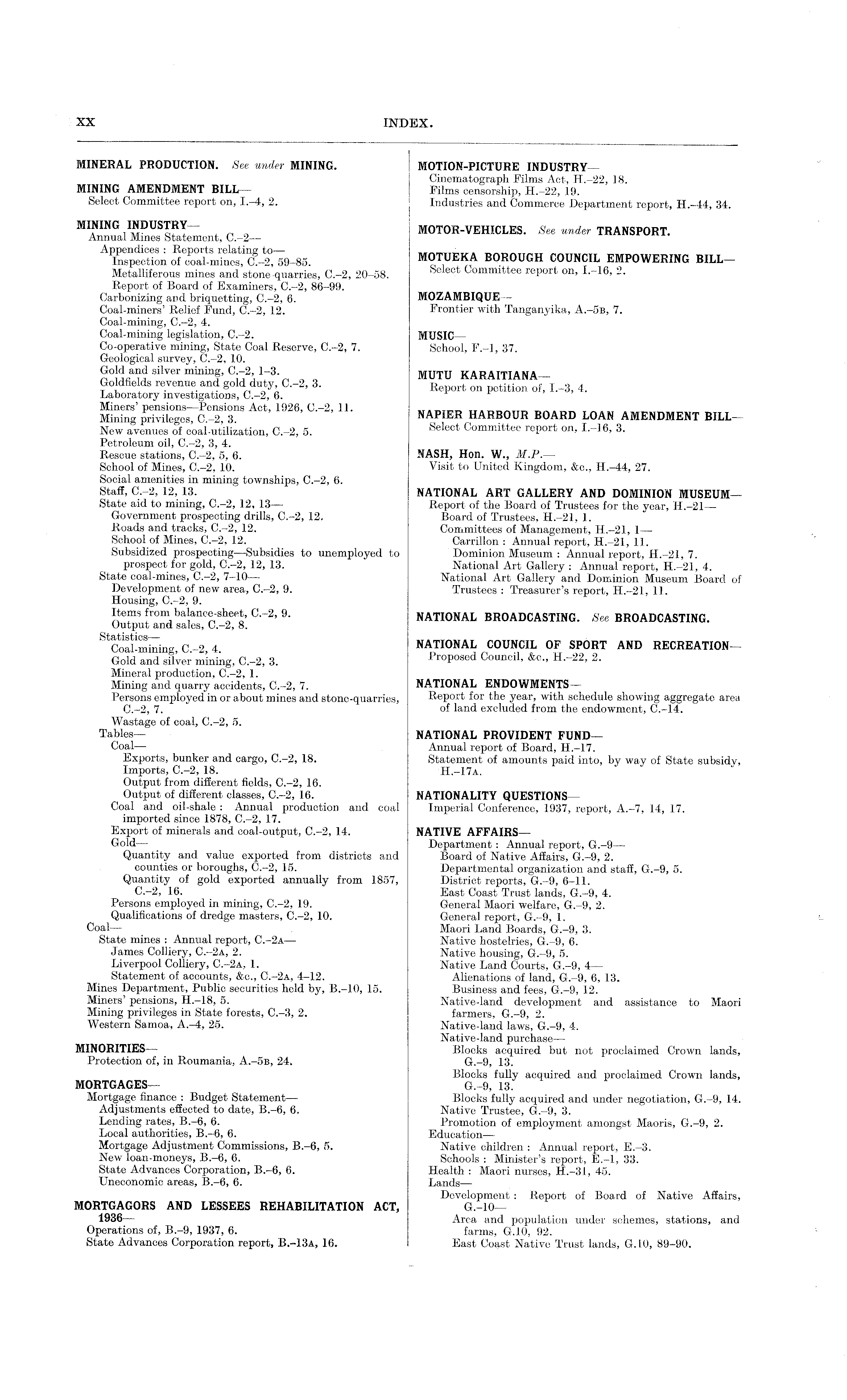 MINERAL PRODUCTION. See under MINING. MINING AMENDMENT BILL— Select Committee report on, 1.-4, 2. MINING INDUSTRY— Annual Mines Statement, C.-2— Appendices : Reports relating to — Inspection of coal-mines, C.-2, 59-83. Metalliferous mines and stone quarries, C.-2, 20-58. Report of Board of Examiners, C.-2, 86-99. Carbonizing and briquetting, C.-2, 6. Coal-miners' Relief Fund, C.-2, 12. Coal-mining, C.-2, 4. Coal-mining legislation, C.-2. Co-operative mining, State Coal Reserve, C.-2, 7. Geological survey, C.-2, 10. Gold and silver mining, C.-2, 1-3. Goldfields revenue and gold duty, C.-2, 3. Laboratory investigations, C.-2, 6. Miners' pensions—Pensions Act, 1926, C.-2, 11. Mining privileges, C.-2, 3. New avenues of coal-utilization, C.-2, 5. Petroleum oil, C.-2, 3, 4. Rescue stations, C.-2, 5, 6. School of Mines, C.-2, 10. Social amenities in mining townships, C.-2, 6. Staff, C.-2, 12, 13. State aid to mining, C.-2, 12, 13 — Government prospecting drills, C.-2, 12. Roads and tracks, C.-2, 12. School of Mines, C.-2, 12. Subsidized prospecting—Subsidies to unemployed to prospect for gold, C.-2, 12, 13. State coal-mines, C.-2, 7-10— Development of new area, C.-2, 9. Housing, C.-2, 9. Items from balance-sheet, C.-2, 9. Output and sales, C.-2, 8. Statistics — Coal-mining, C.-2, 4. Gold and silver mining, C.-2, 3. Mineral production, C.-2, 1. Mining and quarry accidents, C.-2, 7. Persons employed in or about mines and stone-quarries, C.-2, 7. Wastage of coal, C.-2, 5. Tables— CoalExports, bunker and cargo, C.-2, 18. Imports, C.-2, 18. Output from different fields, C.-2, 16. Output of different classes, C.-2, 16. Coal and oil-shale : Annual production and coal imported since 1878, C.-2, 17. Export of minerals and coal-output, C.-2, 14. GoldQuantity and value exported from districts and counties or boroughs, C.-2, 15. Quantity of gold exported annually from 1857, C.-2, 16. Persons employed in mining, C.-2, 19. Qualifications of dredge masters, C.-2, 10. Coal— State mines : Annual report, C.-2a— James Colliery, C.-2a, 2. Liverpool Colliery, C.-2a, 1. Statement of accounts, &c., C.-2a, 4-12. Mines Department, Public securities held by, 8.-10, 15. Miners' pensions, H.-18, 5. Mining privileges in State forests, C.-3, 2. Western Samoa, A.-4, 25. MINORITIES— Protection of, in Roumania, A.-sb, 24. MORTGAGES— Mortgage finance : Budget Statement— Adjustments effected to date, 8.-6, 6. Lending rates, 8.-6, 6. Local authorities, 8.-6, 6. Mortgage Adjustment Commissions, 8.-6, 5. New loan-moneys, 8.-6, 6. State Advances Corporation, 8.-6, 6. Uneconomic areas, 8.-6, 6. MORTGAGORS AND LESSEES REHABILITATION ACT, 1936— Operations of, 8.-9, 1937, 6. State Advances Corporation report, 8.-13 a, 16.