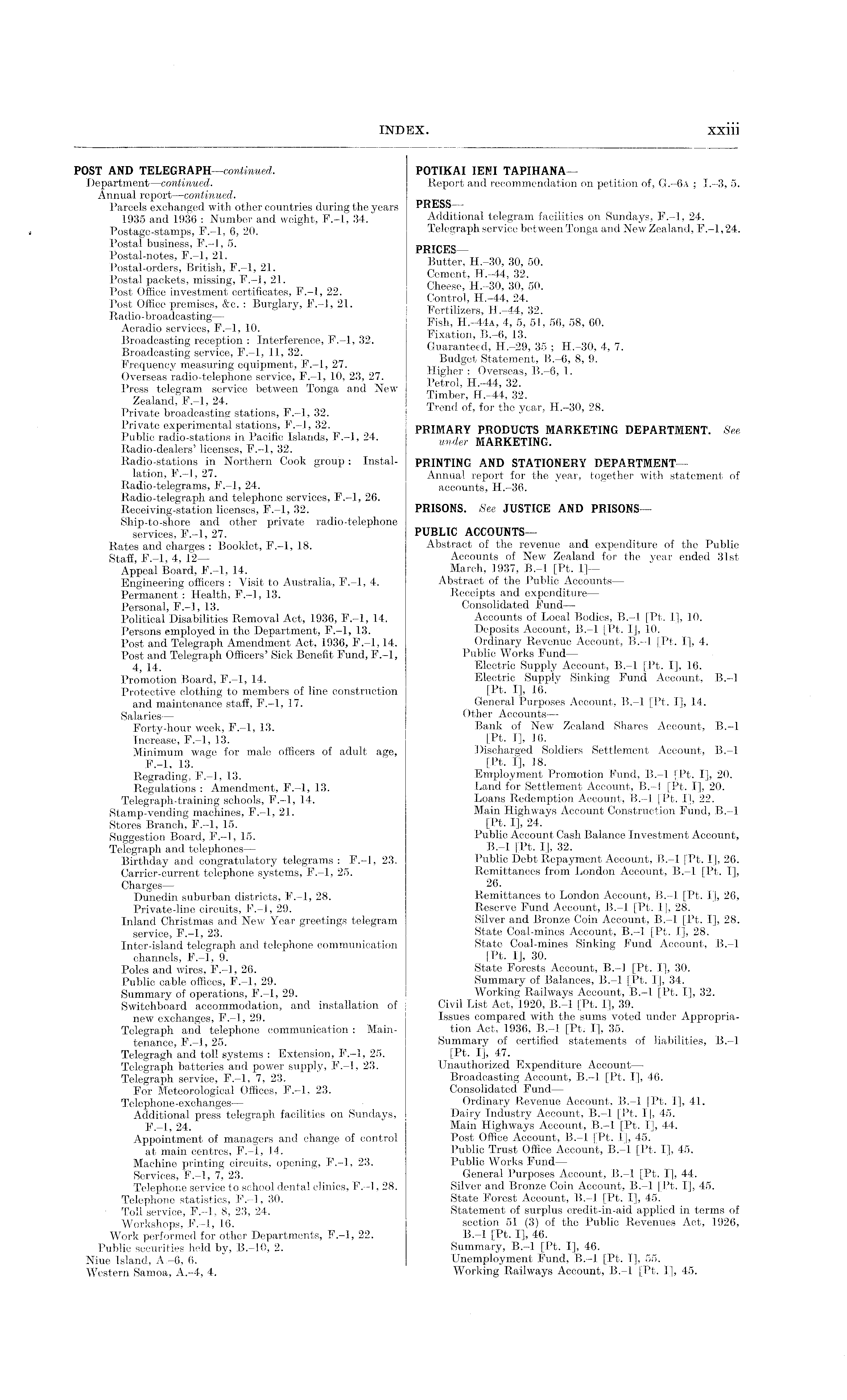 POTIKAI lENI TAPIHANA — Report and recommendation on petition of, 0.-6 A ; Ī.-3, 5. PRESS — Additional telegram facilities on Sundays, F.-l, 24. Telegraph service between Tonga and New Zealand, F. I, '21. PRICES— Butter, H.-30, 30, 50. Cement, H.-44, 32. Cheese, H.-30, 30, 50. Control, H.-44, 24. Fertilizers, H.-44, 32. Fish, H.-44A, 4, 5, 51, 56, 58, 60. Fixation, 13.-6, 13. Guaranteed, H.-29, 35 ; H.-30, 4, 7. Budget Statement, 8.-6, 8, 9. Higher : Overseas, 8.-6, 1. Petrol, H.-44, 32. Timber, H.-44, 32. Trend of, for the year, H.-30, 28. PRIMARY PRODUCTS MARKETING DEPARTMENT. See under MARKETING. PRINTING AND STATIONERY DEPARTMENT— Annual report for the year, together with statement of accounts, H.-36. PRISONS. See JUSTICE AND PRISONSPUBLIC ACCOUNTS— Abstract of the revenue and expenditure of the Public Accounts of New Zealand for the year ended 31st March, 1937, 8.-l [Pt. I] — Abstract of the Public Accounts— Receipts and expenditure— Consolidated Fund— Accounts of Local Bodies, 8.-l [Pt. I], 10. Deposits Account, 8.-l [Pt. I], 10. Ordinary Revenue Account, 8.-l [Pt. I], 4. Public Works Fund— Electric Supply Account, 8.-l [Pt. I], 16. Electric Supply Sinking Fund Account, 8.-l [Pt. I], 16. General Purposes Account, 8.-l [Pt. I], 14. Other Accounts— Bank of New Zealand Shares Account, 8.-l [Pt. I], 16. Discharged Soldiers Settlement Account, 8.-l [Pt. I], 18. Employment Promotion Fund, 8.-l [Pt. I], 20. Land for Settlement Account, 8.-l [Pt. I], 20. Loans Redemption Account, 8.-l [Pt. I], 22. Main Highways Account Construction Fund, 8.-l [Pt. I], 24. Public Account Cash Balance Investment Account, 8.-l [Pt. I], 32. Public Debt Repayment Account, 8.-l [Pt. I], 26. Remittances from London Account, 8.-l [Pt. I], 26. Remittances to London Account, 8.-l [Pt. I], 26, Reserve Fund Account, 8.-l [Pt. I], 28. Silver and Bronze Coin Account, 8.-l [Pt. I], 28. State Coal-mines Account, 8.-l [Pt. I], 28. State Coal-mines Sinking Fund Account, 8.-l [Pt. I], 30. State Forests Account, 8.-l [Pt. I], 30. Summary of Balances, 8.-l [Pt. I], 34. Working Railways Account, 8.-l [Pt. I], 32. Civil List Act,1920, 8.-l [Pt. I], 39. Issues compared with the sums voted under Appropriation Act, 1936, 8.-l [Pt. I], 35. Summary of certified statements of liabilities, 8.-l [Pt. I], 47. Unauthorized Expenditure Account — Broadcasting Account, 8.-l [Pt. I], 46. Consolidated Fund— Ordinary Revenue Account, 8.-l [Pt. I], 41. Dairy Industry Account, 8.-l [Pt. I], 45. Main Highways Account, 8.-l [Pt. I], 44. Post Office Account, 8.-l [Pt. I], 45. Public Trust Office Account, 8.-l [Pt. I], 45. Public Works Fund— General Purposes Account, 8.-l [Pt. I], 44. Silver and Bronze Coin Account, 8.-l [Pt. I], 45. State Forest Account, 8.-l [Pt. I], 45. Statement of surplus credit-in-aid applied in terms of section 51 (3) of the Public Revenues Act, 1926, 8.-l [Pt. I], 46. Summary, 8.-l [Pt. I], 46. Unemployment Fund, 13.-1 [Pt. I], 55. Working Railways Account, 8.-l [Pt. I], 45.