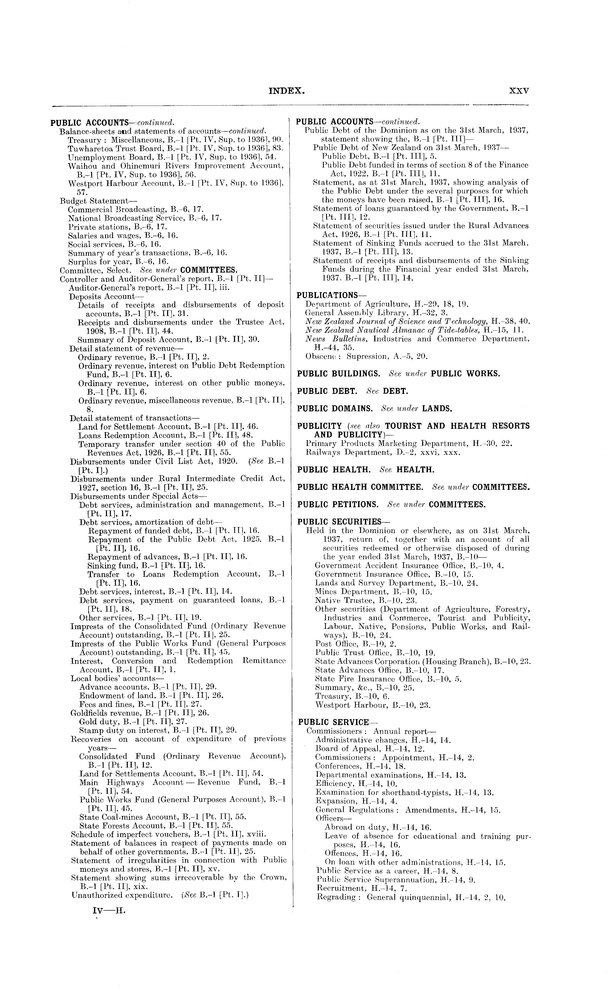 ' PUBLIC ACCOUNTS —continued. Public Debt of the Dominion as on the 31st March, 1937, statement showing the, 8.-l [Pt. 11l] — Public Debt of New Zealand on 31st March, 1937— Public Debt, 8.-l [Pt. Ill], 5. Public Debt funded in terms of section 8 of the Finance Act, 1922, 8.-l [Pt. Ill], 11. Statement, as at 31st March, 1937, showing analysis of the Public Debt under the several purposes for which the moneys have been raised, 8.-l [Pt. Ill], 16. Statement of loans guaranteed by the Government, 8.-l [Pt. Ill], 12. Statement of securities issued under the Rural Advances Act, 1926, 8.-l [Pt. Ill], 11. Statement of Sinking Funds accrued to the 31st March, 1937, 8.-l [Pt. Ill], 13. Statement of receipts and disbursements of the Sinking Funds during the Financial year ended 31st March, 1937. 8.-l [Pt. Ill], 14. PUBLICATIONS— Department of Agriculture, H.-29, 18, 19. General Assembly Library, H.-32, 3. New Zealand Journal of Science and Technology, H.-38, 40. New Zealand Nautical Almanac of Tide-tables, H.-15, 11. News Bulletins, Industries and Commerce Department, H.-44, 35. Obscene : Supression, A.-5, 20. PUBLIC BUILDINGS. See under PUBLIC WORKS. PUBLIC DEBT. See DEBT. PUBLIC DOMAINS. See under LANDS. PUBLICITY (see also TOURIST AND HEALTH RESORTS AND PUBLICITY)— Primary Products Marketing Department, H. -30, 22. Railways Department, D.-2, xxvi, xxx. PUBLIC HEALTH. See HEALTH. PUBLIC HEALTH COMMITTEE. See under COMMITTEES. PUBLIC PETITIONS. See under COMMITTEES. PUBLIC SECURITIES— Held in the Dominion or elsewhere, as on 31st March, 1937, return of, together with an account of all securities redeemed or otherwise disposed of during the year ended 31st March, 1937, 8.-10 — Government Accident Insurance Office, 8.-10, 4. Government Insurance Office, 8.-10, 15. Lands and Survey Department, 8.-10, 24. Mines Department, B. 10, 15. Native Trustee, 8.-10, 23. Other securities (Department of Agriculture, Forestry, Industries and Commerce, Tourist and Publicity, Labour, Native, Pensions, Public Works, and Railways), 8.-10, 24. Post Office, 8.-10, 2. Public Trust Office, 8.-10, 19. State Advances Corporation (Housing Branch), 8.-10, 23. State Advances Office, 8.-10, 17. State Fire Insurance Office, 8.-10, 5. Summary, &c., 8.-10, 25. Treasury, 8.-10, 6. Westport Harbour, 8.-10, 23. PUBLIC SERVICE— Commissioners : Annual report — Administrative changes, H.-14, 14. Board of Appeal, H.-14, 12. Commissioners : Appointment, H.-14, 2. Conferences, H.-14, 18. Departmental examinations, H.-14, 13. Efficiency, H.-14, 10. Examination for shorthand-typists, 11. 14, 13. Expansion, H.-14, 4. General Regulations : Amendments, H.-14, 15. Officers — Abroad on duty, H.-14, 16. Leave of absence for educational and training purposes, H.-14, 16. Offences, H.-14, 16. On loan with other administrations, H.-14, 15. Public Service as a career, H.-14, 8. Public Service Superannuation, H.—l4, 9. Recruitment, H.-14, 7. Regrading : General quinquennial, H.-14, 2, 10.
