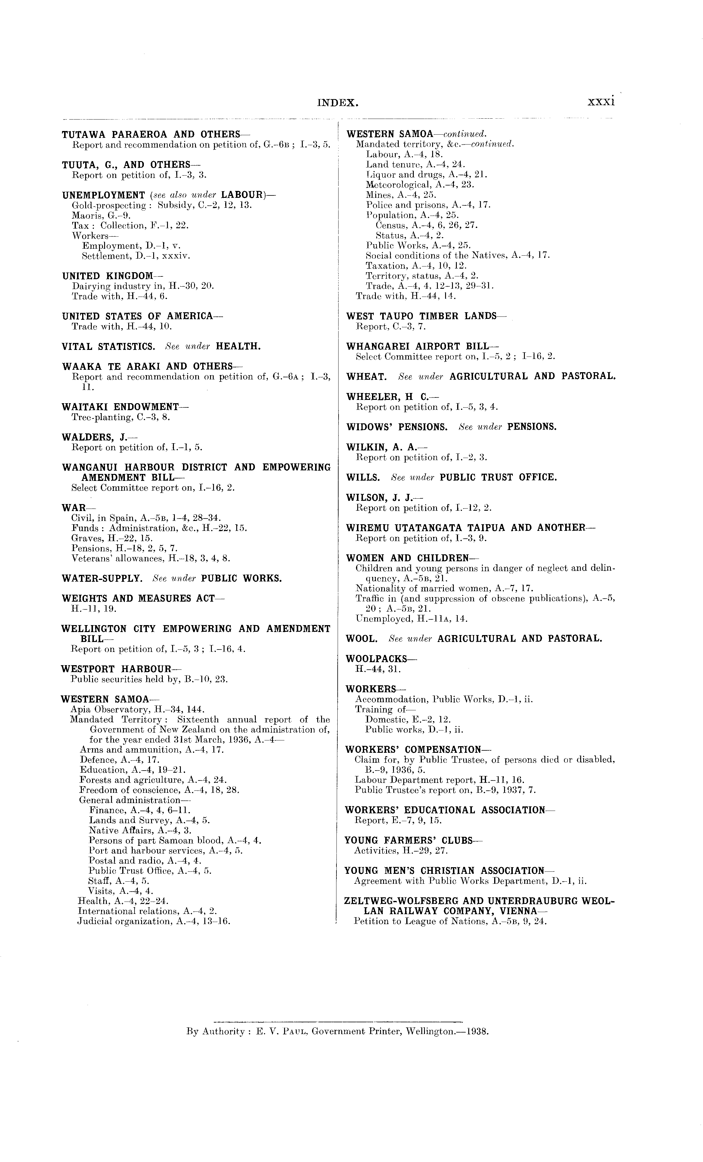 WESTERN SAMOA —continued. Mandated territory, &c. —continued. Labour, A.-4, 18. Land tenure, A.-4, 24. Liquor and drugs, A.-4, 21. Meteorological, A.-4, 23. Mines, A.-4, 25. Police and prisons, A.-4, 17. Population, A.-4, 25. Census, A.-4, 6, 26, 27. Status, A.-4, 2. Public Works, A.-4, 25. Social conditions of the Natives, A.-4, 17. Taxation, A.-4, 10, 12. Territory, status, A.—4, 2. Trade, A.-4, 4, 12-13, 29-31. Trade with, H.-44, 14. WEST TAUPO TIMBER LANDS— Report, C.-3, 7. WHANGAREI AIRPORT BILL— Select Committee report on, 1.-5, 2 ; 1-16, 2. WHEAT. See under AGRICULTURAL AND PASTORAL. WHEELER, H C.— Report on petition of, 1.-5, 3, 4. WIDOWS' PENSIONS. See under PENSIONS. WILKIN, A. A.— Report on petition of, 1.-2, 3. WILLS. See under PUBLIC TRUST OFFICE. WILSON, J. J.— Report on petition of, 1.-12, 2. WIREMU UTATANGATA TAIPUA AND ANOTHER— Report on petition of, 1.-3, 9. WOMEN AND CHILDREN— Children and young persons in danger of neglect and delinquency, A.-sb, 21. Nationality of married women, A.-7, 17. Traffic in (and suppression of obscene publications), A.-5, 20 ; A.-sb, 21. Unemployed, H.-11a, 14. WOOL. See under AGRICULTURAL AND PASTORAL. WOOLPACKS— H.-44, 31. WORKERS— Accommodation, Public Works, D.-l, ii. Training of — Domestic, E.-2, 12. Public works, D.-l, ii. WORKERS' COMPENSATION— Claim for, by Public Trustee, of persons died or disabled, 8.-9, 1936, 5. Labour Department report, H.—ll, 16. Public Trustee's report on, 8.-9, 1937, 7. WORKERS' EDUCATIONAL ASSOCIATION— Report, E.-7, 9, 15. YOUNG FARMERS' CLUBS— Activities, H.-29, 27. YOUNG MEN'S CHRISTIAN ASSOCIATION— Agreement with Public Works Department, D.-l, ii. ZELTWEG-WOLFSBERG AND UNTERDRAUBURG WEOLLAN RAILWAY COMPANY, VIENNA— ! Petition to League of Nations, A.-sb, 9, 24.