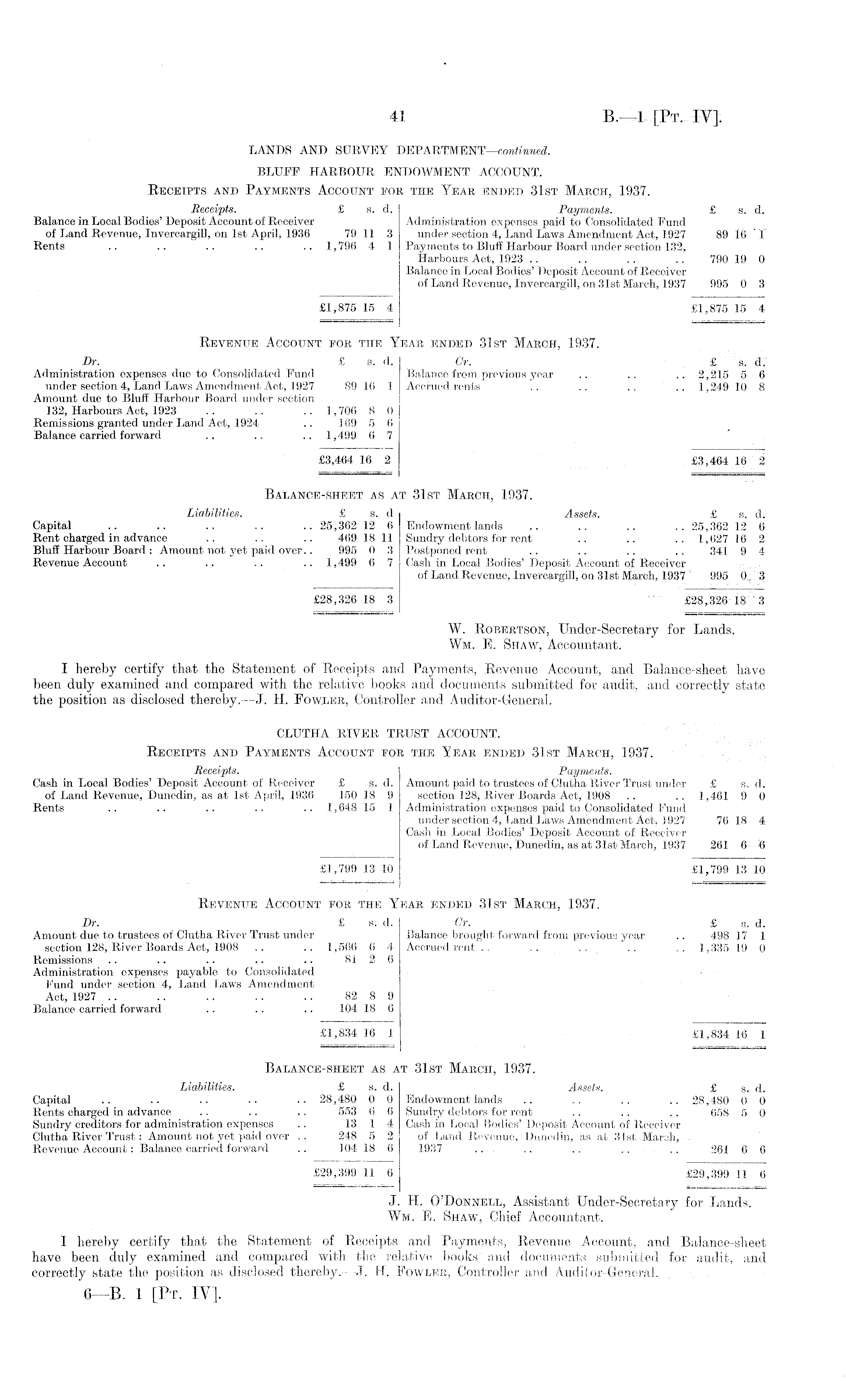 LANDS AND SURVEY DEPARTMENT—continued. BLUFF HARBOUR ENDOWMENT ACCOUNT. Receipts and Payments Account foe the Year ended 31st March, 1937. Receipts. £ s. d. Payments. £ s. d. Balance in Local Bodies' Deposit Account of Receiver Administration expenses paid to Consolidated Fund of Land Revenue, Invercargill, on Ist April, 1936 79 11 3 under section 4, Land Laws Amendment Act, 1927 89 16 1 Rents .. .. .. .. .. 1,796 4 1 Payments to Bluff Harbour Board under section 132, Harbours Act, 1923 .. .. .. .. 790 19 0 Balance in Local Bodies' Deposit Account of Receiver of Land Revenue, Invercargill, on 31st March, 1937 995 0 3 £1,875 15 4 £1,875 15 4 Revenue Account for the Year ended 31st March, 1937. Dr. £ s. d. Gr. £ s. d. Administration expenses due to Consolidated Fund Balance from previous year .. .. ~ 2,215 5 6 under section 4, Land Laws Amendment Act, 1927 89 16 1 Accrued rents .. .. .. .. 1,249 10 8 Amount due to Bluff Harbour Board under section 132, Harbours Act, 1923 .. .. .. 1,706 8 0 Remissions granted under Land Act, 1924 .. 169 5 6 Balance carried forward .. .. 1,499 0 7 £3,464 16 2 £3,464 16 2 Balance-sheet as at 31st March, 1937. Liabilities. £ s. d Assets. £ s. d. Capital .. .. .. .. .. 25-,362 12 6 Endowment lands .. .. .. .. 25,362 12 6 Rent charged in advance .. .. ... : 469 18 11 Sundry debtors for rent .. .. .. 1,627 16 2 Bluff Harbour Board: Amount not yet paid over.. 995 0 3 Postponed rent .. .. .. .. 341 9 4 Revenue Account .. .. .. 1, 499 6 7 Cash in Local Bodies' Deposit Account of Receiver of Land Revenue, Invercargill, on 31st March, 1937 ' 995 o.;\ :! £28,326 18 3 £28,326 18 ' 3 W. Robertson, Under-Secretary for Lands. Wi. E. Shaw, Accountant. I hereby certify that the Statement of Receipts and Payments, Revenue Account, and Balance-sheet have been duly examined and compared with the relative bqoks and documents submitted for audit, and correctly state the position as disclosed thereby. —J. H. Eowler, Controller and Auditor-General. CLUTHA RIVER TRUST ACCOUNT. Receipts and Payments Account for the Year ended 31st March, 1937. Receipts. . Payments. Cash in Local Bodies' Deposit Account of Receiver £ s. d. Amount paid to trustees of Clutha River Trust under £ s. d. of Land Revenue, Dunedin, as at Ist April, 1936 150 18 9 section 128, River Boards Act, 1908 .. .. 1,461 9 0 Rents .. .. .. .. .. 1,648 15 1. Administration expenses paid to Consolidated Fund under section 4, Land Laws Amendment Act, 1927 76 18 4 Cash in Local Bodies' Deposit Account of Receiver of Land Revenue, Dunedin, as at 31str March, 1937 261 6 : 6 £1,799 13 10 £1,799 13 10 Revenue Account for the Year ended 31st March, 1937. Dr. £ s. d. Or. £ s. d. Amount due to trustees of Clutha River Trust under Balance brought forward from previous year .. 498 17 1 section 128, River Boards Act, 1908 .. .. 1,566 6 4 Accrued rent .. .. .. .. .. 1,335 19 0 Remissions .. .. .. .. .. 81 2 6 Administration expenses payable -to Consolidated • Fund under section 4, Land Laws Amendment Act, 1927 .. .. .. .. 82 8 9 Balance carried forward .. .. .. 104 18 6 £1,834 16 1 £1,834 16 1 Balance-sheet as at 31st March, 1937. Liabilities. £ s. d. Assets. - £ s. d. Capital .. .. .. .. ..28,48000 Endowment lands .. .. .. ..28,48000 Rents charged in advance .. .. .. 553 6 6 Sundry debtors for rent .. .. .. 658 5 0 Sundry creditors for administration expenses .. 13 1 4 Cash in Local Bodies' Deposit Account of Receiver Clutha River Trust: Amount not yet paid over .. 248 5 2 of Land Revenue, Dunedin, as at 31st March, Revenue Account: Balance carried forward .. 104 18 6 1937 .. .. .. .. ... 261 6 6 £29,399 11 6 £29,399 11 6 J. H. O'Donnell, Assistant Under-Secretary for Lands. Wm. E. Shaw, Chief Accountant. I hereby certify that the Statement of Receipts and Payments, Revenue Account, and Balance-sheet have been duly examined and compared with the relative books and documents submitted for audit, and correctly state the position as disclosed thereby.—J. H. Fowler, Controller and Auditor-General. 6—B. 1 I PT. IV].