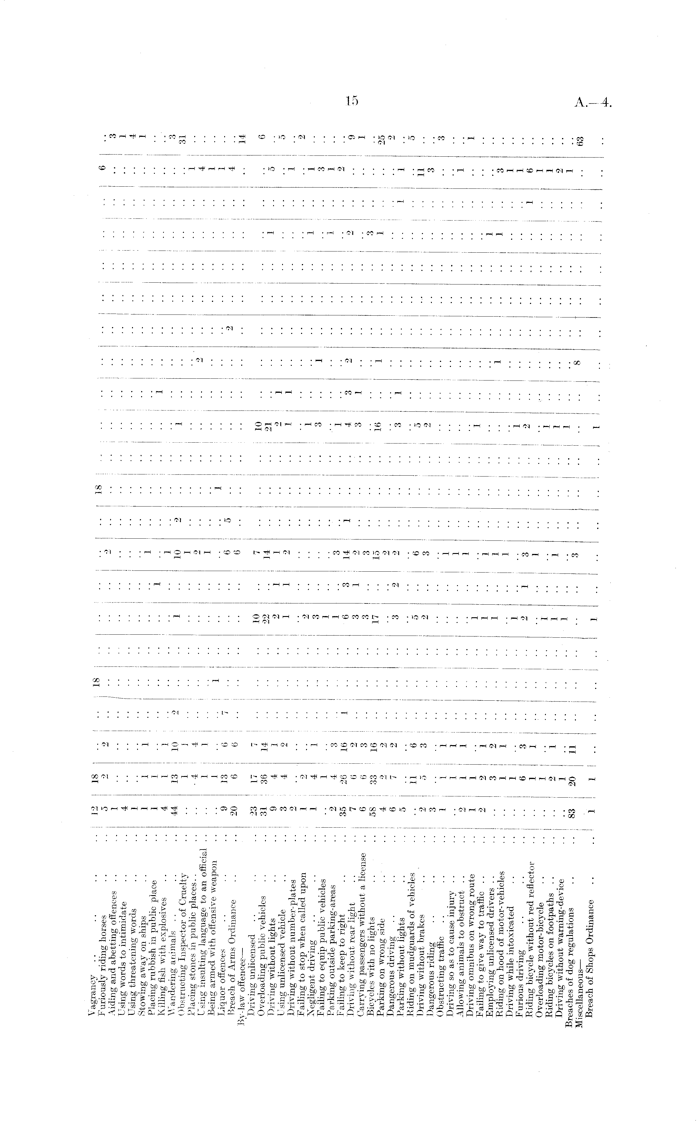 Vagrancy .. .. .. .. I 12 18 .... I 18 , s Furiously riding horses .. .. 5 2 2 I | "n " J | "" j ** j •• •• j •• 6 Aiding and abetting offences .. .. 1 .. .. j ' ' ' '' " " '' "' | " | '' j '" ■ ■ ■ • | ■ • ■ • j ■ • • • 3 Using words to intimidate .. .. 4 .. .. .' ' ' " '' '" '' j '' '' I ' ' i -■!••;• • ■ • 1 Using threatening words .. .. 1 ' '' ' ' ' ' ' ' '' < • • • • I • ■ j • • I • • 4 Stowing away on ships .. .. l 1 1 [ " '' '' '' 'j " '' '" .. .. .. .. .. .. . . ! . .. 1 Placing rubbish in public place .. 1 1 '' j '' '' '' '' Killing fish with explosives .. .. 4 1 I .. ' j '' •• j l Wandering animals .. .. .. 44 13 10 1 2 i 10 9 ' ' 1 : '' '" ' ' '' "' 3 Obstructing Inspector of Cruelty .. .. 1 1 .7 " 1 ' " " ! " " " " "" 31 Placing stones in public places.. .. .. -4 4 | ' '' 9 '' '' I "' • • ■ ■ • • ■ • • ■ • 1 Using insulting language to an official .. .. 1 1 I . * ' ' " " " j " " ■ • • • .. 1. .. .. .. .. .. 4 Being armed with offensive weapon .. .. 1 .. 1 .. ' i '' ' i •■ ■■ .. .. .. .. .. .. .. 1 Liquor offences .. .. .. 9 13 6 j 7 g .. j .. .. .. .. .. .. _ 2 Breach of Arms Ordinance .. .. 20 6 6!.. ' g '' • • j • • .. .. 2 .. .. .. .. 4 By-law offences — j '' '' '' '' '' '' ..... .. .. .. .. .. .. .. .. 14 Driving unlicensed .. .. 23 17 7 10 7 10 Overloading public vehicles .. 31 36 14 22 ] 4 " ' • • ■ • ■ • • • • • • ■ • • ■ ■ 6 Driving without lights .. .. 9 4 1 j " 2 i 1 " " " | 9 'i " " ' ' " 1 •• 5 Using unlicensed vehicle .. .. 3 4 2 j . . 1 1 9 " '' '' t '' '' "" j •• 5 Driving without number-plates .. 2 .. j - " '' 1 • ■ ■ • ■ • ■• •• 1 Failing to stop when called upon .. 1 2 I 2 " " " 1 " " " " " '' " " 2 Negligent driving .. .. .. 1 4 1 ' '3 ' " " o '' '' '' '' '' * '' Failing to equip public vehicles .. .. 1 j ' j '' '' '' '' '' '■ • • • ■ •• ■■ •• 3 Parking outside parking-areas .. 2 4 3 . . 1 3 '' ' ' ' ' 'i '' '' " '" •• 1 • • 1 Failing to keep to right .. ..35 26 j 16 1 !! !! 6 3 14 i " " ! "Ô A 2 Driving without rear light .. .. 7 6 I 2 3 1 9 '' '' o '' '' '' 2 "" ■ • ® Carrying passengers without a license .. 6 ! 6 3 i 3 3 " " — 3 1 .. .. .. .. .. _ j Bicycles with no lights .. .. 58 I 33 16 j !! 17 " 15 jA " '' 3 Parking on wrong side .. .. 4 j 2 2 1.. 9 " '' '' '' '' '' '' ' ■ • ■ • 25 Dangerous driving .. .. .. 6 7 2 .. 3 2 2 ' q 1 '' '' *' '' '' "' 2 Parking without lights .. .. 5 .. j ' " ' '' '' • • • • 1 1 Riding on mudguards of vehicles .. .. 116 .. '5 ' g ' '' '' 'A '' '' "" | •• S Driving without brakes .. .. 2 3 " " 2 " 3 " " " 9 " •• .. 11 Dangerous riding .. .. . . 3 .. i ■ . . .. ' I ' ' ' ' '" '' "' • ■ I .. 3 Obstructing traffic .. .. . . 1 ] 1 j .. " I i ! ' ' '' •• • • • ■ • ■ ■ • • ■ .. 3 Driving so as to cause injury .. .. .. 1 1 ' '' '' 1 Allowing animals to obstruct .. . . 2 1 1 j ' j '' j ' ' ' ' '' '' • • • • • • ■ • 1 Driving omnibus on wrong route .. 1 1 .. . . i j ' ' '' '' '' '' '' '" •• • • • • 1 Failing to give way to traffic .. .. 2 2 1 .. " 1 " ' i ' " " " " Employing unlicensed drivers .. .. .. 3 2 1.. 1 " 1 ' ' ' ' ' Riding on hood of motor-vehicles .. .. 1 1 j .. ] ' ' ' '' '' '' '' •" 3 Driving while intoxicated .. .. .. 1 1 ' '' ' i ' ' '' '' '• •' • • • • 1 Furious driving . . . . .. .. g 3 '' 9 'i "A '' ' '' * •' • • ■ • • • • • • • • ■ 1 Riding bicycle without red reflector .... 1 1 J , '' '' '' " '' '• • • • • •• 1 6 Overloading motor-bicycle .. .. .. 1 j '' '' '' '' ■' • • • • • • • • • • 1 Riding bicycles on footpaths .. . . .. 2 1 1 1 ' ' I Ī '' '' '' ' ' ' • ■ ■ ■ • 1 Driving without warning-device .. .. 1.. ] ' '' '' '' 1 '" '' *' '' '' 2 Breaches of dog regulations .. ..83 20 11 9 " " " " 'o " " " " '' 1 Miscellaneous — ' ' '' j '' '' ' 1 '' '' '' "' '' " ' '' Breach of Shops Ordinance ••..11.... 1 1