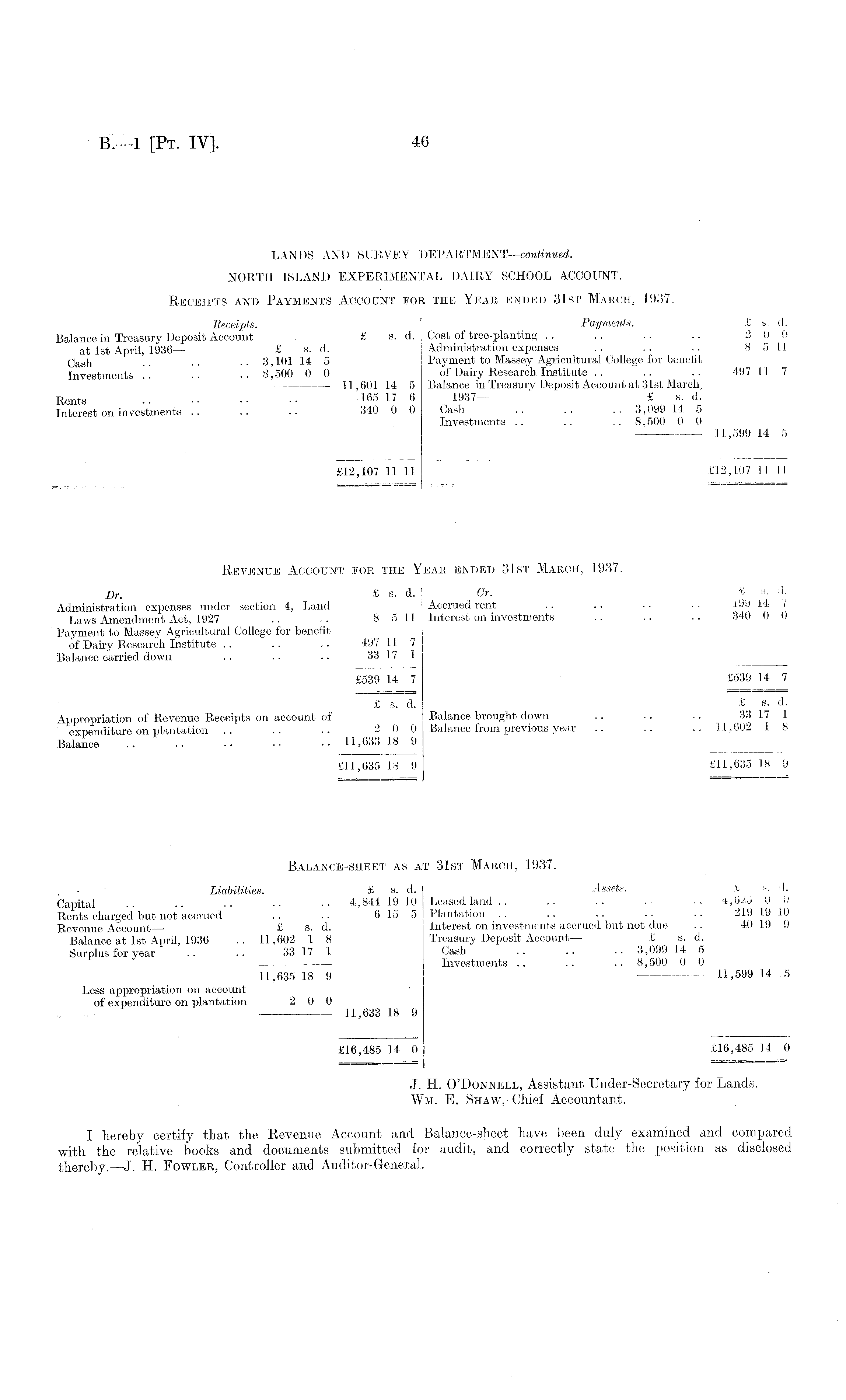 LANDS AND SURVEY DEPARTMENT—continued. NORTH ISLAND EXPERIMENTAL DAIRY SCHOOL ACCOUNT. Receipts and Payments Account fob the Year ended 31st March, 1937. Receipts. Payments. £ s. d. Balance in Treasury Deposit Account £ s. d. Cost of tree-planting .. .. .. .. 2 0 0 at Ist April, 1936 — £ s. d. Administration expenses .. .. .. 8 511 _ .. .. 3,101 14 5 Payment to Massey Agricultural College for benefit Investments .. . • .. 8,500 0 0 of Dairy Research Institute .. .. .. 497 11 7 11,601 14 5 Balance in Treasury Deposit Account at 31st March, Rents ... .. •• •• 165 17 6 1937— £ s. d. Interest on investments .. .. .. 340 0 0 Cash .. .. .. 3,099 14 5 Investments .. .. 8,500 0 0 11,599 14 5 £12,107 11 11 £12,107 11 11 Revenue Account foe the Year ended 31st March, 1937. D r . £ s. d. Or. s. d. Administration expenses under section 4, Land Accrued rent .. .. .. ■ • 199 14 7 Laws Amendment Act, 1927 .. .. 8 5 11 Interest on investments .. .. .. 340 0 0 Payment to Massey Agricultural College for benefit of Dairy Research Institute .. .. .. 497 11 7 Balance carried down . . .. .. 33 17 1 £539 14 7 £539 14 7 £ s. d. £ s. d. Appropriation of Revenue Receipts on account of Balance brought down .. .. .. 33 17 1 expenditure on plantation .. .. .. 2 0 0 Balance from previous year .. .. .. 11,602 1 8 Balance .. •• •• 11,633 18 9 £11,635 18 9 £11,635 18 9 Balance-sheet as at 31st March, 1937. • Liabilities. £ s. d. Assess. £ s. d. Capital .. .. .. •• •• 4,844 19 10 Leased land .. .. .. .. .. 4,625 0 0 Rents charged but not accrued .. .. 6 15 5 Plantation .. .. .. .. ■ • 219 19 10 Revenue Account £ s. d. Interest on investments accrued but not due . . 40 19 9 Balance at Ist April, 1936 .. 11,602 1 8 Treasury Deposit Account— £ s. d. Surplus for year .. .. 33 17 1 Cash .. .. . ■ 3,099 14 5 Investments .. .. 8,500 0 0 11,635 18 9 11,599 14 5 Less appropriation on account of expenditure on plantation 2 0 0 11,633 18 9 £16,485 14 0 £16,485 14 0 J. H. O'Donnell, Assistant Under-Secretary for Lands. Wm. E. Shaw, Chief Accountant. I hereby certify that the Revenue Account and Balance-sheet have been duly examined and compared with the relative books and documents submitted for audit, and correctly state the position as disclosed thereby.—J. H. Fowler, Controller and Auditor-General.