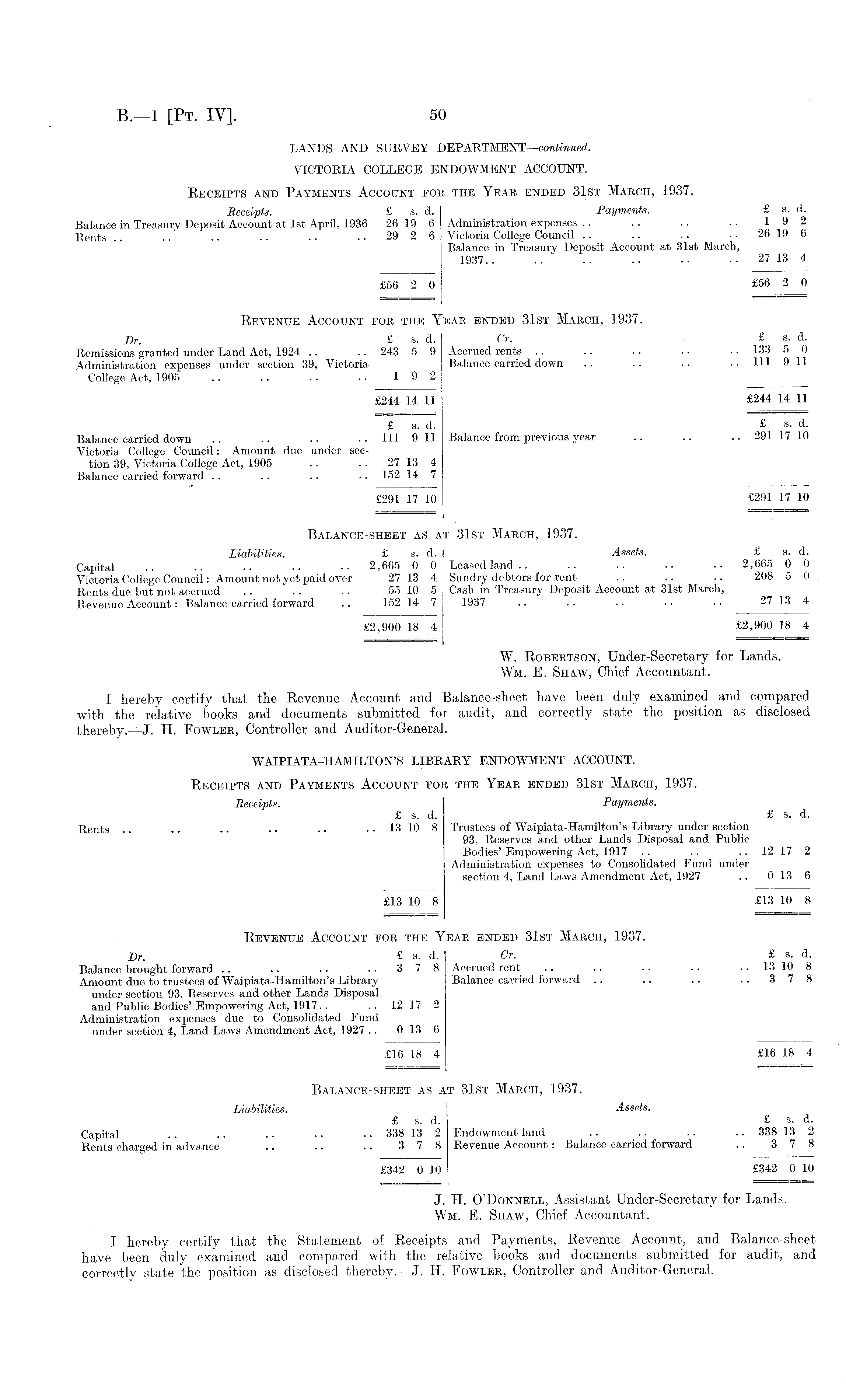LANDS AND SURVEY DEPARTMENT—continued. VICTORIA COLLEGE ENDOWMENT ACCOUNT. Receipts and Payments Account foe the Year ended 31st March, 1937. Receipts. £ s. d. Payments. £ s. d. Balance in Treasury Deposit Account at Ist April, 1936 26 19 6 Administration expenses .. .. .. .. 19 2 Rents .. .. .. .. • • • • 29 2 6 Victoria College Council .. .. .. • ■ 26 19 6 Balance in Treasury Deposit Account at 31st March. 1937 27 13 4 £56 2 0 £56 2 0 Revenue Account for the Year ended 31st March, 1937. Dr. £ s. d. Or. £ s. d. Remissions granted under Land Act, 1924 .. .. 243 5 9 Accrued rents .. .. .. . • .. 133 5 0 Administration expenses under section 39, Victoria Balance carried down .. .. .. 11l 911 College Act, 1905 ........192 £244 14 11 £244 14 11 £ s. d. £ s. d. Balance carried down .. .. .. .. 11l 911 Balance from previous year .. .. ..29117 10 Victoria College Council: Amount due under section 39, Victoria College Act, 1905 .. .. 27 13 4 Balance carried forward .. .. .. 152 14 7 • £291 17 10 £291 17 10 Balance-sheet as at 31st March, 1937. Liabilities. £ s. d. Assets. £ s. d. Capital .. .. .. • ■ • • 2, 665 0 0 Leased land .. .. .. .. 2, 665 0 0 Victoria College Council: Amount not yet paid over 27 13 4 Sundry debtors for rent .. .. .. 208 5 0 . Rents due but not accrued .. .. .. 55 10 5 Cash in Treasury Deposit Account at 31st March, Revenue Account: Balance carried forward .. 152 14 7 1937 .. . . .. . . .. 27 13 4 £2,900 18 4 £2,900 18 4 W. Robertson, Under-Secretary for Lands. Wm. E. Shaw, Chief Accountant. I hereby certify that the Revenue Account and Balance-sheet have been duly examined and compared with the relative books and documents submitted for audit, and correctly state the position as disclosed thereby.—J. H. Fowler, Controller and Auditor-General. WAIPIATA-HAMILTON'S LIBRARY ENDOWMENT ACCOUNT. Receipts and Payments Account for the Year ended 31st March, 1937. Receipts. Payments. £ s. d. £ s. d. Rents .. .. .. .. .. .. 13 10 8 Trustees of Waipiata-Hamilton's Library under section 93, Reserves and other Lands Disposal and Public Bodies' Empowering Act, 1917 .. .. 12 17 2 Administration expenses to Consolidated Fund under section 4, Land Laws Amendment Act, 1927 .. 0 13 6 £13 10 8 £13 10 8 Revenue Account for the Year ended 31st March, 1937. Dr. £ s. d. Or. £ s. d. Balance brought forward .. .. .. .. 3 7 8 Accrued rent .. .. .. .. 13 10 8 Amount due to trustees of Waipiata-Hamilton's Library Balance carried forward .. .. .. .. 3 7 8 under section 93, Reserves and other Lands Disposal and Public Bodies' Empowering Act, 1917.. .. 12 17 2 Administration expenses due to Consolidated Fund under section 4, Land Laws Amendment Act, 1927 .. 0 13 6 £16 18 4 £16 18 4 Balance-sheet as at 31st March, 1937. Liabilities. Assets. £ s. d. £ s. d. Capital .. .. .. • • • • 338 13 2 Endowment land .. .. .. .. 338 13 2 Rents charged in advance .. .. .. 3 7 8 Revenue Account : Balance carried forward .. 3 7 8 £342 0 10 £342 0 10 J. H. O'Donnell, Assistant Under-Secretary for Lands. Wm. E. Shaw, Chief Accountant. I hereby certify that the Statement of Receipts and Payments, Revenue Account, and Balance-sheet have been duly examined and compared with the relative books and documents submitted for audit, and correctly state the position as disclosed thereby. —J. H. Fowler, Controller and Auditor-General.