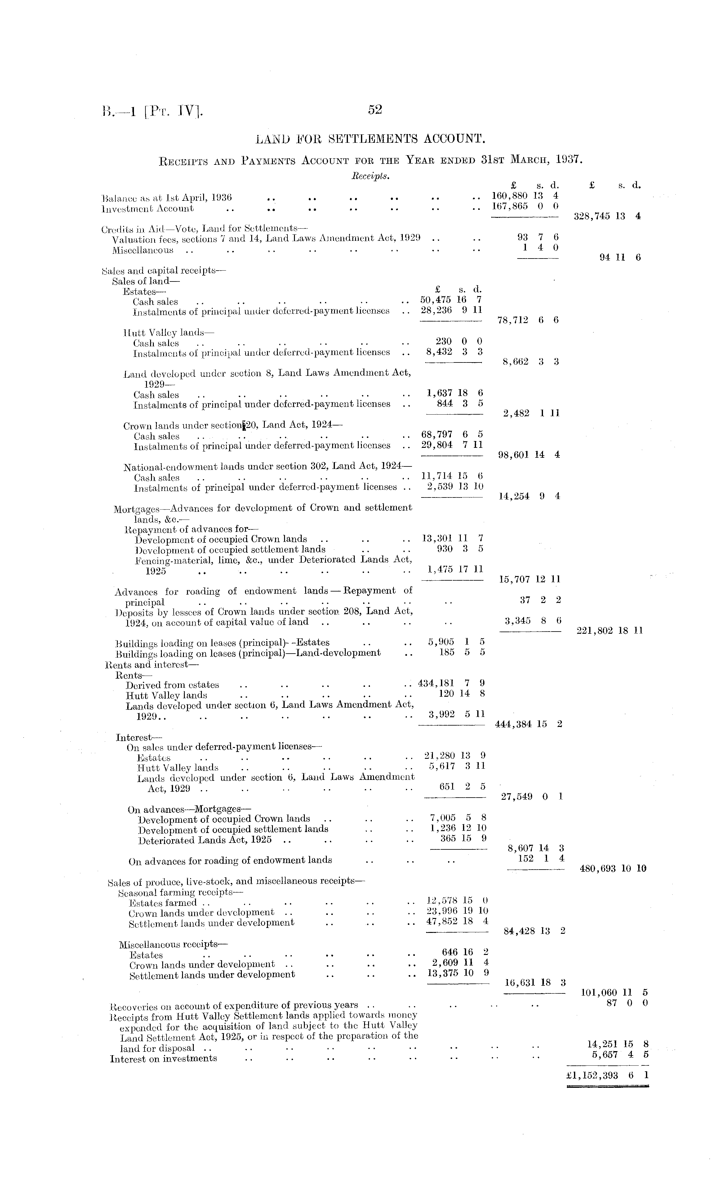 LAND FOR SETTLEMENTS ACCOUNT. Receipts and Payments Account foe the Year ended 31st Mabch, 1937. Receipts. £ s. d. £ s. d. Balance as at Ist April, 1936 .. .. •• •« •• • • 160,880 13 4 Investment Account .. .. •. •• •• •• •• 167,865 0 0 328,745 13 4 Credits in Aid —Vote, Land for Settlements — Valuation fees, sections 7 and 14, Land Laws Amendment Act, 1929 .. .. 93 7 6 Miscellaneous .. .. •• •• •• •• •• •• 140 94 11 6 Sales and capital receipts — Sales of land — Estates — £ s - d. Cash sales .. .. • • • • • • • • 50,475 16 7 Instalments of principal under deferred-payment licenses .. 28,236 911 78,712 6 6 Hutt Valley lands — Cash sales .. .. • • • • • • • • 230 0 0 Instalments of principal under deferred-payment licenses .. 8,432 3 3 8,662 3 3 Land developed under section 8, Land Laws Amendment Act, 1929— Cash sales .. .. •• •• •• 1,637 18 6 Instalments of principal under deferred-payment licenses .. 844 3 5 — 2,482 1 11 Crown lands under.section|2o, Land Act, 1924 — Cash sales .. •• •• •• •• 68,797 6 5 Instalments of principal under deferred-payment licenses .. 29,804 7 11 ■ 98,601 14 4 National-endowment lands under section 302, Land Act, 1924— Cash sales .. .. •• •• •• •• 11,714 15 6 Instalments of principal under deferred-payment licenses .. 2,539 13 10 14,254 9 4 Mortgages —Advances for development of Crown and settlement lands, &c. — Repayment of advances for — Development of occupied Crown lands .. .. .. 13,301 11 7 Development of occupied settlement lands .. .. 930 3 5 .Fencing-material, lime, &c., under Deteriorated Lands Act, 1925 .. 1,475 17 11 15,707 12 11 Advances for roading of endowment lands — Repayment of principal .. .. .. • ■ • • • • • • 37 22 Deposits by lessees of Crown lands under section 208, Land Act, 1924, on account of capital value of land .. .. .. .. 3,345 8 6 221,802 18 11 Buildings loading on leases (principal)--Estates .. .. 5,905 1 5 Buildings loading on leases (principal) —Land-development .. 185 5 5 Rents and interest — Rents — Derived from estates .. .. .. •• 434,181 7 9 Hutt Valley lands .. .. ■ • • • • • 120 14 8 Lands developed under section 6, Land Laws Amendment Act, 1929.. 3,992 5 11 444,384 15 2 Interest — On sales under deferred-payment licenses — Estates .. .. •• •• •• •• 21,280 13 9 Hutt Valley lands .. .. •• 5,617 311 Lands developed under section 6, Land Laws Amendment Act, 1929 .. . • • ■ • • • • • • 651 2 5 27,549 0 1 On advances —Mortgages— Development of occupied Crown lands .. .. .. 7,005 5 8 Development of occupied settlement lands .. .. 1,236 12 10 Deteriorated Lands Act, 1925 .. .. .. • • 365 15 9 8,607 14 3 On advances for roading of endowment lands .. .. .. 152 1 4 480,693 10 10 Sales of produce, live-stock, and miscellaneous receipts— Seasonal farming receipts — Estates farmed .. .. .. •• •• •• 12,578 15 0 Crown lands under development .. .. .. .. 23,996 19 10 Settlement lands under development .. ... .. 47,852 18 4 84,428 13 2 Miscellaneous receipts— Estates .. ■ • • • • • • • • • 646 16 2 Crown lands under development .. .. .. .. 2,609 11 4 Settlement lands under development .. .. .. 13,375 10 9 16,631 18 3 101,060 11 5 Recoveries on account of expenditure of previous years .. .. .. • • • • 87 0 0 Receipts from Hutt Valley Settlement lands applied towards money expended for the acquisition of land subject to the Hutt Valley Land Settlement Act, 1925, or in respect of the preparation of the land for disposal l 8 Interest on investments .. •• •• •• •• •• •• 0,00/ £1,152,393 6 1