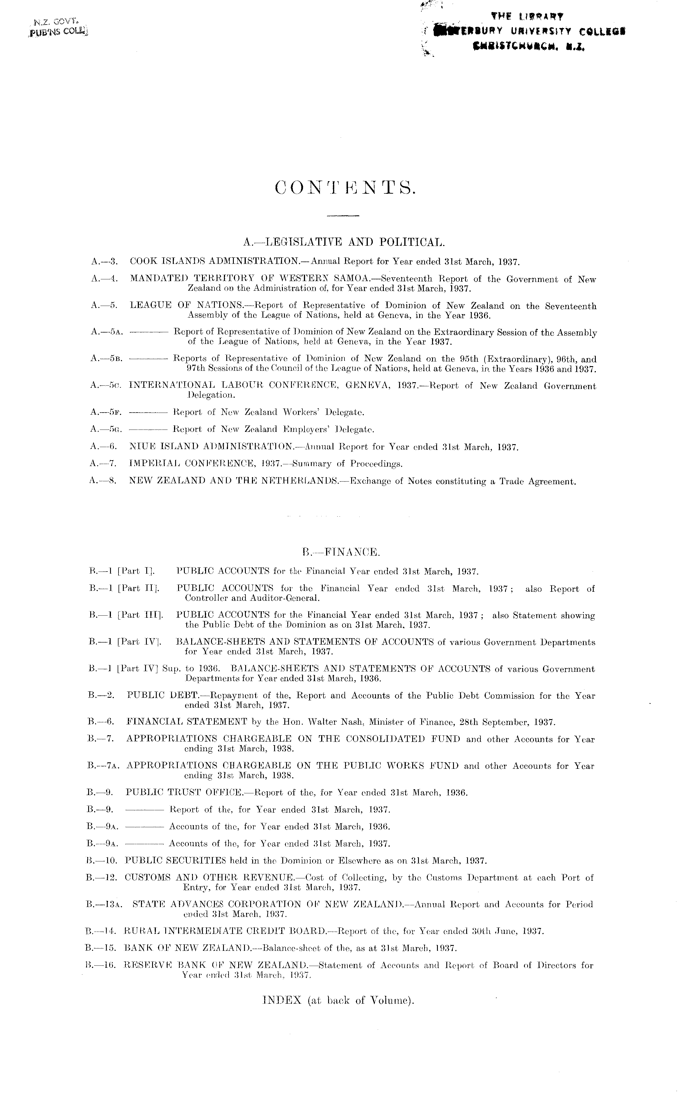 A.—LEGISLATIVE AND POLITICAL. A. —3. COOK ISLANDS ADMINISTRATION. —Annual Report for Year ended 31st March, 1937. A.—4, MANDATED TERRITORY OF WESTERN SAMOA.—Seventeenth Report of the Government of New Zealand on the Administration of, for Year ended 31st March, 1937. A.—s. LEAGUE OF NATIONS. —Report of Representative of Dominion of New Zealand on the Seventeenth Assembly of the League of Nations, held at Geneva, in the Year 1936. A.—sa. Report of Representative of Dominion of New Zealand on the Extraordinary Session of the Assembly of the League of Nations, held at Geneva, in the Year 1937. A.—sb. Reports of Representative of Dominion of New Zealand on the 95th (Extraordinary), 96th, and 97th Sessions of the Council of the League of Nations, held at Geneva, in the Years 1936 and 1937. A.—so. INTERNATIONAL LABOUR CONFERENCE, GENEVA, 1937,—Report of New Zealand Government Delegation. A. —ss. Report of New Zealand Workers' Delegate. A.—sg. Report of New Zealand Employers' Delegate. A.—6. NIUE ISLAND ADMINISTRATION.—AnnuaI Report for Year ended 31st March, 1937. A.—7. IMPERIAL CONFERENCE, 1937.—-Summary,of Proceedings. A.—B. NEW ZEALAND AND THE NETHERLANDS.—Exchange of Notes constituting a Trade Agreement.