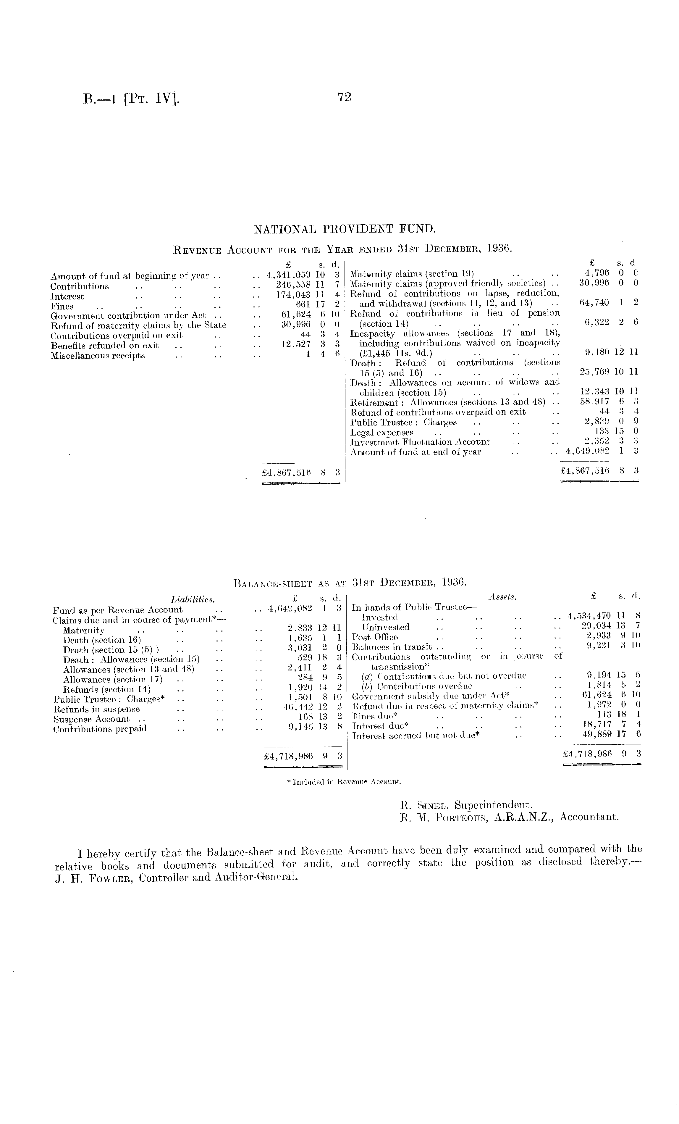 NATIONAL PROVIDENT FUND. Revenue Account foe the Year ended 31st December, 1936. £ s. d. £ s. d Amount of fund at beginning of year .. .. 4,341,059 10 3 Maternity claims (section 19) .. .. 4,796 0 0 Contributions .. •• •• •• 246,558 11 7 Maternity claims (approved friendly societies) .. 30,996 0 0 Interest . • ■ • • • • ■ 174,043 11 4 Refund of contributions on lapse, reduction, Fines .. .. .. .. .. 661 17 2 and withdrawal (sections 11, 12, and 13) •• 64,740 1 2 Government contribution under Act .. .. 61,624 6 10 Refund of contributions in lieu of pension Refund of maternity claims by the State .. 30,996 0 0 (section 14) .. . . • • ■■ 6,322 2 6 Contributions overpaid on exit .. .. 44 3 4 Incapacity allowances (sections 17 and 18), Benefits refunded on exit .. .. 12,527 3 3 including contributions waived on incapacity Miscellaneous receipts .. •• •• 14 6 (£1,445 lis. 9d.) .. .. •• 9,180 12 11 Death: Refund of contributions (sections 15(5) and 16) .. .. •• 25,769 10 11 Death : Allowances on account of widows and children (section 15) .. .. •• 12,343 10 11 Retirement: Allowances (sections 13 and 48) .. 58,917 6 3 Refund of contributions overpaid on exit .. 44 3 4 Public Trustee : Charges .. .. . • 2,839 0 9 Legal expenses .. .. ■ • ■ • 133 15 0 Investment Fluctuation Account . . .. 2,352 3 3 Amount of fund at end of year .. .. 4,649,082 1 3 £4,867,516 8 3 £4,867,516 8 3 Balance-sheet as at 31st December, 1936. Liabilities £ s. d, Assets. £ s. d. Fund as per Revenue Account .. •• 4,649,082 1 3 In hands of Public Trustee Claims due and in course of payment*— Invested 4,534,470 11 S Maternity 2,833 12 11 Uninvested 29,034 i Death (section 16) .. •• 1,635 1 1 Post Office .. •• •• •• ' Death (section 15 (5) ) .. •• • 3,031 2 0 Balances m transit .. .. .. • • 9,221 310 Death: Allowances (section 15) .. .. 529 18 3 Contributions outstanding or in. course of Allowances (section 13 and 48) .. .. 2,411 2 4 transmission* Allowances (section 17) 284 9 5 (a) Contributions due but not overdue .. 9,194 15 5 Refunds (section 14) 1,920 14 2 (b) Contributions overdue .. .. 1,814 5 - Public Trustee: Charges* 1,501 810 Government subsidy due under Act* .. 61,624 blO Refunds in suspense .. .. ■■ 46,442 12 2 Refund due m respect of maternity claims* .. 1,972 0 0 Suspense Account 168 13 2 Fines due* 113 18 1 Contributions prepaid .. .. .. 9,145 13 8 Interest due .. .. .. •• , Q 'oo Q 17 Interest accrued but not due* .. .. 4y,00y 17 o £4,718,986 9 3 £4,718,986 9 3 * Included in Revenue Aceeunt. R. Sinel, Superintendent. R. M. Porteous, A.R.A.N.Z., Accountant. I hereby certify that the Balance-sheet ancl Revenue Account have been duly examined and compared with the relative books and documents submitted for audit, and correctly state the position as disclosed thereby — J. H. Fowler, Controller and Auditor-General.