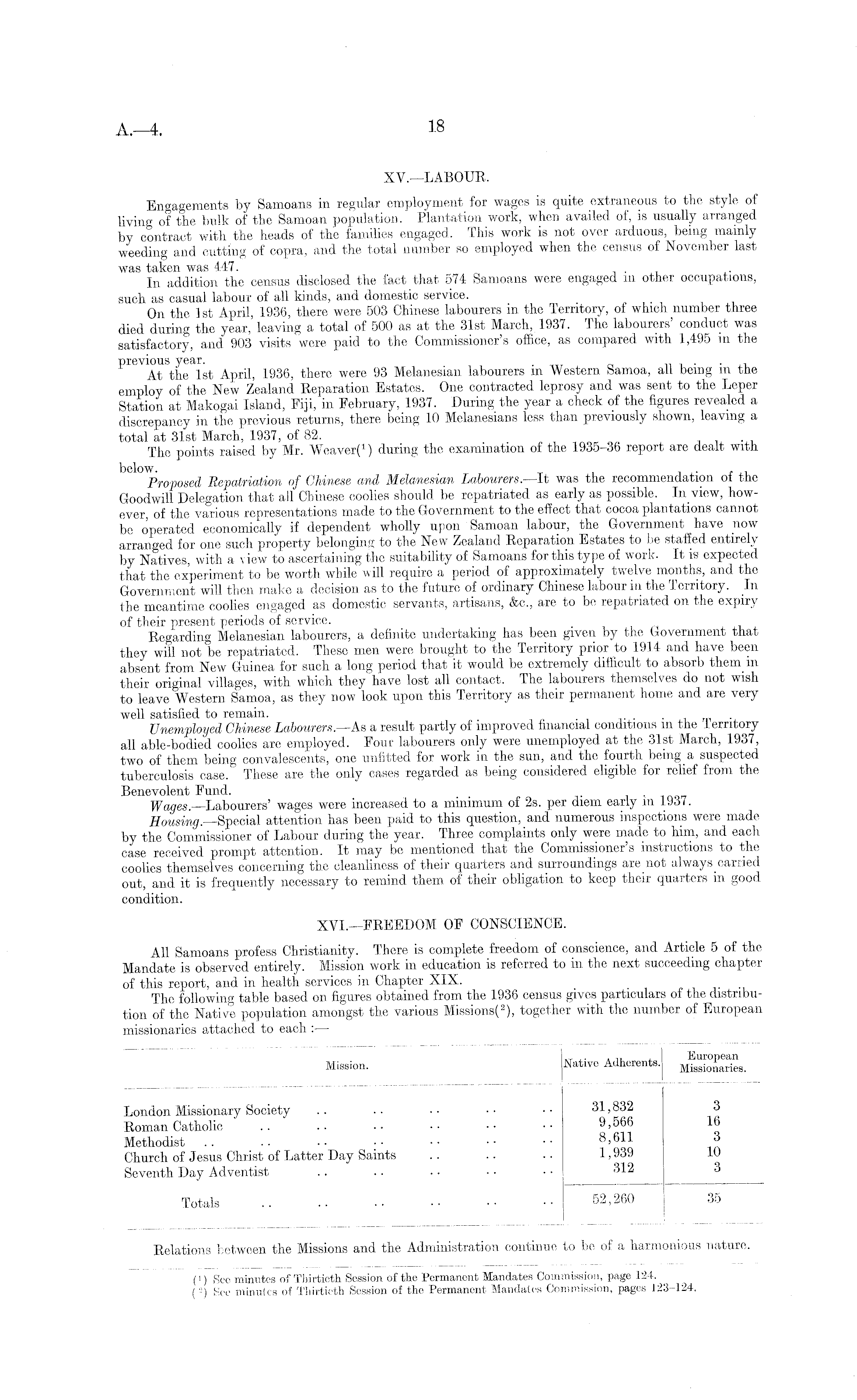XV,— LABOUR. Engagements by Samoans in regular employment for wages is quite extraneous to the style of living of the bulk of the Samoan population. Plantation work, when availed of, is usually arranged by contract with the heads of the families engaged. This work is not over arduous, being mainly weeding and cutting of copra, and the total number so employed when the census of November last was taken was 447. . In addition the census disclosed the fact that 574 Samoans were engaged m other occupations, such as casual labour of all kinds, and domestic service. On the Ist April, 1936, there were 503 Chinese labourers in the Territory, of which number three died during the year, leaving a total of 500 as at the 31st March, 1937. The labourers' conduct was satisfactory, and 903 visits were paid to the Commissioner's office, as compared with 1,495 m the previous year. . . . At the Ist April, 1936, there were 93 Melanesian. labourers m Western Samoa, all being m the employ of the New Zealand Reparation Estates. One contracted leprosy and was sent to the Leper Station at Makogai Island, Fiji, in February, 1937. During the year a check of the figures revealed a discrepancy in the previous returns, there being 10 Melanesians less than previously shown, leaving a total at 31st March, 1937, of 82. . The points raised by Mr. during the examination of the 1935-36 report are dealt with Proposed Repatriation of Chinese and Melanesian Labourers. —It was the recommendation of the Goodwill Delegation that all Chinese coolies should be repatriated as early as possible. In view, however, of the various representations made to the Government to the effect that cocoa plantations cannot be operated economically if dependent wholly upon Samoan labour, the Government have now arranged for one such property belonging' to the New Zealand Reparation Estates to be staffed entirely by Natives, with a view to ascertaining the suitability of Samoans for this type of work. It is expected that the experiment to be worth while will require a period of approximately twelve months, and the Government will then make a decision as to the future of ordinary Chinese labour in the Territory. In the meantime coolies engaged as domestic servants, artisans, &c., are to be repatriated on the expiry of their present periods of service. _ Regarding Melanesian labourers, a definite undertaking has been given by the Government that they will not be repatriated. These men were brought to the Territory prior to 1914 and have been absent from New Guinea for such a long period that it would be extremely difficult to absorb them m their original villages, with which they have lost all contact. The labourers themselves do not wish to leave Western Samoa, as they now look upon this Territory as their permanent home and are very well satisfied to remain. . Unemployed Chinese Labourers. —As a result partly of improved financial conditions 111 the territory all able-bodied coolies are employed. Four labourers only were unemployed at the 31st March, 1937, two of them being convalescents, one unfitted for work in the sun, and the fourth being a suspected tuberculosis case. These are the only cases regarded as being considered eligible for relief from the Benevolent Fund. , Wages.—Labourers' wages were increased to a minimum of 2s. per diem early m 1937. Housing.—Special attention has been paid to this question, and numerous inspections were made by the Commissioner of Labour during the year. Three complaints only were made to him, and each case received prompt attention. It may be mentioned that the Commissioner s instructions to the coolies themselves concerning the cleanliness of their quarters and surroundings are not always carried out, and it is frequently necessary to remind them of their obligation to keep their quarters in good condition. XVI,— FREEDOM OF CONSCIENCE. All Samoans profess Christianity. There is complete freedom of conscience, and Article sof the Mandate is observed entirely. Mission work in education is referred to in the next succeeding chapter of this report, and in health services in Chapter XIX. The following table based on figures obtained from the 1936 census gives particulars of the distribution of the Native population amongst the various Missions( 2 ), together with the number of European missionaries attached to each : —