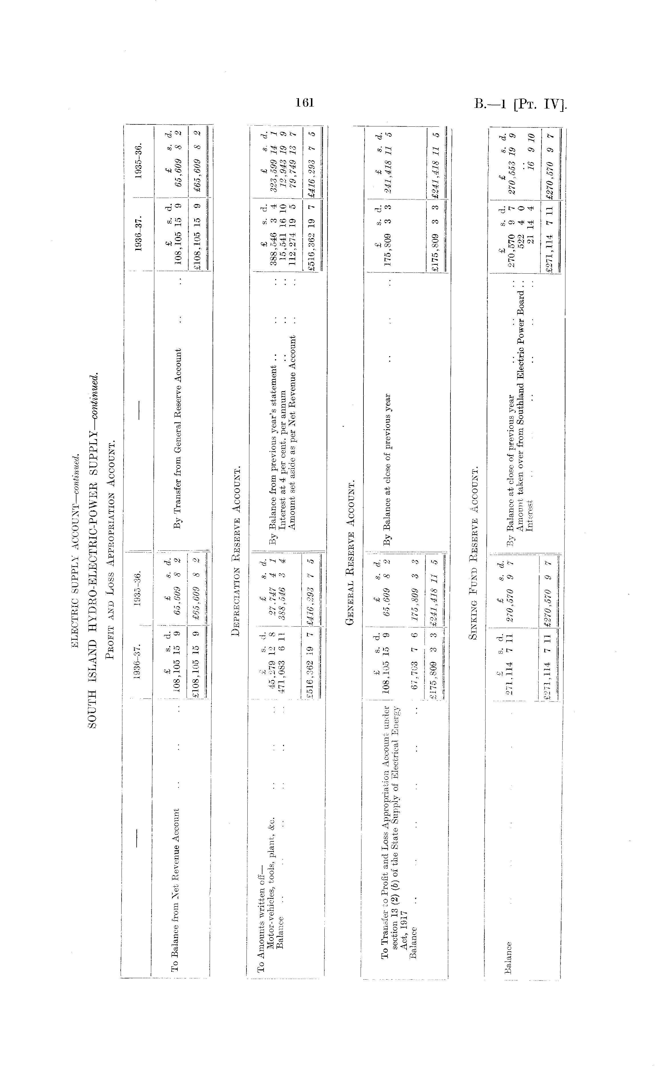 Profit and Loss Appropriation Account. 1936-37. I 1935-36. —— 1936-37. 1935-36. I I | . £ s. d. £ s. d. £ g. d. £ s. d. io .Balance from !Net Revenue Account .. .. .. 108,105 15 9 65,609 8 2 By Transfer from General Reserve Account .. .. 108,105 15 9 65,609 8 2 £108,105 15 9 £65,609 8 2 £108.105 15 9 £65,609 8 2 i ; = = — -= -= ■ r Depreciation Reserve Account. To Amounts written off— £ s. d. £ s. d. £ s. d. £ s. d. Motor-vehicles, tools, plant, &c. .. .. .. j 45,279 12 8 27,747 4 1 By Balance from previous year's statement .. .. .. 388,546 3 4 323,599 14 1 Balance .. .. .. .. .. . . 471,083 6 11 388,546 3 4 Interest at 4 per cent, per annum .. .. .. 15,541 16 10 12,943 19 9 Amount set aside as per Net Revenue Account .. .. 112,274 19 5 79,749 13 7 j£516, 362 19 7 £416,293 7 5 £516,362 19 7 £416,293 7 5 General Reserve Account. — — m £ s. d. £ s. d. £ s. d. £ s. d. To Transfer to Profit and Loss Appropriation Account- under 108,105 15 9 65,609 8 2 By Balance at close of previous year .. .. .. 175,809 3 3 241,418 11 5 section 13 (2) (6) of the State Supply of Electrical Energy Act, 1917 Balance .. .. .. .. .. 67,703 7 6 175,809 3 3 (£175,809 3 3 £241,418 11 5 £175,809 3 3 £241,418 11 5 Sinking Fund Reserve Account. , £ s * d. £ s. d. £ s. d. £ s. d. Balance 271,114 7 11 270,570 9 7 By Balance at close of previous year .. .. .. 270,570 9 7 270,553 19 9 Amount taken over from Southland Electric Power Board .. 522 4 0 Interest . . .. .. .. .. 21 14 4 16 9 10 £271,114 7 11 £270,570 9 7 £271,114 7 11 £270,570 9 7