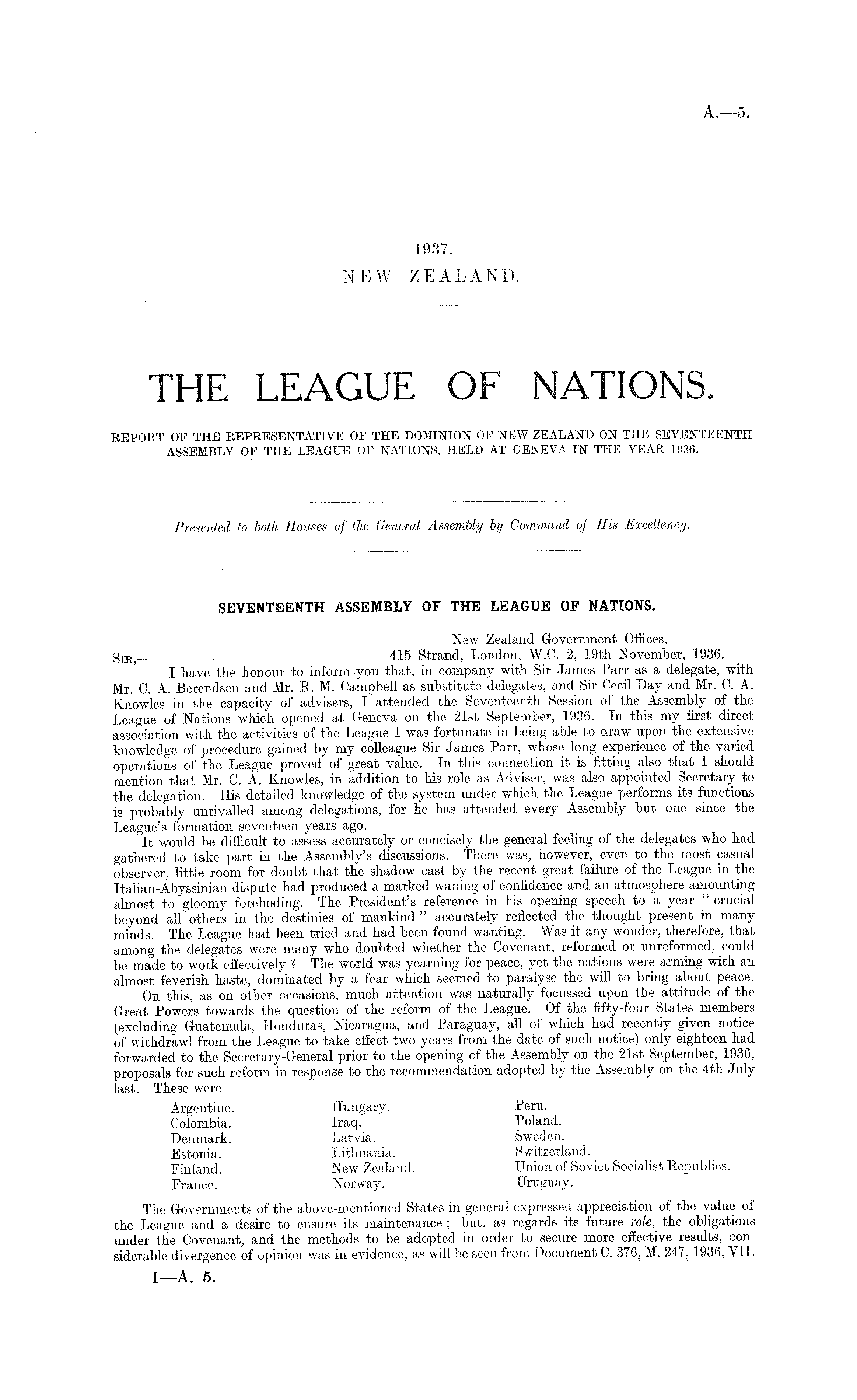 THE LEAGUE OF NATIONS. REPORT OF THE REPRESENTATIVE OF THE DOMINION OF NEW ZEALAND ON THE SEVENTEENTH ASSEMBLY OF THE LEAGUE OF NATIONS, HELD AT GENEVA IN THE YEAR 1936.