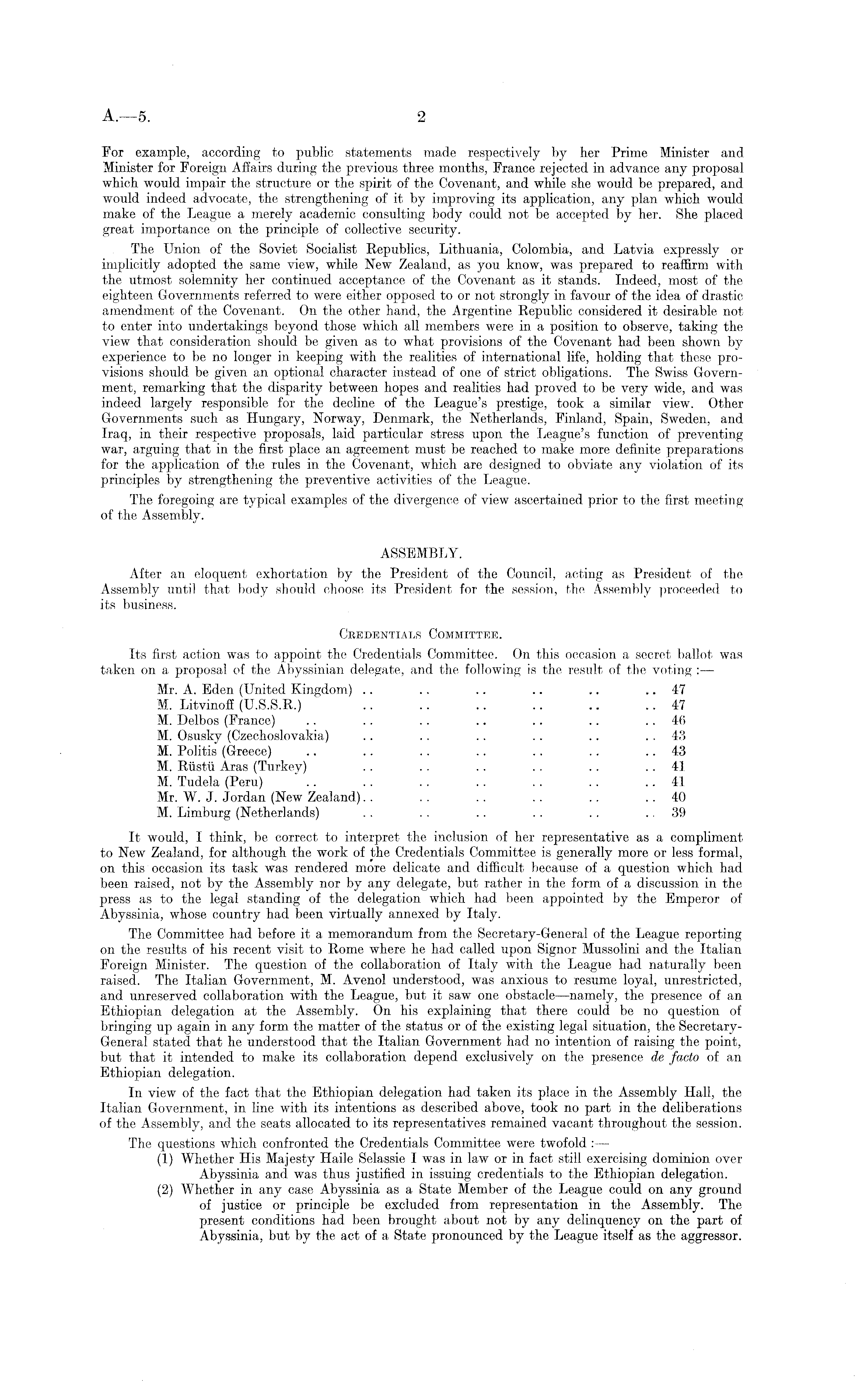 For example, according to public statements made respectively by her Prime Minister and Minister for Foreign Affairs during the previous three months, France rejected in advance any proposal which would impair the structure or the spirit of the Covenant, and while she would be prepared, and would indeed advocate, the strengthening of it by improving its application, any plan which would make of the League a merely academic consulting body could not be accepted by her. She placed great importance on the principle of collective security. The Union of the Soviet Socialist Republics, Lithuania, Colombia, and Latvia expressly or implicitly adopted the same view, while New Zealand, as you know, was prepared to reaffirm with the utmost solemnity her continued acceptance of the Covenant as it stands. Indeed, most of the eighteen Governments referred to were either opposed to or not strongly in favour of the idea of drastic amendment of the Covenant. On the other hand, the Argentine Republic considered it desirable not to enter into undertakings beyond those which all members were in a position to observe, taking the view that consideration should be given as to what provisions of the Covenant had been shown by experience to be no longer in keeping with the realities of international life, holding that these provisions should be given an optional character instead of one of strict obligations. The Swiss Government, remarking that the disparity between hopes and realities had proved to be very wide, and was indeed largely responsible for the decline of the League's prestige, took a similar view. Other Governments such as Hungary, Norway, Denmark, the Netherlands, Finland, Spain, Sweden, and Iraq, in their respective proposals, laid particular stress upon the League's function of preventing war, arguing that in the first place an agreement must be reached to make more definite preparations for the application of the rules in the Covenant, which are designed to obviate any violation of its principles by strengthening the preventive activities of the League. The foregoing are typical examples of the divergence of view ascertained prior to the first meeting of the Assembly. ASSEMBLY. After an eloquent exhortation by the President of the Council, acting as President of the Assembly until that body should choose its President for the session, the Assembly proceeded to its business. Credentials Committee. Its first action was to appoint the Credentials Committee. On this occasion a secret ballot was taken on a- proposal of the Abyssinian delegate, and the following is the result of the voting Mr. A. Eden (United Kingdom) .. .. .. .. .. .. 47 M. Litvinofi (U.S.S.R.) .. .. .. .. .. .. 47 M. Delbos (France) .. .. .. .. .. .. .. 46 M. Osusky (Czechoslovakia) .. . . .. .. .. 43 M. Politis (Greece) .. .. .. .. .. .. 43 M. Riistii Aras (Turkey) .. .. . . .. .. .. 41 M. Tudela (Peru) .. . . . . . . . . .. .. 41 Mr. W. J. Jordan (New Zealand). . . . . . . . .. 40 M. Limburg (Netherlands) . . . . .. . . . . 39 It would, I think, be correct to interpret the inclusion of her representative as a compliment to New Zealand, for although the work of the Credentials Committee is generally more or less formal, on this occasion its task was rendered more delicate and difficult because of a question which had been raised, not by the Assembly nor by any delegate, but rather in the form of a discussion in the press as to the legal standing of the delegation which had been appointed by the Emperor of Abyssinia, whose country had been virtually annexed by Italy. The Committee had before it a memorandum from the Secretary-General of the League reporting on the results of his recent visit to Rome where he had called upon Signor Mussolini and the Italian Foreign Minister. The question of the collaboration of Italy with the League had naturally been raised. The Italian Government, M. Avenol understood, was anxious to resume loyal, unrestricted, and unreserved collaboration with the League, but it saw one obstacle —namely, the presence of an Ethiopian delegation at the Assembly. On his explaining that there could be no question of bringing up again in any form the matter of the status or of the existing legal situation, the SecretaryGeneral stated that he understood that the Italian Government had no intention of raising the point, but that it intended to make its collaboration depend exclusively on the presence de facto of an Ethiopian delegation. In view of the fact that the Ethiopian delegation had taken its place in the Assembly Hall, the Italian Government, in line with its intentions as described above, took no part in the deliberations of the Assembly, and the seats allocated to its representatives remained vacant throughout the session. The questions which confronted the Credentials Committee were twofold : — (1) Whether His Majesty Haile Selassie I was in law or in fact still exercising dominion over Abyssinia and was thus justified in issuing credentials to the Ethiopian delegation. (2) Whether in any case Abyssinia as a State Member of the League could on any ground of justice or principle be excluded from representation in the Assembly. The present conditions had been brought about not by any delinquency on the part of Abyssinia, but by the act of a State pronounced by the League itself as the aggressor.