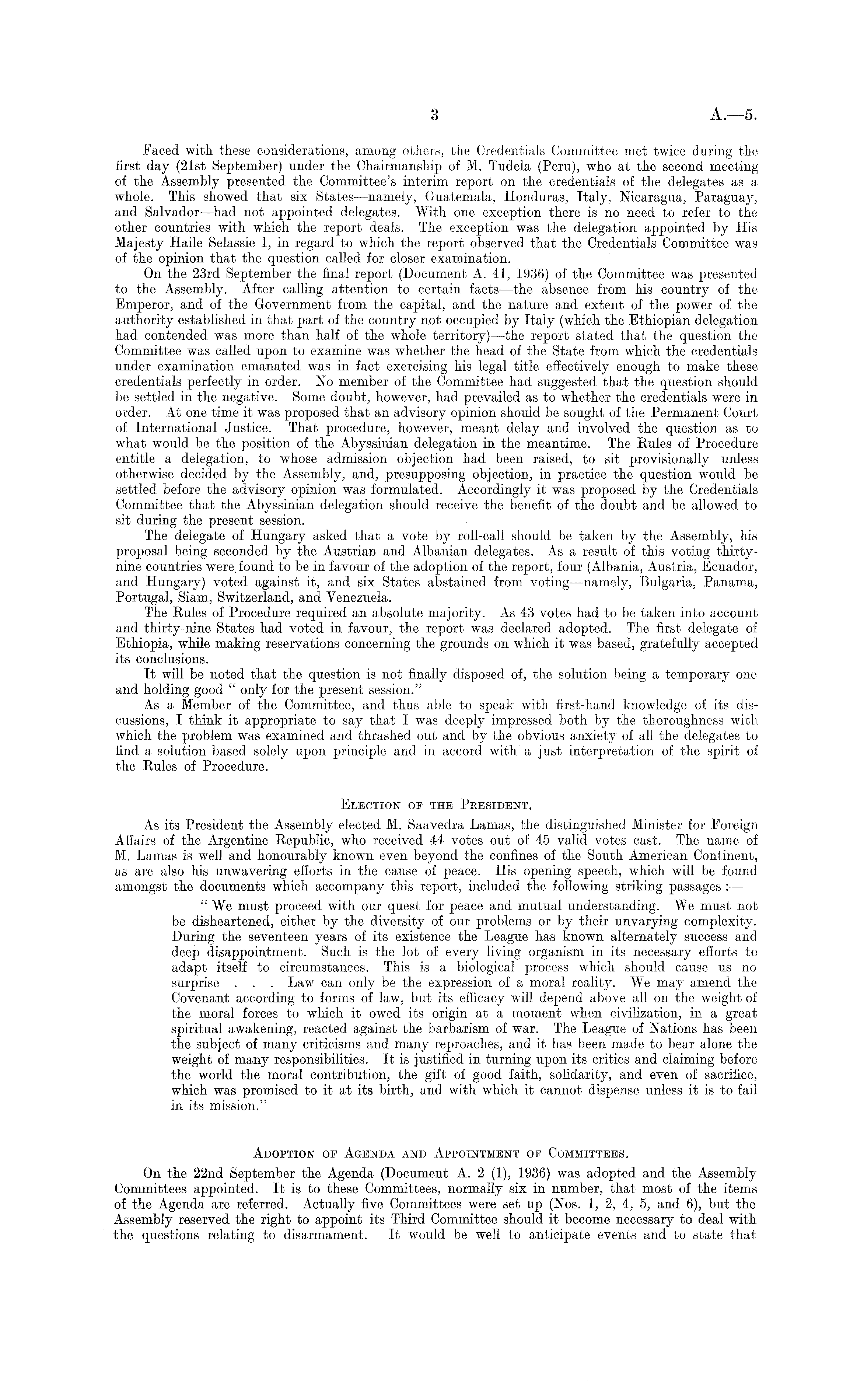 Faced with these considerations, among others, the Credentials Committee met twice during the first day (21st September) under the Chairmanship of M. Tudela (Peru), who at the second meeting of the Assembly presented the Committee's interim report on the credentials of the delegates as a whole. This showed that six States —namely, Guatemala, Honduras, Italy, Nicaragua, Paraguay, and Salvador —had not appointed delegates. With one exception there is no need to refer to the other countries with which the report deals. The exception was the delegation appointed by His Majesty Haile Selassie I, in regard to which the report observed that the Credentials Committee was of the opinion that the question called for closer examination. On the 23rd September the final report (Document A. 41, 1936) of the Committee was presented to the Assembly. After calling attention to certain facts —the absence from his country of the Emperor, and of the Government from the capital, and the nature and extent of the power of the authority established in that part of the country not occupied by Italy (which the Ethiopian delegation had contended was more than half of the whole territory) —the report stated that the question the Committee was called upon to examine was whether the head of the State from which the credentials under examination emanated was in fact exercising his legal title effectively enough to make these credentials perfectly in order. No member of the Committee had suggested that the question should be settled in the negative. Some doubt, however, had prevailed as to whether the credentials were in order. At one time it was proposed that an advisory opinion should be sought of the Permanent Court of International Justice. That procedure, however, meant delay and involved the question as to what would be the position of the Abyssinian delegation in the meantime. The Rules of Procedure entitle a delegation, to whose admission objection had been raised, to sit provisionally unless otherwise decided by the Assembly, and, presupposing objection, in practice the question would be settled before the advisory opinion was formulated. Accordingly it was proposed by the Credentials Committee that the Abyssinian delegation should receive the benefit of the doubt and be allowed to sit during the present session. The delegate of Hungary asked that a vote by roll-call should be taken by the Assembly, his proposal being seconded by the Austrian and Albanian delegates. As a result of this voting thirtynine countries were, found to be in favour of the adoption of the report, four (Albania, Austria, Ecuador, and Hungary) voted against it, and six States abstained from voting —namely, Bulgaria, Panama, Portugal, Siam, Switzerland, and Venezuela. The Rules of Procedure required an absolute majority. As 43 votes had to be taken into account and thirty-nine States had voted in favour, the report was declared adopted. The first delegate of Ethiopia, while making reservations concerning the grounds on which it was based, gratefully accepted its conclusions. It will be noted that the question is not finally disposed of, the solution being a temporary one and holding good " only for the present session." As a Member of the Committee, and thus able to speak with first-hand knowledge of its discussions, I think it appropriate to say that I was deeply impressed both by the thoroughness with which the problem was examined and thrashed out and by the obvious anxiety of all the delegates to find a solution based solely upon principle and in accord with a just interpretation of the spirit of the Rules of Procedure. Election of the President. As its President the Assembly elected M. Saavedra Lamas, the distinguished Minister for Foreign Affairs of the Argentine Republic, who received 44 votes out of 45 valid votes cast. The name of M. Lamas is well and honourably known even beyond the confines of the South American Continent, as are also his unwavering efforts in the cause of peace. His opening speech, which will be found amongst the documents which accompany this report, included the following striking passages : — "We must proceed with our quest for peace and mutual understanding. We must not be disheartened, either by the diversity of our problems or by their unvarying complexity. During the seventeen years of its existence the League has known alternately success and deep disappointment. Such is the lot of every living organism in its necessary efforts to adapt itself to circumstances. This is a biological process which should cause us no surprise . . . Law can only be the expression of a moral reality. We may amend the Covenant according to forms of law, but its efficacy will depend above all on the weight of the moral forces to which it owed its origin at a moment when civilization, in a great spiritual awakening, reacted against the barbarism of war. The League of Nations has been the subject of many criticisms and many reproaches, and it has been made to bear alone the weight of many responsibilities. It is justified in turning upon its critics and claiming before the world the moral contribution, the gift of good faith, solidarity, and even of sacrifice, which was promised to it at its birth, and with which it cannot dispense unless it is to fail in its mission." Adoption of Agenda and Appointment of Committees. On the 22nd September the Agenda (Document A. 2 (1), 1936) was adopted and the Assembly Committees appointed. It is to these Committees, normally six in number, that most of the items of the Agenda are referred. Actually five Committees were set up (Nos. 1, 2, 4, 5, and 6), but the Assembly reserved the right to appoint its Third Committee should it become necessary to deal with the questions relating to disarmament. It would be well to anticipate events and to state that
