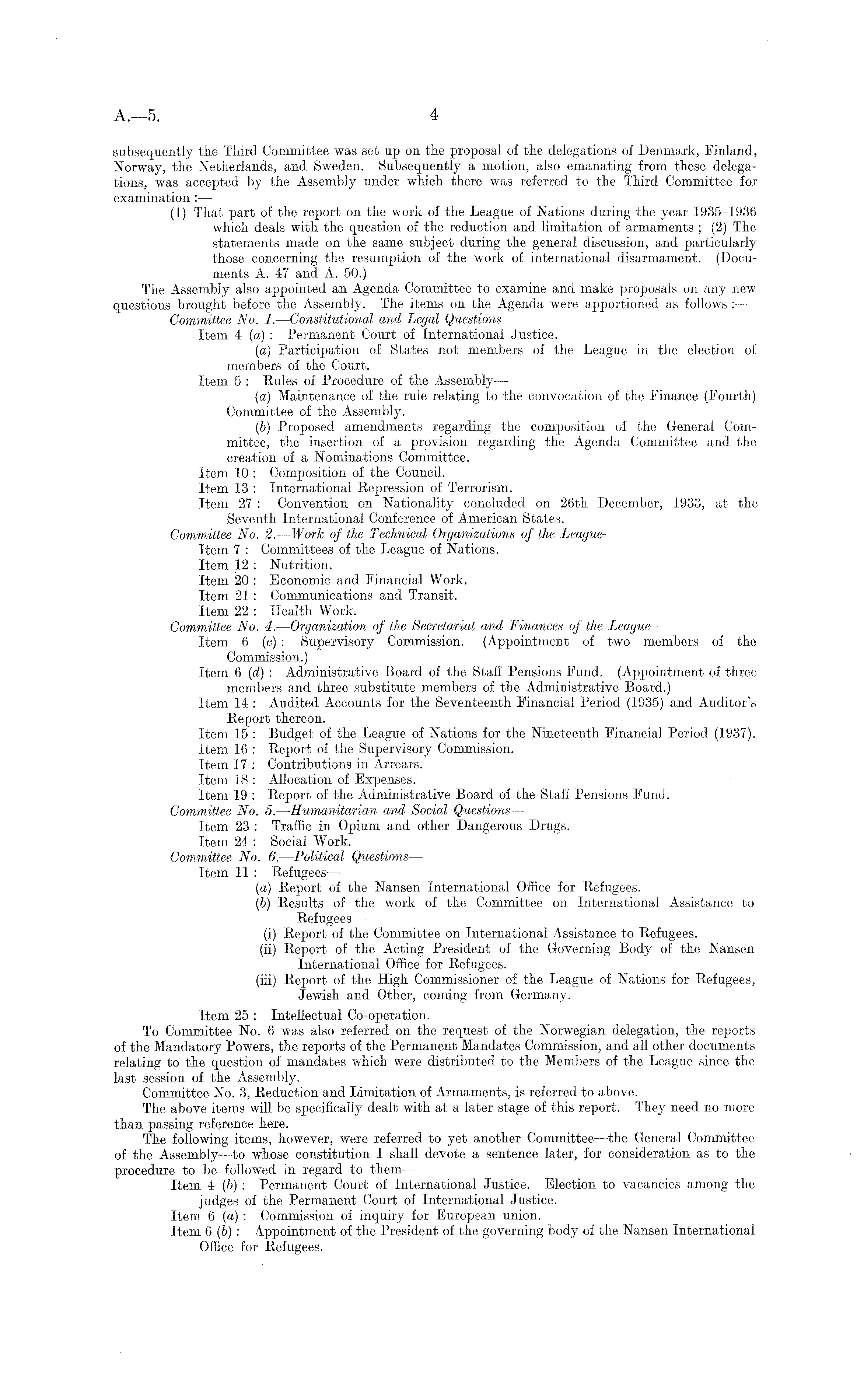 subsequently the Third Committee was set up on the proposal of the delegations of Denmark, Finland, Norway, the Netherlands, and Sweden. Subsequently a motion, also emanating from these delegations, was accepted by the Assembly under which there was referred to the Third Committee for examination :— (1) That part of the report on the work of the League of Nations during the year 1935-1936 which deals with the question of the reduction and limitation of armaments ; (2) The statements made on the same subject during the general discussion, and particularly those concerning the resumption of the work of international disarmament. (Documents A. 47 and A. 50.) The Assembly also appointed an Agenda Committee to examine and make proposals on any new questions brought before the Assembly. The items on the Agenda were apportioned as follows : — Committee No. 1. —Constitutional and Legal Questions — Item 4 (a) : Permanent Court of International Justice. (a) Participation of States not members of the League in the election of members of the Court. Item 5 : Rules of Procedure of the Assembly— (a) Maintenance of the rule relating to the convocation of the Finance (Fourth) Committee of the Assembly. (b) Proposed amendments regarding the composition of the General Committee, the insertion of a provision regarding the Agenda Committee and the creation of a Nominations Committee. Item 10 : Composition of the Council. Item 13 : International Repression of Terrorism. Item 27 : Convention on Nationality concluded on 26th December, 1933, at the Seventh International Conference of American States. Committee No. 2. —Work of the Technical Organizations of the League— Item 7 : Committees of the League of Nations. Item 12 : Nutrition. Item 20 : Economic and Financial Work. Item 21 : Communications and Transit. Item 22 : Health Work. Committee No. 4.—Organization of the Secretariat and Finances of the League— Item 6 (c) : Supervisory Commission. (Appointment of two members of the Commission.) Item 6 (d) : Administrative Board of the Staff Pensions Fund. (Appointment of three members and three substitute members of the Administrative Board.) Item 14 : Audited Accounts for the Seventeenth Financial Period (1935) and Auditor's Report thereon. Item 15 : Budget of the League of Nations for the Nineteenth Financial Period (1937). Item 16 : Report of the Supervisory Commission. Item 17 : Contributions in Arrears. Item 18 : Allocation of Expenses. Item 19 : Report of the Administrative Board of the Staff Pensions Fund. Committee No. 5. —Humanitarian and Social Questions — Item 23 : Traffic in Opium and other Dangerous Drugs. Item 24 : Social Work. Committee No. 6. —Political Questions — Item 11 : Refugees — (а) Report of the Nansen International Office for Refugees. (б) Results of the work of the Committee on International Assistance to Refugees — (i) Report of the Committee on International Assistance to Refugees. (ii) Report of the Acting President of the Governing Body of the Nansen International Office for Refugees. (iii) Report of the High Commissioner of the League of Nations for Refugees, Jewish and Other, coming from Germany. Item 25 : Intellectual Co-operation. To Committee No. 6 was also referred on the request of the Norwegian delegation, the reports of the Mandatory Powers, the reports of the Permanent Mandates Commission, and all other documents relating to the question of mandates which were distributed to the Members of the League since the last session of the Assembly. Committee No. 3, Reduction and Limitation of Armaments, is referred to above. The above items will be specifically dealt with at a later stage of this report. They need no more than passing reference here. The following items, however, were referred to yet another Committee —the General Committee of the Assembly —to whose constitution I shall devote a sentence later, for consideration as to the procedure to be followed in regard to them — Item 4 (b) : Permanent Court of International Justice. Election to vacancies among the judges of the Permanent Court of International Justice. Item 6 (a) : Commission of inquiry for European union. Item 6 (b) : Appointment of the President of the governing body of the Nansen International Office for Refugees.