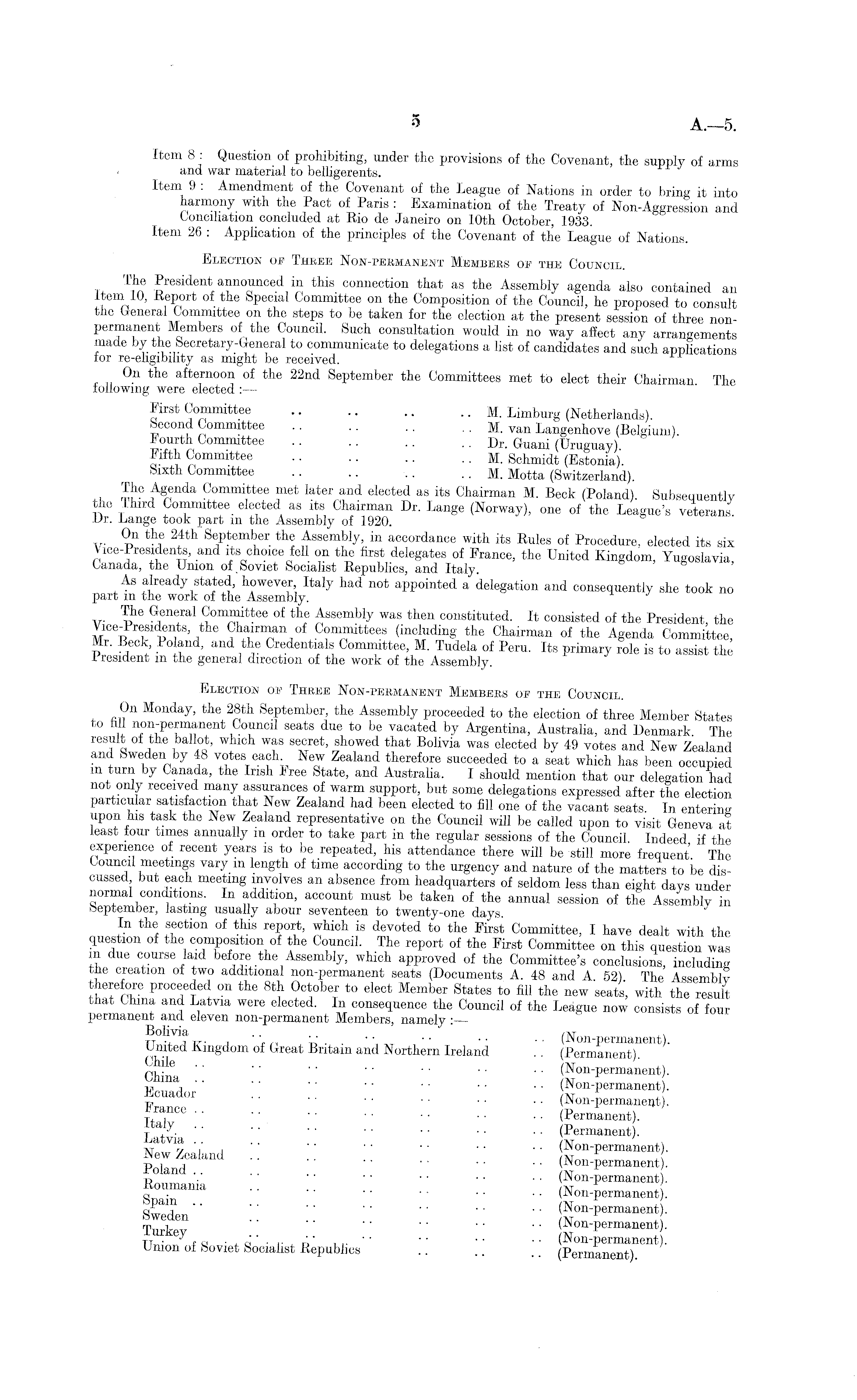 Item 8 : Question of prohibiting, under the provisions of the Covenant, the supply of arms and war material to belligerents. Item 9 : Amendment of the Covenant of the League of Nations in order to bring it into harmony with the Pact of Paris : Examination of the Treaty of Non-Aggression and Conciliation concluded at Rio de Janeiro on 10th October, 1933. Item 26 : Application of the principles of the Covenant of the League of Nations. Election of Three Non-permanent Members of the Council. , ' J 1 ® Resident announced in this connection that as the Assembly agenda also contained an , sen~5 en ~ ' , e P 0 . ™*e Special Committee on the Composition of the Council, he proposed to consult the General Committee on the steps to be taken for the election at the present session of three nonpermanent Members of the Council. Such consultation would in no way affect any arrangements made by the Secretary-General to communicate to delegations a list of candidates and such applications tor re-eligibility as might be received. On the afternoon of the 22nd September the Committees met to elect their Chairman The following were elected : — Birst Committee .. .. .. .. M. Limburg (Netherlands). Second Committee M. van Langenhove (Belgium). Fourth Committee Dr. Guani (Uruguay). Fifth Committee M. Schmidt (Estonia). Sixth Committee M. Motta (Switzerland). rī} 1 ® Ag ® nda Commi ttee met later and elected as its Chairman M. Beck (Poland). Subsequently the Ihird Committee elected as its Chairman Dr. Lange (Norway), one of the League's veterans Dr. Lange took part m the Assembly of 1920. On the 24th September the Assembly, in accordance with its Rules of Procedure, elected its six Vice-Presidents, and its choice fell on the first delegates of France, the United Kingdom, Yugoslavia Canada, the Union of , Soviet Socialist Republics, and Italy. As already stated, however, Italy had not appointed a delegation and consequently she took no part m the work of the Assembly. J ... T] 1 ® Genera l Committee of the Assembly was then constituted. It consisted of the President the Vice-Presidents the Chairman of Committees (including the Chairman of the Agenda Committee, Mr. Beck, Poland, and the Credentials Committee, M. Tudela of Peru. Its primary role is to assist the -President m the general direction of the work of the Assembly. Election of Three Non-permanent Members of the Council. On Monday, the 28th September the Assembly proceeded to the election of three Member States to 11 non-permanent Council seats due to be vacated by Argentina, Australia, and Denmark The result of the ballot, which was secret, showed that Bolivia was elected by 49 votes and New Zealand and Sweden by 48 votes each New Zealand therefore succeeded to a seat which has been occupied m turn by Canada, the Irish Iree State, and Australia. I should mention that our delegation had not only received many assurances of warm support, but some delegations expressed after the election particular satisfaction that New Zealand had been elected to fill one of the vacant seats In entering upon his task the New Zealand representative on the Council will be called upon to visit Geneva at least four tunes annually m order to take part in the regular sessions of the Council. Indeed if the experience of recent years is to be repeated, his attendance there will be still more frequent The Council meetings vary in length of time according to the urgency and nature of the matters to be discussed but each meeting involves an absence from headquarters of seldom less than eight days under normal conditions. In addition, account must be taken of the annual session of the Assemblv in beptember, lasting usually abour seventeen to twenty-one days. In the section of this report, which is devoted to the First Committee, I have dealt with the question of the composition of the Council. The report of the First Committee on this question was m due course laid before the Assembly, which approved of the Committee's conclusions, including tie creation of two additional non-permanent seats (Documents. A. 48 and A. 52). The Assemblv " e P rocee ded on the Bth October to elect Member States to fill the new seats, with the result that China and Latvia were elected. In consequence the Council of the League now consists of four permanent and eleven non-permanent Members, namely :— Bolivia ■ •• •• .. (Non-permanent). United Kingdom of Great Britain and Northern Ireland . . (Permanent). China i." (Non-permanent). Ecuador .. '• France .. .. " Ta . ' ' ' ' ' • • • • • • • • ■ (Permanent). Latvia ..... /at , x New Zealand .. .. Non-permanent . Poland.. .. " " •' '• Roumania .. .. Non-permanent. Spain .. .. '■ (Non-permanent). Sweden .. . Non-permanent. Turkey .. .. " " Union of Soviet Socialist Republics .. .. (Permanent) 1611
