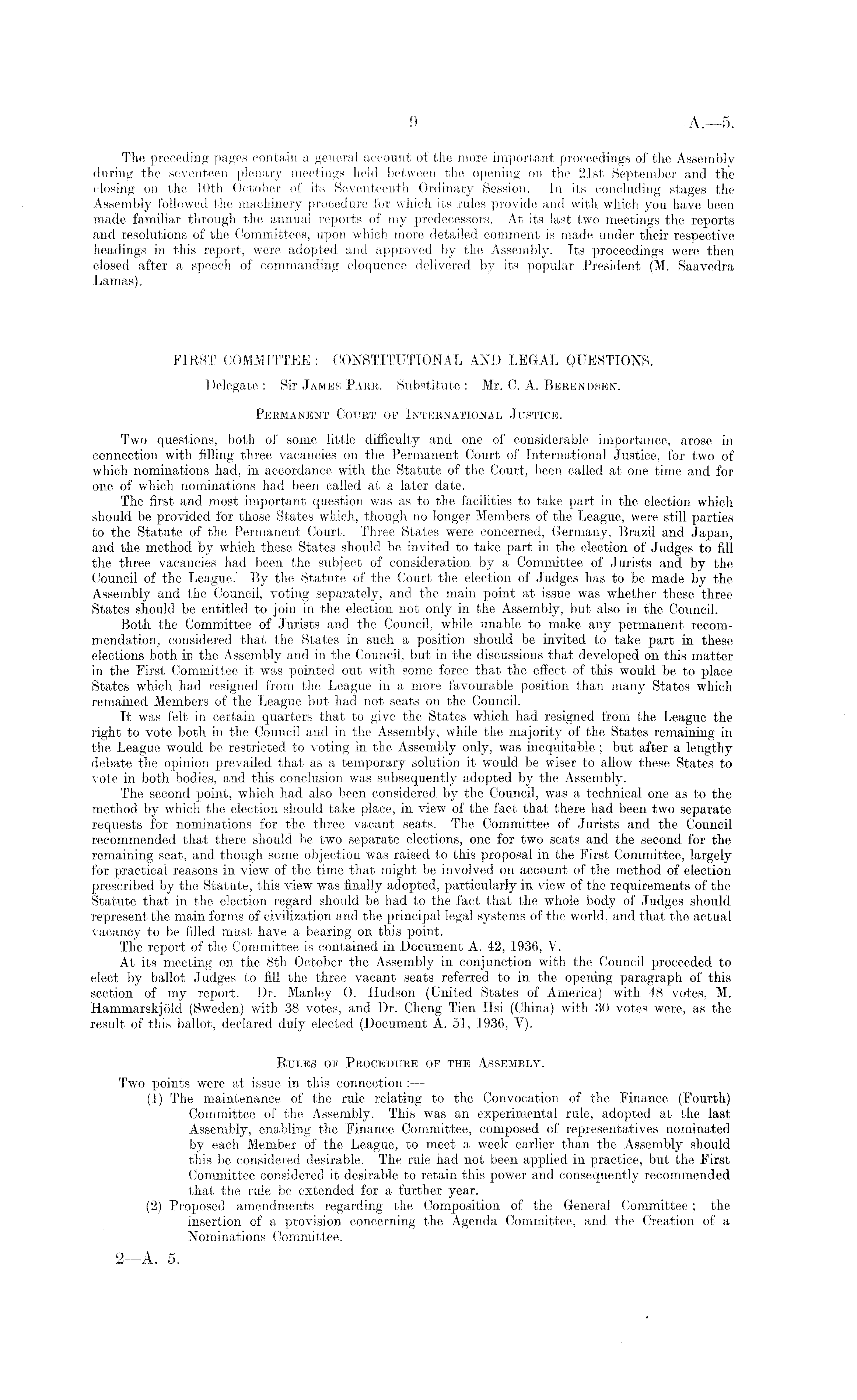 The preceding pages contain a general account of the more important proceedings of the Assembly during the seventeen plenary meetings held between the opening on the 21st September and the closing on the 10th October of its Seventeenth Ordinary Session. In its concluding stages the Assembly followed the machinery procedure for which its rules provide and with which you have been made familiar through the annual reports of my predecessors. At its last two meetings the reports and resolutions of the Committees, upon which more detailed comment is made under their respective headings in this report, were adopted and approved by the Assembly. Its proceedings were then closed after a speech of commanding eloquence delivered by its popular President (M. Saavedra Lamas). FIRST COMMITTEE : CONSTITUTIONAL AND LEGAL QUESTIONS. Delegate : Sir James Parr. Substitute : Mr. C. A. Berendsen. Permanent Court of International Justice. Two questions, both of some little difficulty and one of considerable importance, arose in connection with filling three vacancies on the Permanent Court of International Justice, for two of which nominations had, in accordance with the Statute of the Court, been called at one time and for one of which nominations had been called at a later date. The first and most important question was as to the facilities to take part in the election which should be provided for those States which, though no longer Members of the League, were still parties to the Statute of the Permanent Court. Three States were concerned, Germany, Brazil and Japan, and the method by which these States should be invited to take part in the election of Judges to fill the three vacancies had been the subject of consideration by a Committee of Jurists and by the Council of the League.' By the Statute of the Court the election of Judges has to be made by the Assembly and the Council, voting separately, and the main point at issue was whether these three States should be entitled to join in the election not only in the Assembly, but also in the Council. Both the Committee of Jurists and the Council, while unable to make any permanent recommendation, considered that the States in such a position should be invited to take part in these elections both in the Assembly and in the Council, but in the discussions that developed on this matter in the First Committee it was pointed out with some force that the eflect of this would be to place States which had resigned from the League in a more favourable position than many States which remained Members of the League but had not seats on the Council. It was felt in certain quarters that to give the States which had resigned from the League the right to vote both in the Council and in the Assembly, while the majority of the States remaining in the League would be restricted to voting in the Assembly only, was inequitable ; but after a lengthy debate the opinion prevailed that as a temporary solution it would be wiser to allow these States to vote in both bodies, and this conclusion was subsequently adopted by the Assembly. The second point, which had also been considered by the Council, was a technical one as to the method by which the election should take place, in view of the fact that there had been two separate requests for nominations for the three vacant seats. The Committee of Jurists and the Council recommended that there should be two separate elections, one for two seats and the second for the remaining seat, and though some objection was raised to this proposal in the First Committee, largely for practical reasons in view of the time that might be involved on account of the method of election prescribed by the Statute, this view was finally adopted, particularly in view of the requirements of the Statute that in the election regard should be had to the fact that the whole body of Judges should represent the main forms of civilization and the principal legal systems of the world, and that the actual vacancy to be filled must have a bearing on this point. The report of the Committee is contained in Document A. 42, 1936, V. At its meeting on the Bth October the Assembly in conjunction with the Council proceeded to elect by ballot Judges to fill the three vacant seats referred to in the opening paragraph of this section of my report. Dr. Manley 0. Hudson (United States of America) with 48 votes, M. Hammarskjold (Sweden) with 38 votes, and Dr. Cheng Tien Hsi (China) with 30 votes were, as the result of this ballot, declared duly elected (Document A. 51, 1936, Y). Rules of Procedure of the Assembly. Two points were at issue in this connection : — (1) The maintenance of the rule relating to the Convocation of the Finance (Fourth) Committee of the Assembly. This was an experimental rule, adopted at the last Assembly, enabling the Finance Committee, composed of representatives nominated by each Member of the League, to meet a week earlier than the Assembly should this be considered desirable. The rule had not been applied in practice, but the First Committee considered it desirable to retain this power and consequently recommended that the rule be extended for a further year. (2) Proposed amendments regarding the Composition of the General Committee ; the insertion of a provision concerning the Agenda Committee, and the Creation of a Nominations Committee.