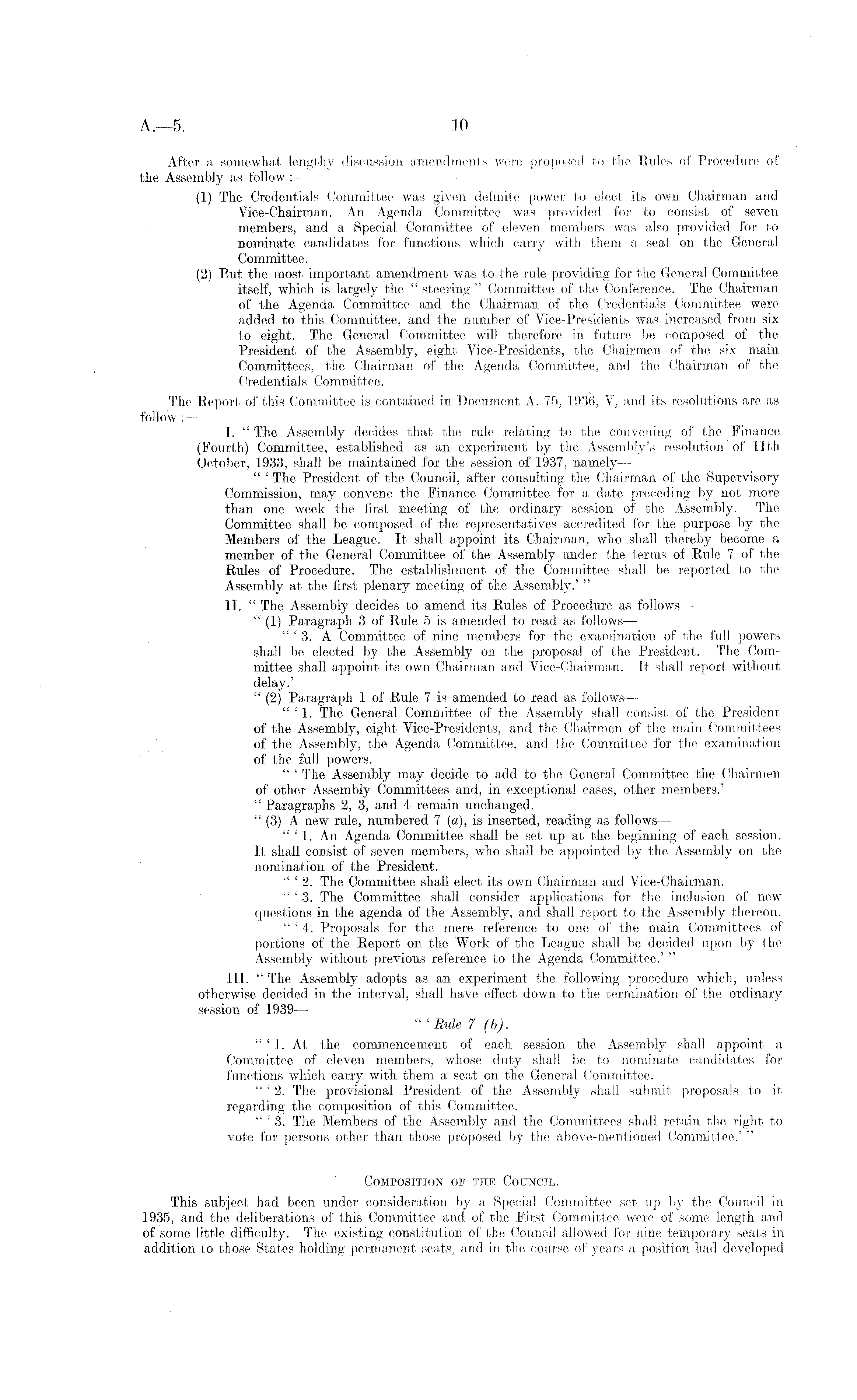 After a somewhat lengthy discussion amendments were proposed to the Exiles of Procedure of the Assembly as follow (1) The Credentials Committee was given definite power to elect its own Chairman and Vice-Chairman. An Agenda Committee was provided for to consist of seven members, and a Special Committee of eleven members was also provided for to nominate candidates for functions which carry with them a seat on the General Committee. (2) But the most important amendment was to the rule providing for the General Committee itself, which is largely the " steering " Committee of the Conference. The Chairman of the Agenda Committee and the Chairman of the Credentials Committee were added to this Committee, and the number of Vice-Presidents was jncreased from six to eight. The General Committee will therefore in future be composed of the President of the Assembly, eight. Vice-Presidents, the Chairmen of the six main Committees, the Chairman of the Agenda Committee, and the Chairman of the Credentials Committee. The Report of this Committee is contained in Document A. 75, 1936, V, and its resolutions are as follow :— I. " The Assembly decides that the rule relating to the convening of the Finance (Fourth) Committee, established as an experiment by the Assembly's resolution of 11th October, 1933, shall be maintained for the session of 1937, namely — " ' The President of the Council, after consulting the Chairman of the Supervisory Commission, may convene the Finance Committee for a date preceding by not more than one week the first meeting of the ordinary session of the Assembly. The Committee shall be composed of the representatives accredited for the purpose by the Members of the League. It shall appoint its Chairman, who .shall thereby become a member of the General Committee of the Assembly under the terms of Rule 7of the Rules of Procedure. The establishment of the Committee shall be reported to the Assembly at the first plenary meeting of the Assembly.' " IT. " The Assembly decides to amend its Rules of Procedure as follows — " (1) Paragraph 3 of Rule 5 is amended to read as follows — " ' 3. A Committee of nine members for the examination of the full powers shall be elected by the Assembly on the proposal of the President. The Committee shall appoint its own Chairman and Vice-Chairman. It shall report without delay.' " (2) Paragraph 1 of Rule 7 is amended to read as follows — " ' 1. The General Committee of the Assembly shall consist of the President of the Assembly, eight Vice-Presidents, and the Chairmen of the main Committees of the Assembly, the Agenda Committee, and the Committee for the examination of the full powers. " ' The Assembly may decide to add to the General Committee the Chairmen of other Assembly Committees and, in exceptional cases, other members.' " Paragraphs 2, 3, and 4 remain unchanged. " (3) A new rule, numbered 7 (a), is inserted, reading as follows — " ' 1. An Agenda Committee shall be set up at the beginning of each session. It shall consist of seven members, who shall be appointed by the Assembly on the nomination of the President. " ' 2. The Committee shall elect its own Chairman and Vice-Chairman. " '3. The Committee shall consider applications for the inclusion of new cpiestions in the agenda of the Assembly, and shall report to the Assembly thereon. " ' 4. Proposals for the mere reference to one of the main Committees of portions of the Report on the Work of the League shall be decided upon by the Assembly without previous reference to the Agenda Committee.' " 111. " The Assembly adopts as an experiment the following procedure which, unless otherwise decided in the interval, shall have effect down to the termination of the ordinary session of 1939 — "'Rule 7 (b). "' 1. At the commencement of each session the Assembly shall appoint a Committee of eleven members, whose duty shall be to nominate candidates for functions which carry with them a seat on the General Committee. " ' 2. The provisional President of the Assembly shall submit proposals to it regarding the composition of this Committee. " ' 3. The Members of the Assembly and the Committees shall retain the right to vote for persons other than those proposed by the above-mentioned Committee.' " Composition of the Council. This subject had been under consideration by a Special Committee set up by the Council in 1935, and the deliberations of this Committee and of the First Committee were of some length and of some little difficulty. The existing constitution of the Council allowed for nine temporary seats in addition to those States holding permanent seats, and in the course of years a position had developed