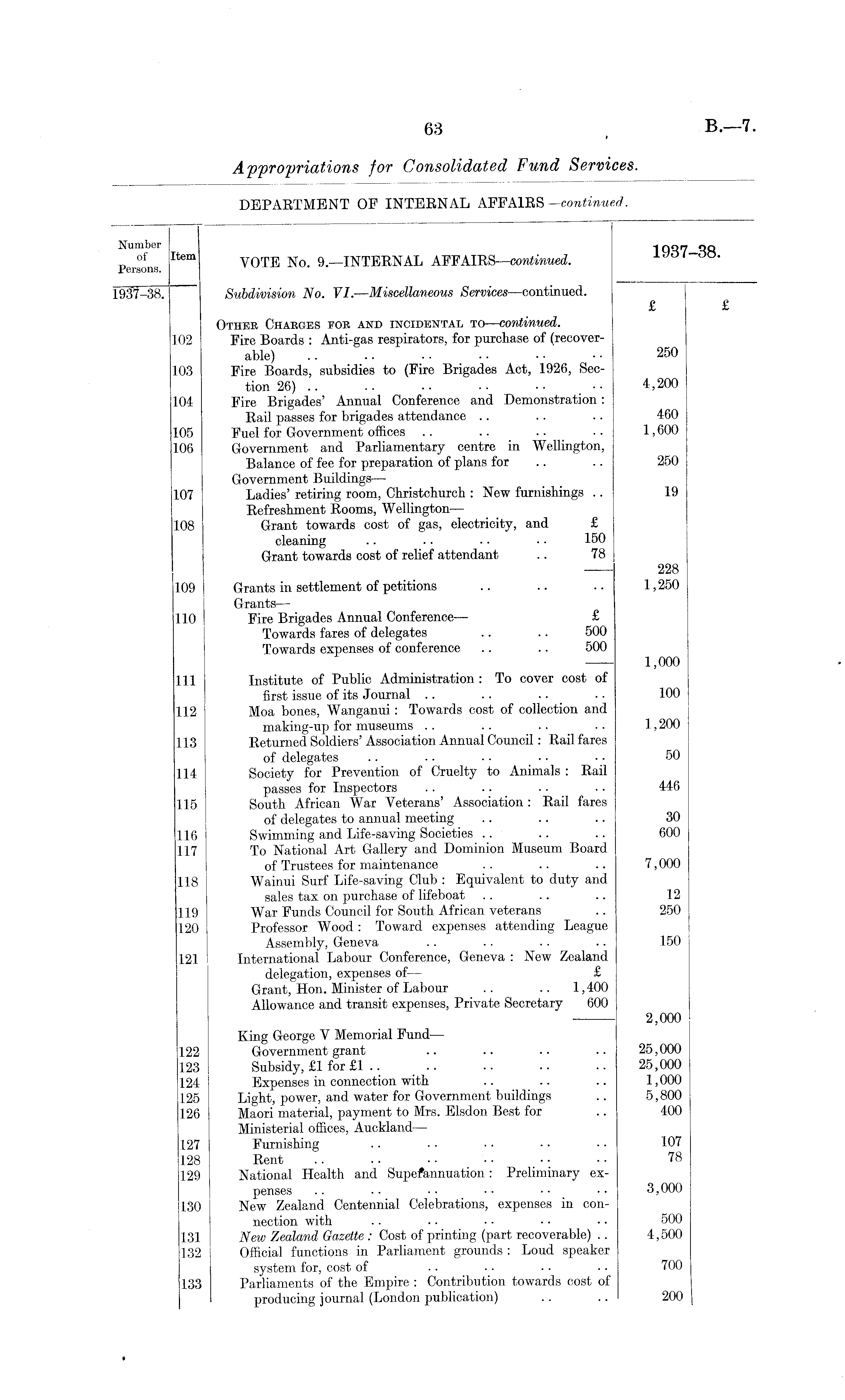 Number qqnqo Persons *** V0TE No - 9-—INTERNAL AFFAIRS —continued. ' °°* 1937-38. Subdivision No. VI.—Miscellaneous Services— continued. £ £ Other Charges for and incidental to—continued. 102 Fire Boards : Anti-gas respirators, for purchase of (recoverable) .. .. •■ •• • ■ • • 250 103 Fire Boards, subsidies to (Fire Brigades Act, 1926, Section 26) .. .. •• •• •• •• 4,200 104 Fire Brigades' Annual Conference and Demonstration: Rail passes for brigades attendance .. .. .. 460 105 Fuel for Government offices .. .. • • • • 1,600 106 Government and Parliamentary centre in Wellington, Balance of fee for preparation of plans for .. .. 250 Government Buildings — 107 Ladies' retiring room, Christchurch : New furnishings .. 19 Refreshment Rooms, Wellington — 108 Grant towards cost of gas, electricity, and £ cleaning .. .. • • • ■ 150 Grant towards cost of relief attendant .. 78 228 109 Grants in settlement of petitions .. .. .. 1,250 Grants — 110 Fire Brigades Annual Conference — £ Towards fares of delegates .. .. 500 Towards expenses of conference .. .. 500 1,000 111 Institute of Public Administration : To cover cost of first issue of its Journal .. .. .. ■ ■ 100 112 Moa bones, Wanganui: Towards cost of collection and making-up for museums .. .. .. .. 1,200 113 Returned Soldiers' Association Annual Council: Rail fares of delegates .. - - ■. • • • ■ 50 114 Society for Prevention of Cruelty to Animals : Rail passes for Inspectors . . .. .. .. 446 115 South African War Veterans' Association : Rail fares of delegates to annual meeting .. .. .. 30 116 Swimming and Life-saving Societies .. .. .. 600 117 To National Art Gallery and Dominion Museum Board of Trustees for maintenance .. .. .. 7,000 118 Wainui Surf Life-saving Club : Equivalent to duty and sales tax on purchase of lifeboat .. .. .. 12 119 War Funds Council for South African veterans .. 250 120 Professor Wood: Toward expenses attending League Assembly, Geneva .. .. .. .. 150 121 International Labour Conference, Geneva : New Zealand delegation, expenses of — £ Grant, Hon. Minister of Labour .. .. 1,400 Allowance and transit expenses, Private Secretary 600 2,000 King George V Memorial Fund — 122 Government grant .. .. .. .. 25,000 123 Subsidy, £1 for £1 .. .. .. .. .. 25,000 124 Expenses in connection with .. .. .. 1,000 125 Light, power, and water for Government buildings .. 5,800 126 Maori material, payment to Mrs. Elsdon Best for .. 400 Ministerial offices, Auckland — 127 Furnishing .. . • • • • • • • 107 128 Rent .. • • • ■ • • • • • • 78 129 National Health and Supefannuation: Preliminary expenses .. . ■ • ■ • • ■ • • • 3,000 130 New Zealand Centennial Celebrations, expenses in connection with .. .. • • • • • • 500 131 New Zealand Gazette : Cost of printing (part recoverable) .. 4,500 132 Official functions in Parliament grounds : Loud speaker system for, cost of .. • ■ ■ • • • 700 133 Parliaments of the Empire : Contribution towards cost of producing journal (London publication) .. .. 200