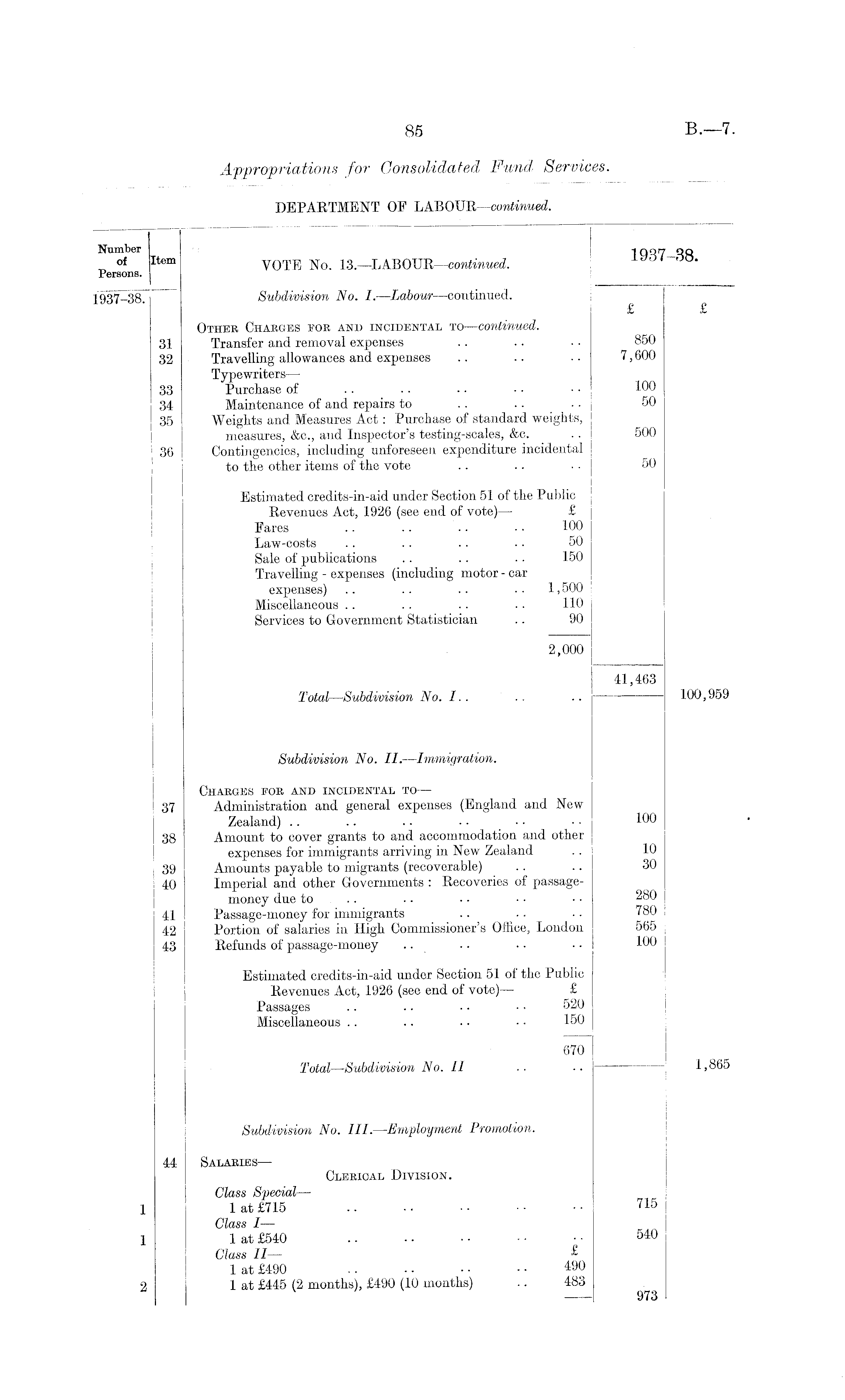 I Number i i qonqq „ of Item VOTE No. 13. —LABOUR —continued. Persons. 1937-38! Subdivision No. I. —Labour —continued. £ £ Other Charges for and incidental to —continued. 31 Transfer and removal expenses .. .. • • 850 32 Travelling allowances and expenses .. .. • • 7,600 Typewriters — 33 Purchase of .. . . • ■ • • • • 100 34 Maintenance of and repairs to . . .. • • 50 35 Weights and Measures Act: Purchase of standard weights, measures, &c., and Inspector's testing-scales, &c. . . 500 36 Contingencies, including unforeseen expenditure incidental to the other items of the vote .. .. • • 50 Estimated credits-in-aid under Section 51 of the Public Revenues Act, 1926 (see end of vote) — £ Fares .. .. .. ■ • 100 Law-costs . . . . .. .. 50 Sale of publications .. .. . . 150 Travelling - expenses (including motor - car expenses) .. .. .. • ■ 1,500 Miscellaneous .. . . .. ■ ■ 110 Services to Government Statistician .. 90 2,000 41,463 Total —Subdivision No. I.. .. .. 100,959 Subdivision No. II. —Immigration. Charges for and incidental to — 37 Administration and general expenses (England and New Zealand) .. .. . ■ • • ■ ■ • • 100 38 Amount to cover grants to and accommodation and other expenses for immigrants arriving in New Zealand . . 10 39 Amounts payable to migrants (recoverable) .. .. 30 40 Imperial and other Governments : Recoveries of passagemoney due to .. .. • • •• • • 280 41 Passage-money for immigrants .. ■ ■ • • 780 42 Portion of salaries in High Commissioner's Office, London 565 43 Refunds of passage-money .. .. • • • • 100 Estimated credits-in-aid under Section 51 of the Public Revenues Act, 1926 (see end of vote) — £ Passages .. .. • • • ■ 520 Miscellaneous .. .. • • • • 150 670 Total —Subdivision No. II .. .. j 1,865 Subdivision No. III. —Employment Promotion. 44 Salaries — Clerical Division. Glass Special — 1 1 at £715 7X5 Class I — 1 1 at £540 .. ■ • ■• •■ ■• 540 Class II— 1 at £490 .. •• • • ■ • 490 2 1 at £445 (2 months), £490 (10 months) .. 483 973