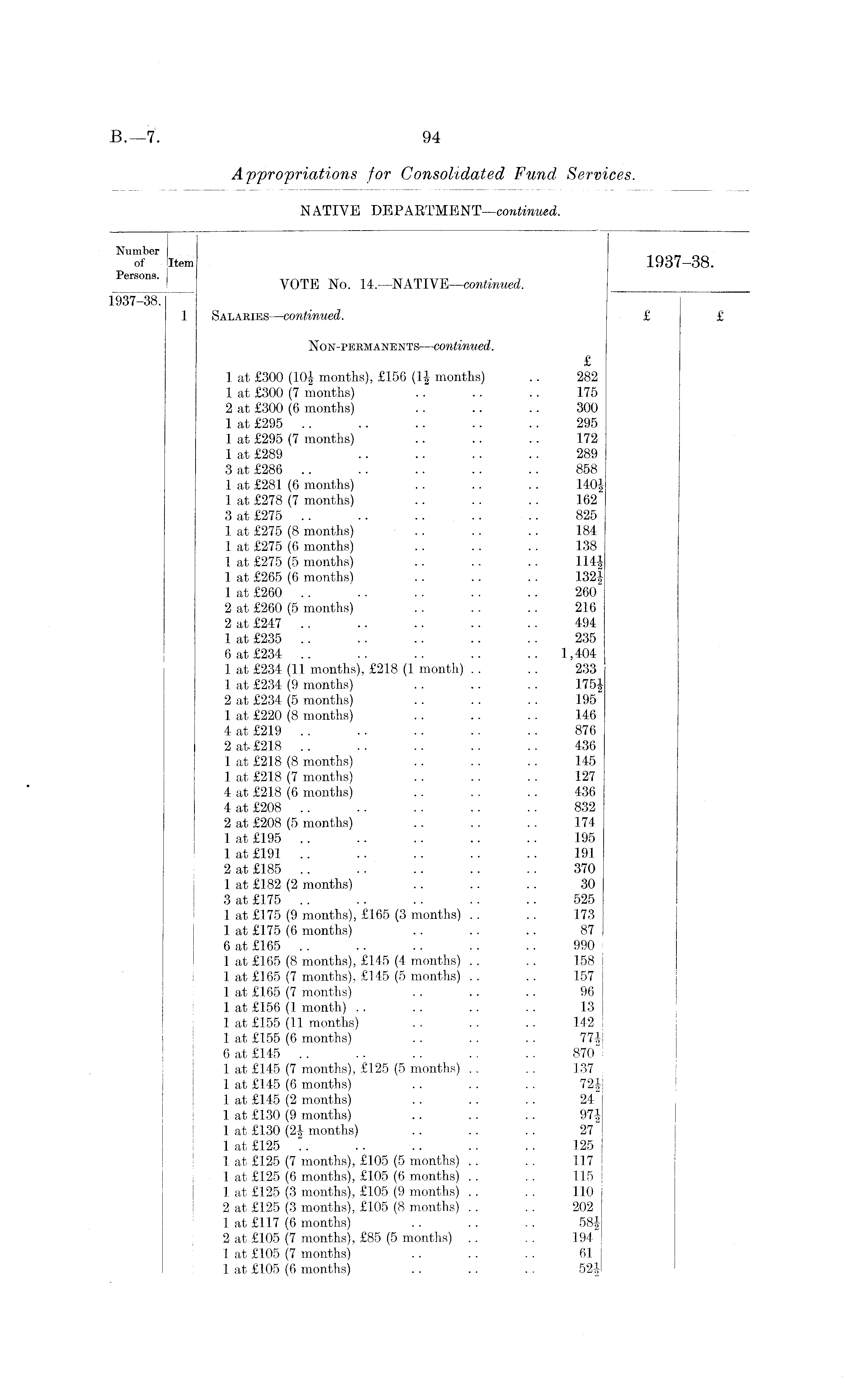 Number _ _ of Item 1937—38. PerSOna " __ VOTE No. 14. —NATIVE —continued. 1937-38. 1 Salabies —continued. £ £ Non-permanents—continued. £ 1 at £300 (10| months), £156 (1J months) .. 282 1 at £300 (7 months) .. .. . . 175 2 at £300 (6 months) . . .. .. 300 1 at £295 .. .. .. .. .. 295 1 at £295 (7 months) .. .. .. 172 1 at £289 .. .. .. .. 289 3 at £286 .. .. .. .. .. 858 1 at £281 (6 months) . . .. .. 140i> 1 at £278 (7 months) .. .. .. 162 3 at £275 .. .. .. .. .. 825 1 at £275 (8 months) . . .. .. 184 1 at £275 (6 months) . . .. .. 138 1 at £275 (5 months) .. .. .. 114J 1 at £265 (6 months) .. .. .. 132| 1 at £260 .. ' .. .. .. .. 260 2 at £260 (5 months) .. . . .. 216 2 at £247 .. .. .. .. .. 494 1 at £235 .. .. .. .. .. 235 6 at £234 .. .. .. .. .. 1,404 1 at £234 (11 months), £218 (1 month) . . .. 233 1 at £234 (9 months) . . .. .. 175| 2 at £234 (5 months) .. .. .. 195 1 at £220 (8 months) . . .. .. 146 4 at £219 .. .. .. .. .. 876 2 at £218 .. .. .. .. .. 436 1 at £218 (8 months) .. .. . . 145 1 at £218 (7 months) . . .. . . 127 4 at £218 (6 months) .. .. .. 436 4 at £208 .. .. .. .. .. 832 2 at £208 (5 months) .. . . . . 174 1 at £195 .. .. .. .. .. 195 1 at £191 .. .. .. .. .. 191 2 at £185 .. .. .. .. .. 370 1 at £182 (2 months) .. .. .. 30 3 at £175 .. .. .. .. .. 525 1 at £175 (9 months), £165 (3 months) . . . . 173 1 at £175 (6 months) .. .. .. 87 6 at £165 .. .. .. .. .. 990 1 at £165 (8 months), £145 (4 months) . . . . 158 1 at £165 (7 months), £145 (5 months) . . . . 157 1 at £165 (7 months) .. .. .. 96 1 at £156 (1 month) . . . . .. . . 13 1 at £155 (11 months) . . . . . . 142 1 at £155 (6 months) . . . . .. Hi 6 at £145 .. .. .. .. .. 870" 1 at £145 (7 months), £125 (5 months) .. .. 137 1 at £145 (6 months) .. .. .. 72-| 1 at £145 (2 months) .. .. . . 24 1 at £130 (9 months) .. .. .. 97i 1 at £130 (2| months) .. .. .. 27" 1 at £125 .. .. .. .. .. 125 1 at £125 (7 months), £105 (5 months) . . .. 117 1 at £125 (6 months), £105 (6 months) . . .. 115 1 at £125 (3 months), £105 (9 months) . . . . 110 2 at £125 (3 months), £105 (8 months) .. . . 202 1 at £117 (6 months) .. .. . . 58| 2 at £105 (7 months), £85 (5 months) .. . . 194 1 at £105 (7 months) .. .. . . 61 1 at £105 (6 months) .. .. . . 52|