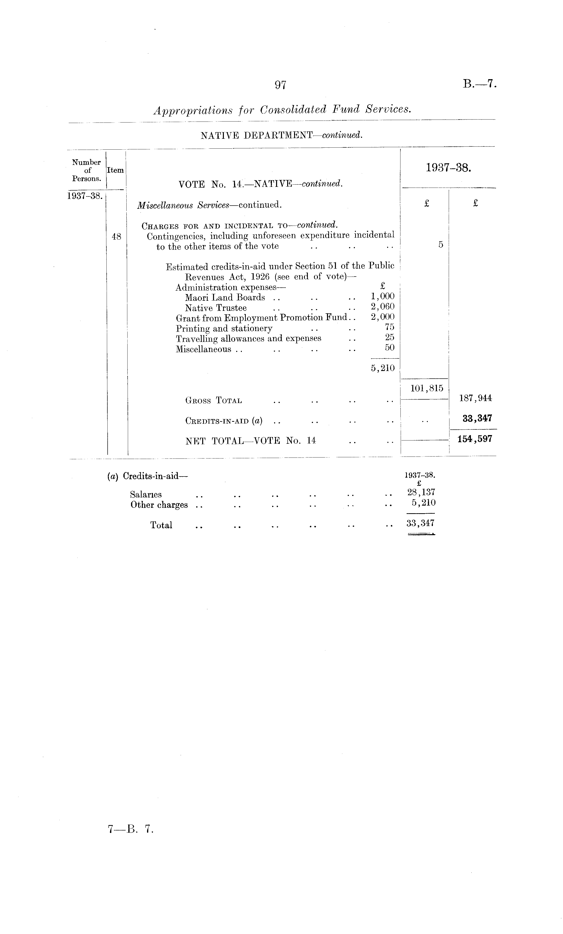 Number 1QQ7 QO of Item lyoi-oo. Persons " VOTE No. 14. —NATIVE —continued. _ 1937-38. Miscellaneous Services —continued. £ £ Charges for and incidental to —continued. 48 Contingencies, including unforeseen expenditure incidental to the other items of the vote .. .. . • 5 Estimated credits-in-aid under Section 51 of the Public Bevenues Act, 1926 (see end of vote) — Administration expenses — £ Maori Land Boards .. .. .. 1,000 Native Trustee .. .. •• 2,060 Grant from Employment Promotion Fund.. 2,000 Printing and stationery .. .. 75 Travelling allowances and expenses .. 25 Miscellaneous .. .. .. • • 50 5,210 101,815 GROSS Total .. .. .. •• 187,944 Credits-in-aid (a) ., .. .. •• •• 33,347 NET TOTAL—VOTE No. 14 .. .. 154,597