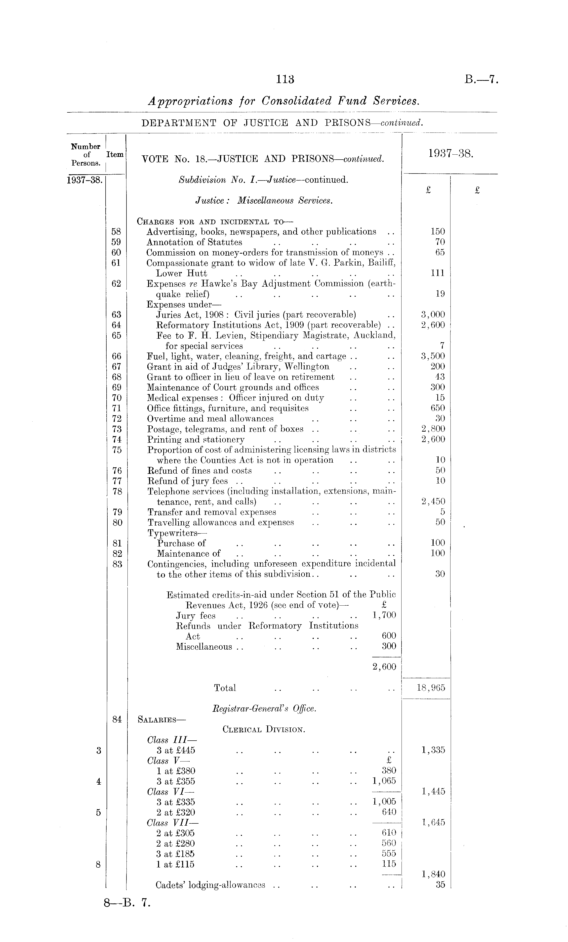 Number I Persons. V0TE No - 18.—JUSTICE AND PRISONS —continued. 1937-38. 1937-38. Subdivision No. I. —Justice—continued. £ £ Justice: Miscellaneous Services. Charges fob and incidental to — 58 Advertising, books, newspapers, and other publications .. 150 59 Annotation of Statutes .. .. . . .. 70 60 Commission on money-orders for transmission of moneys .. 65 61 Compassionate grant to widow of late V. G. Parkin, Bailiff, Lower Hutt .. .. .. . . .. Ill 62 Expenses re Hawke's Bay Adjustment Commission (earthquake relief) .. . . .. .. .. 19 Expenses under — 63 Juries Act, 1908 : Civil juries (part recoverable) .. 3,000 64 Reformatory Institutions Act, 1909 (part recoverable) .. 2,600 65 Fee to E. H. Levien, Stipendiary Magistrate, Auckland, for special services . . .. .. .. 7 66 Fuel, light, water, cleaning, freight, and cartage .. .. 3,500 67 Grant in aid of Judges' Library, Wellington .. .. 200 68 Grant to officer in lieu of leave on retirement .. .. 43 69 Maintenance of Court grounds and offices .. .. .300 70 Medical expenses : Officer injured on duty . . .. 15 71 Office fittings, furniture, and requisites .. .. 650 72 Overtime and meal allowances .. .. .. 30 73 Postage, telegrams, and rent of boxes .. .. .. 2,800 74 Printing and stationery .. .. .. .. 2,600 75 Proportion of cost of administering licensing laws in districts where the Counties Act is not in operation .. .. 10 76 Refund of fines and costs .. .. .. .. 50 77 Refund of jury fees .. .. .. .. . . 10 78 Telephone services (including installation, extensions, maintenance, rent, and calls) . . .. .. .. 2,450 79 Transfer and removal expenses .. .. .. 5 80 Travelling allowances and expenses .. .. .. 50 Typewriters — 81 Purchase of .. .. .. .. .. 100 82 Maintenance of . . .. .. .. 100 83 Contingencies, including unforeseen expenditure incidental to the other items of this subdivision.. .. .. 30 Estimated credits-in-aid under Seetion 51 of the Public Revenues Act, 1926 (see end of vote) — £ Jury fees .. .. .. .. 1,700 Refunds under Reformatory Institutions Act .. .. .. .. 600 Miscellaneous . . .. .. .. 300 2,600 Total .. .. .. .. 18,965 Registrar-General's Office. 84 Salaries — Clerical Division. Class III — 3 3 at £445 .. .. .. .. .. 1,335 Class V— £ 1 at £380 .. .. .. .. 380 4 3 at £355 .. .. .. .. 1,065 Class VI — 1,445 3 at £335 .. .. .. .. 1,005 5 2 at £320 .. .. .. .. 640 Class VII— 1,645 2 at £305 .. .. .. .. 610 2 at £280 .. .. .. 560 3 at £185 .. .. .. .. 555 8 1 at £115 .. .. .. .. 115 1,840 Cadets' lodging-allowances .. .. .. .. 35