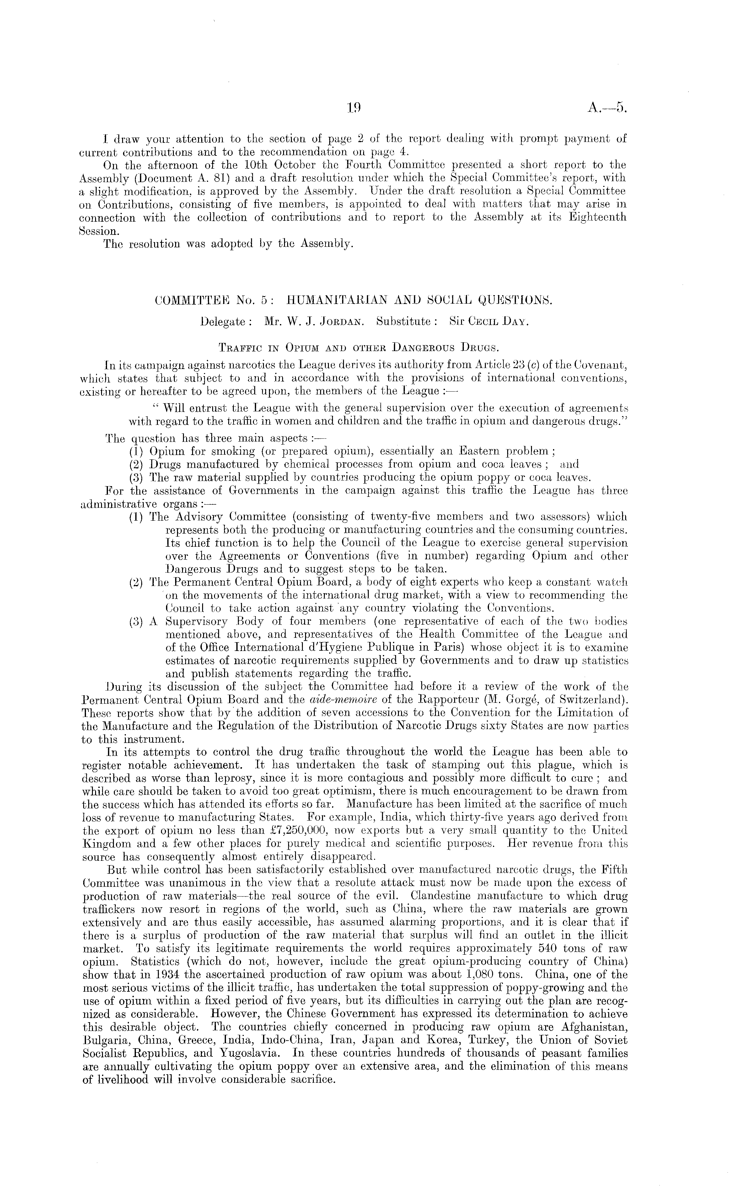 I draw your attention, to the section of page 2 of the report dealing with prompt payment of current contributions and to the recommendation on page 4. On the afternoon of the 10th October the Fourth Committee presented a short report to the Assembly (Document A. 81) and a draft resolution under which the Special Committee's report, with a slight modification, is approved by the Assembly. Under the draft resolution a Special Committee on Contributions, consisting of five members, is appointed to deal with matters that may arise in connection with the collection of contributions and to report to the Assembly at its Eighteenth Session. The resolution was adopted by the Assembly. COMMITTEE No. 5 : HUMANITARIAN AND SOCIAL QUESTIONS. Delegate : Mr. W. J. Jordan. Substitute : Sir Cecil Day. Traffic in Opium and other Dangerous Drugs. In its campaign against narcotics the League derives its authority from Article 23 (c) of the Covenant, which states that subject to and in accordance with the provisions of international conventions, existing or hereafter to be agreed upon, the members of the League : — " Will entrust the League with the general supervision over the execution of agreements with regard to the traffic in women and children and the traffic in opium and dangerous drugs." The question has three main aspects : — (1) Opium for smoking (or prepared opium), essentially an Eastern problem ; (2) Drugs manufactured by chemical processes from opium and coca leaves ; and (3) The raw material supplied by countries producing the opium poppy or coca leaves. For the assistance of Governments in the campaign against this traffic the League has three administrative organs : — (1) The Advisory Committee (consisting of twenty-five members and two assessors) which represents both the producing or manufacturing countries and the consuming countries. Its chief function is to help the Council of the League to exercise general supervision over the Agreements or Conventions (five in number) regarding Opium and other Dangerous Drugs and to suggest steps to be taken. (2) The Permanent Central Opium Board, a body of eight experts who keep a constant watch 'on the movements of the international drug market, with a view to recommending the Council to take action against "any country violating the Conventions. (3) A Supervisory Body of four members (one representative of each of the two bodies mentioned above, and representatives of the Health Committee of the League and of the Office International d'Hygiene Publique in Paris) whose object it is to examine estimates of narcotic requirements supplied by Governments and to draw up statistics and publish statements regarding the traffic. During its discussion of the subject the Committee had before it a review of the work of the Permanent Central Opium Board and the aide-memoire of the Rapporteur (M. Gorge, of Switzerland). These reports show that by the addition of seven accessions to the Convention for the Limitation of the Manufacture and the Regulation of the Distribution of Narcotic Drugs sixty States are now parties to this instrument. In its attempts to control the drug traffic throughout the world the League has been able to register notable achievement. It has undertaken the task of stamping out this plague, which is described as w'orse than leprosy, since it is more contagious and possibly more difficult to cure ; and while care should be taken to avoid too great optimism, there is much encouragement to be drawn from the success which has attended its efforts so far. Manufacture has been limited at the sacrifice of much loss of revenue to manufacturing States. For example, India, which thirty-five years ago derived from the export of opium no less than £7,250,000, now exports but a very small quantity to the United Kingdom and a few other places for purely medical and scientific purposes. Her revenue from this source has consequently almost entirely disappeared. But while control has been satisfactorily established over manufactured narcotic drugs, the Fifth Committee was unanimous in the view that a resolute attack must now be made upon the excess of production of raw materials —the real source of the evil. Clandestine manufacture to which drug traffickers now resort in regions of the world, such as China, where the raw materials are grown extensively and are thus easily accessible, has assumed alarming proportions, and it is clear that if there is a surplus of production of the raw material that surplus will find an outlet in the illicit market. To satisfy its legitimate requirements the world requires approximately 540 tons of raw opium. Statistics (which do not, however, include the great opium-producing country of China) show that in 1934 the ascertained production of raw opium was about 1,080 tons. China, one of the most serious victims of the illicit traffic, has undertaken the total suppression of poppy-growing and the use of opium within a fixed period of five years, but its difficulties in carrying out the plan are recognized as considerable. However, the Chinese Government has expressed its determination to achieve this desirable object. The countries chiefly concerned in producing raw opium are Afghanistan, Bulgaria, China, Greece, India, Indo-China, Iran, Japan and Korea, Turkey, the Union of Soviet Socialist Republics, and Yugoslavia. In these countries hundreds of thousands of peasant families are annually cultivating the opium poppy over an extensive area, and the elimination of this means of livelihood will involve considerable sacrifice.