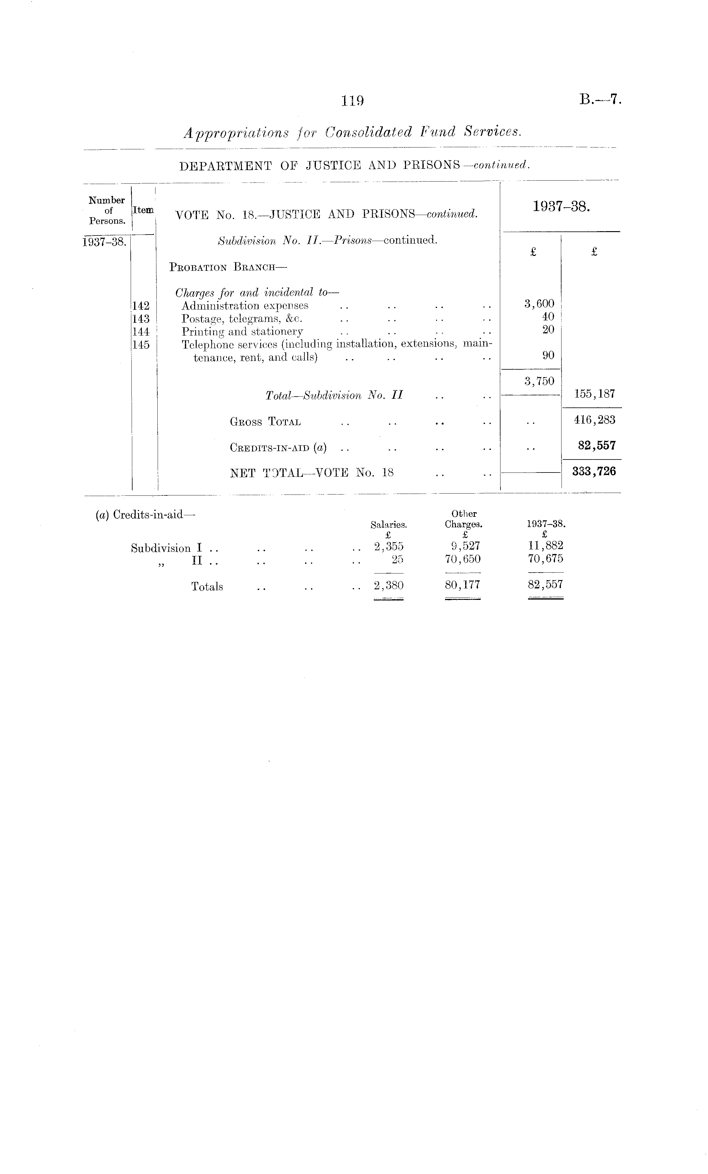 (a) Credits-in-aid — Other Salaries. Charges. 1937-38. £ £ £ Subdivision I .. .. ■ • 2,355 9,527 11,882 II .. .. .. .. 25 70,650 70,675 Totals 2,380 80,177 82,557