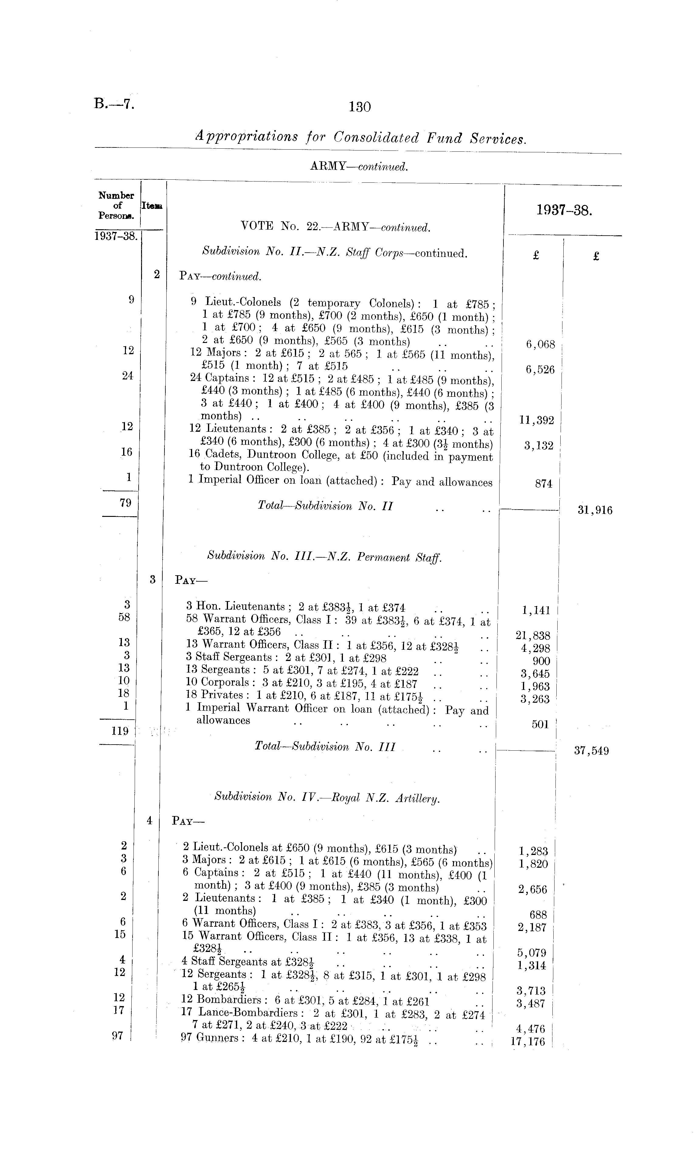 Number Perl, 1937-38. VOTE No. 22. —ARMY—continued. ] 937-38. Subdivision No. II.—N.Z. Staff Corps—continued. £ £ 2 Pay—continued. 9 9 Lieut.-Colonels (2 temporary Colonels) : 1 at £785 ; 1 at £785 (9 months), £700 (2 months), £650 (1 month) ; 1 at £700 ; 4 at £650 (9 months), £615 (3 months) ; 2 at £650 (9 months), £565 (3 months) .. .. 6 068 12 12 Majors : 2 at £615 ; 2 at 565 ; 1 at £565 (11 months), £515 (1 month) ; 7 at £515 .. .. . . g 526 24 24 Captains : 12 at £515 ; 2 at £485 ; 1 at £485 (9 months), £440 (3 months) ; 1 at £485 (6 months), £440 (6 months) ; 3 at £440; 1 at £400 ; 4 at £400 (9 months), £385 (3 months) .. .. .. .. _ 302 12 12 Lieutenants : 2 at £385 ; 2 at £356 ; 1 at £340 ; 3 at £340 (6 months), £300 (6 months) ; 4 at £300 (3| months) 3,132 16 16 Cadets, Duntroon College, at £50 (included in payment to Duntroon College). 1 1 Imperial Officer on loan, (attached) : Pay and allowances 874 79 Total—Subdivision No. II .. .. gjg Subdivision No. III.—N.Z. Permanent Staff. 3 Pay— 3 3 Hon. Lieutenants ; 2 at 1 at £374 .. .. 1,141 58 58 Warrant Officers, Class I : 39 at £383A, 6 at £374, 1 at £365, 12 at £356 .. .. .. .. .. 21 838 13 13 Warrant Officers, Class II : 1 at £356, 12 at £328| .. 4'298 3 3 Staff Sergeants : 2 at £301, 1 at £298 .. .. '900 I 3 13 Sergeants : 5 at £301, 7 at £274, 1 at £222 .. .. 3 645 1° 10 Corporals : 3 at £210, 3 at £195, 4 at £187 .. .. 1 '963 18 18 Privates: 1 at £210, 6 at £187, 11 at £175| .. .. 3*263 1 1 Imperial Warrant Officer on loan (attached) : Pay and — allowances ... m 1 119 ōUI 1 Total—Subdivision No. Ill .. .. ! 37 549 Subdivision No. IV.—Royal N.Z. Artillery. ■ 4 Pay— 2 2 Lieut.-Colonels at £650 (9 months), £615 (3 months) .. 1,283 3 3 Majors : 2 at £615 ; 1 at £615 (6 months), £565 (6 months) 1,820 6 6 Captains: 2 at £515 ; 1 at £440 (11 months), £400 (1 month) ; 3 at £400 (9 months), £385 (3 months) . . 2,656 ' 2 2 Lieutenants: 1 at £385; 1 at £340 (1 month), £300 (11 months) .. .. .. . 0gg 6 6 Warrant Officers, Class 1: 2 at £383, 3 at £356, 1 at £353 2,187 I 5 15 Warrant Officers, Class II: 1 at £356, 13 at £338, 1 at £328| .. .. .. .. _ _ _ _ g 079 4 4 Staff Sergeants at £328J .. .. .. .. l'314 12 12 Sergeants : 1 at £328|, 8 at £315, 1 at £301, 1 at £298 1 at £265|- .... . 3 7^3 12 12 Bombardiers : 6 at £301, 5 at £284, 1 at £261 .. 3 ,'487 I 7 17 Lance-Bombardiers: 2 at £301, 1 at £283, 2 at £274 7 at £271, 2 at £240, 3 at £222 ... .. 4476 I 1 97 Gunners : 4 at £210, 1 at £190, 92 at £175J .. .! 17' 176