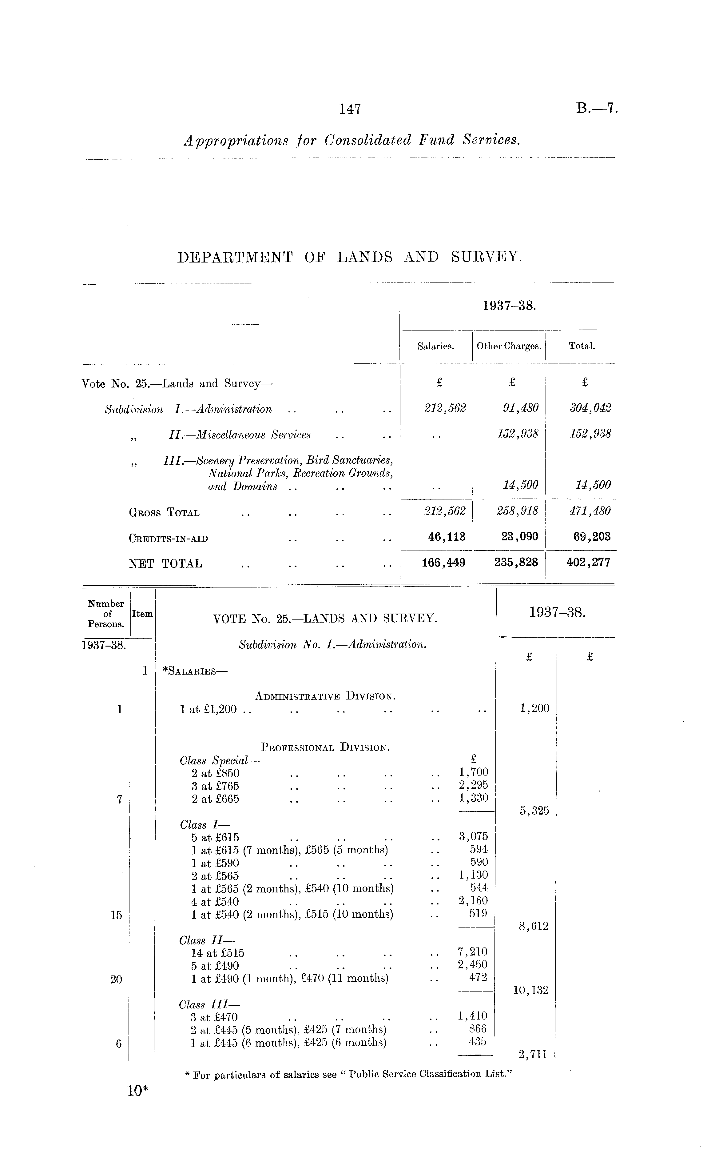 1937-38. Salaries. Other Charges. Total. Vote No. 25. —Lands and Survey— £ £ £ Subdivision I. —Administration .. .. .. 212,562 91,480 304,042 „ II. —Miscellaneous Services .. .. .. 152,938 152,938 „ III. —Scenery Preservation, Bird Sanctuaries, National ParTcs, Recreation Grounds, and Domains .. .. .. .. 14,500 14,500 GROSS Total 212,562 258,918 471,480 Credits-IN-aid .. .. .. 46,113 23,090 69,203 NET TOTAL .. .. .. .. 166,449 235,828 402,277 Number Persons. IUm Y0TE No - 25,—LANDS AND SURVEY. 19d7-38. 1937-38. Subdivision No. I.—Administration. £ £ 1 *Salabies— Administrative Division. 1 1 at £1,200.. .. .. .. .. •. 1,200 Professional Division. Class Special — £ 2 at £850 .. .. .. .. 1,700 3 at £765 .. .. .. .. 2,295 7 2 at £665 .. .. .. .. 1,330 5,325 Class I — 5 at £615 .. .. .. .. 3,075 1 at £615 (7 months), £565 (5 months) .. 594 1 at £590 .. .. .. •• 590 2 at £565 .. .. .. •• 1,130 1 at £565 (2 months), £540 (10 months) .. 544 4 at £540 2,160 15 1 at £540 (2 months), £515 (10 months) .. 519 8,612 Class II — 14 at £515 .. .. .. 7,210 5 at £490 .. .. .. .. 2,450 20 1 at £490 (1 month), £470 (11 months) .. 472 10,132 Class III — 3 at £470 .. .. .. .. 1,410 2 at £445 (5 months), £425 (7 months) .. 866 6 1 at £445 (6 months), £425 (6 months) .. 435 2,711 * For particulars of salaries see " Public Service Classification List." 10*