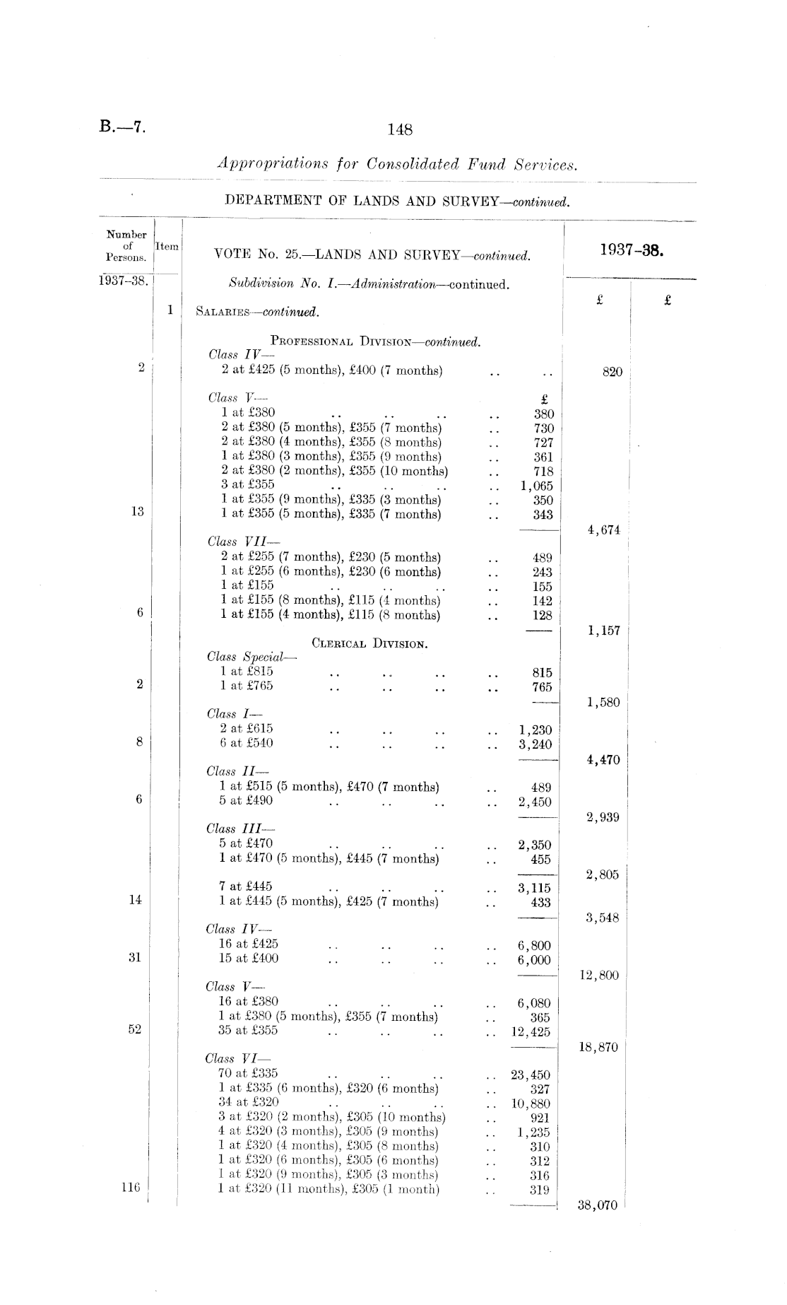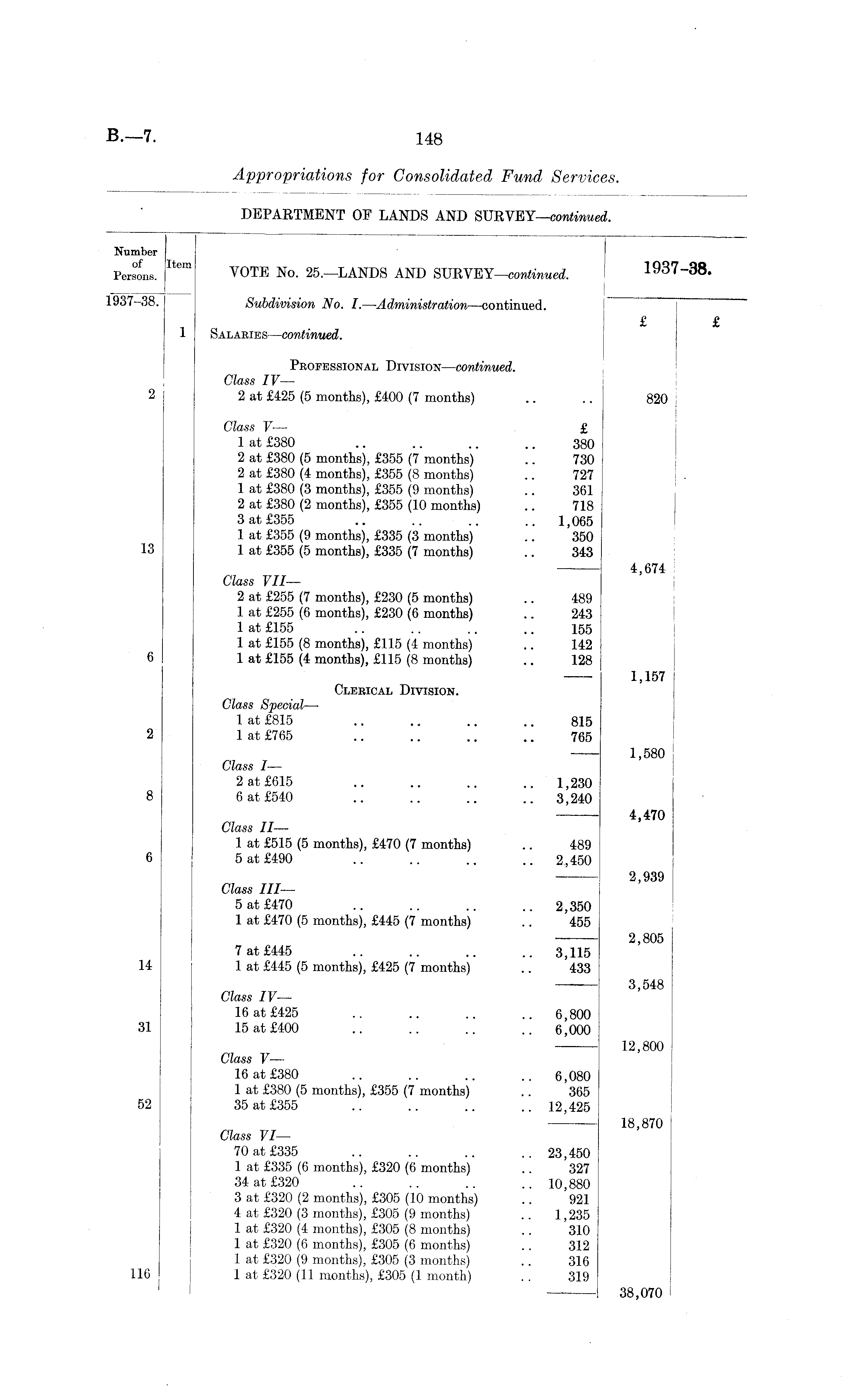 Number Persons. VOTE No. 25. —LANDS AND SURVEY—continued. 1937—38. 1937-38. Subdivision No. I.—Administration—continued. £ £ 1 Salaries—continued. Professional Division—continued. Class IV— 2 2 at £425 (5 months), £400 (7 months) .. .. 820 ' Class V— £ 1 at £380 .. .. .. .. 380 2 at £380 (5 months), £355 (7 months) .. 730 2 at £380 (4 months), £355 (8 months) .. 727 1 at £380 (3 months), £355 (9 months) .. 361 2 at £380 (2 months), £355 (10 months) .. 718 3 at £355 .. .. .. .. 1,065 1 at £355 (9 months), £335 (3 months) .. 350 13 1 at £355 (5 months), £335 (7 months) .. 343 4,674 Class VII— 2 at £255 (7 months), £230 (5 months) .. 489 1 at £255 (6 months), £230 (6 months) .. 243 1 at £155 .. .. .. .. 155 1 at £155 (8 months), £115 (4 months) .. 142 6 1 at £155 (4 months), £115 (8 months) .. 128 1,157 Clerical Division. Class Special —■ 1 at £815 .. .. .. .. 815 2 1 at £765 .. .. .. .. 765 1,580 Class I— 2 at £615 .. .. .. .. 1,230 8 6 at £540 .. .. .. .. 3,240 4,470 Class II — 1 at £515 (5 months), £470 (7 months) .. 489 6 5 at £490 .. .. .. .. 2 ,450 2,939 Class III— 5 at £470 .. .. .. .. 2,350 1 at £470 (5 months), £445 (7 months) .. 455 2,805 7 at £445 .. .. .. .. 3,115 14 1 at £445 (5 months), £425 (7 months) .. 433 — 3,548 Class IV— 16 at £425 .. .. .. .. 6,800 31 15 at £400 .. .. .. .. 6,000 12,800 Class V— 16 at £380 .. .. .. .. 6,080 1 at £380 (5 months), £355 (7 months) .. 365 52 35 at £355 .. .. .. .. 12,425 18,870 Class VI— 70 at £335 .. .. .. .. 23,450 1 at £335 (6 months), £320 (6 months) .. 327 34- at £320 .. .. .. .. 10,880 3 at £320 (2 months), £305 (10 months) .. 921 4 at £320 (3 months), £305 (9 months) .. 1,235 1 at £320 (4 months), £305 (8 months) .. 310 1 at £320 (6 months), £305 (6 months) .. 312 1 at £320 (9 months), £305 (3 months) .. 316 116 1 at £320 (11 months), £305 (1 month) . . 319 1 38,070