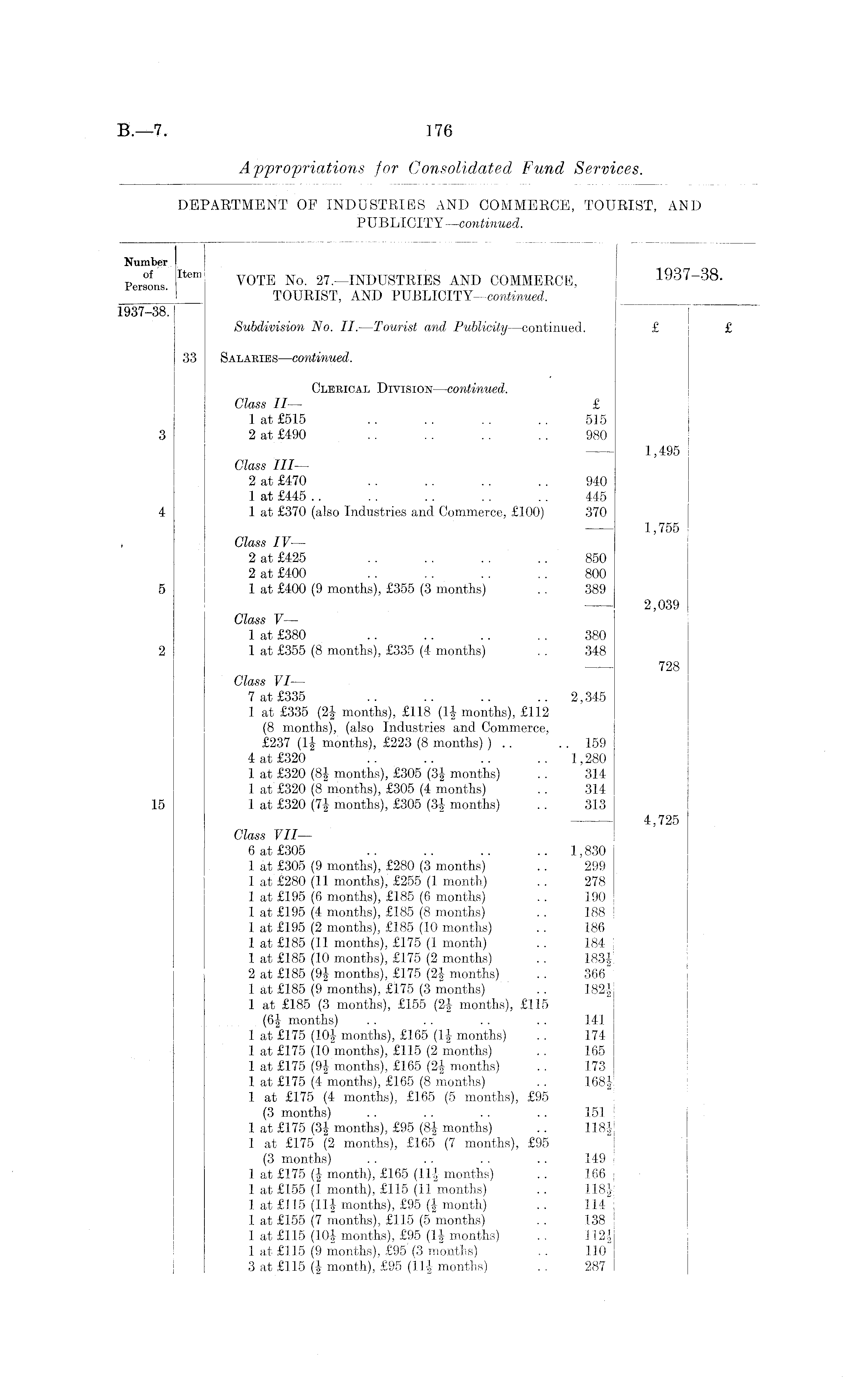 Number Persons I V0TE No - 27,—INDUSTRIES AND COMMERCE, 1937-38. • I TOURIST, AND PUBLICITY—continued. 1937-38. Subdivision No. II. —Tourist and Publicity—continued. £ £ 33 Salaries —continued. Clerical Division—continued. Class II — £ 1 at £515 .. .. .. .. 515 3 2 at £490 .. .. .. .. 980 1,495 Class III— 2 at £470 .. .. .. .. 940 1 at £445 .. .. .. .. .. 445 4 1 at £370 (also Industries and Commerce, £100) 370 1,755 Class IV— 2 at £425 .. .. .. .. 850 2 at £400 .. .. .. .. 800 5 1 at £400 (9 months), £355 (3 months) .. 389 2,039 Class V— 1 at £380 .. .. .. .. 380 2 1 at £355 (8 months), £335 (4 months) .. 348 728 Class VI— 7 at £335 .. .. .. .. 2,345 1 at £335 (2|- months), £118 (If months), £112 (8 months), (also Industries and Commerce, £237 (If months), £223 (8 months) ) .. .. 159 4 at £320 .. .. .. .. 1,280 1 at £320 (81 months), £305 (3f months) .. 314 1 at £320 (8 months), £305 (4 months) .. 314 15 1 at £320 (7f months), £305 (3f months) . . 313 4,725 Class VII — 6 at £305 .. .. .. .. 1,830 1 at £305 (9 months), £280 (3 months) .. 299 1 at £280 (11 months), £255 (1 month) .. 278 1 at £195 (6 months), £185 (6 months) .. 190 1 at £195 (4 months), £185 (8 months) .. 188 1 at £195 (2 months), £185 (10 months) .. 186 1 at £185 (11 months), £175 (1 month) .. 184 1 at £185 (10 months), £175 (2 months) .. 183f 2 at £185 (9f months), £175 (2f months) .. 366 1 at £185 (9 months), £175 (3 months) . . 182f 1 at £185 (3 months), £155 (2f months), £115 (6f months) . . .. . . .. 141 1 at £175 (lOf months), £165 (If months) . . 174 1 at £175 (10 months), £115 (2 months) .. 165 1 at £175 (9f months), £165 (2f months) .. 173 1 at £175 (4 months), £165 (8 months) . . 168f 1 at £175 (4 months), £165 (5 months), £95 (3 months) .. . . . . .. 151 1 at £175 (3f months), £95 (8f months) .. 118f 1 at £175 (2 months), £165 (7 months), £95 (3 months) . . . . . . .. 149 1 at £175 (f month), £165 (llf months) . . 166 1 at £155 (1 month), £115 (11 months) .. 118f 1 at £115 (llf months), £95 (f month) . . 114 1 at £155 (7 months), £115 (5 months) . . 138 1 at £115 (10f months), £95 (If months) . . 112f 1 at £115 (9 months), £95 (3 months) . . 110 3 at £115 (f month), £95 (llf months) .. 287