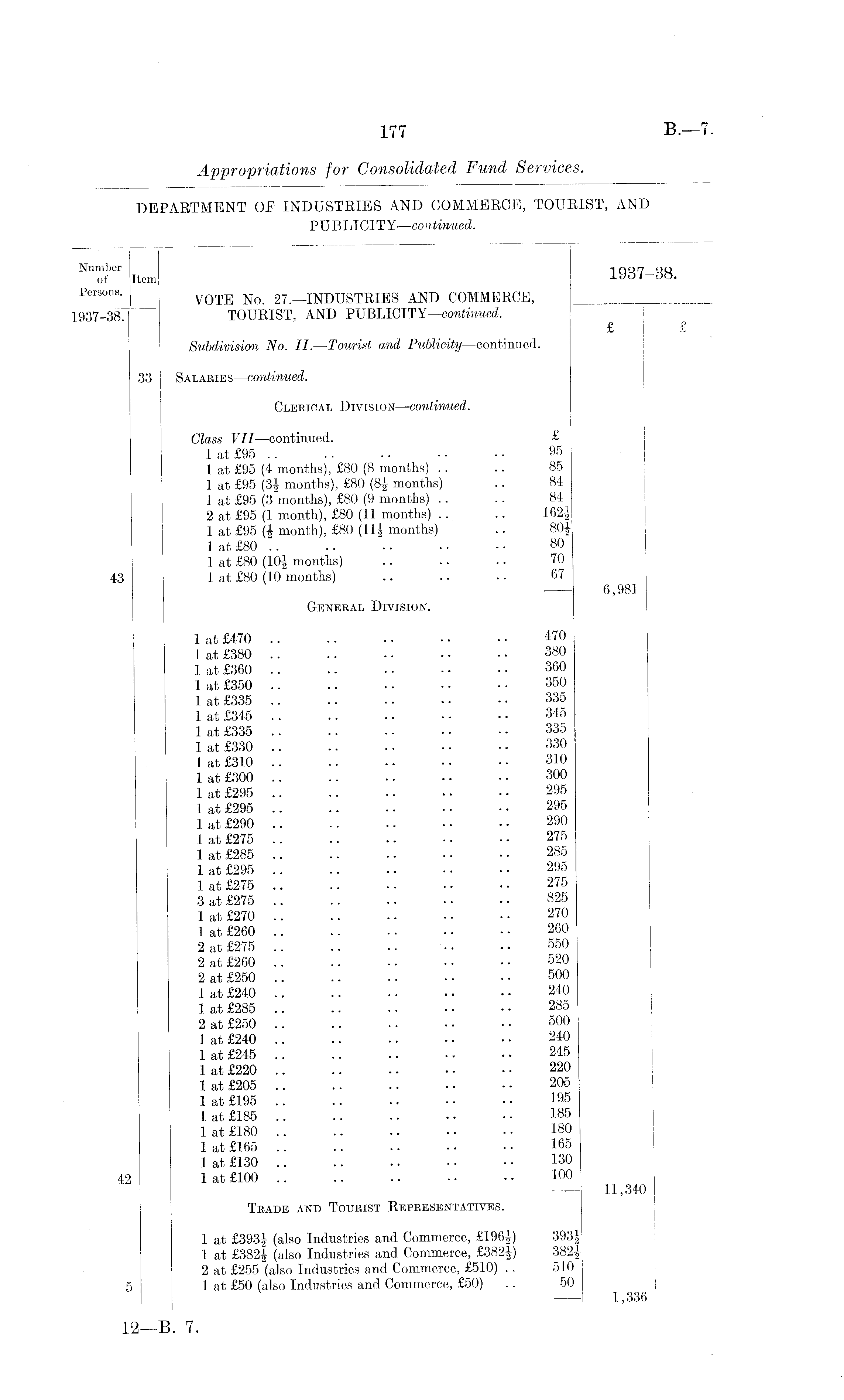 Number -j 007 00 of Item lc/Oi OO. Persons. v 0TE No. 27,—INDUSTRIES AND COMMERCE, 1937-38 TOURIST, AND PUBLICITY —continued. £ £ Subdivision No. II. —Tourist and Publicity —continued. 33 Salaries —continued. Clerical Division —continued. Class VII —continued. £ 1 at £95 .. .. • • • • • • 95 1 at £95 (4 months), £80 (8 months) .. .. 85 1 at £95 (3f months), £80 (8f months) .. 84 1 at £95 (3 months), £80 (9 months) .. .. 84 2 at £95 (1 month), £80 (11 months) .. .. 162| 1 at £95 month), £80 (11J months) .. 80| 1 at £80 ".. ■ ■ ■ ■ ■ ■ ■ ■ 80 1 at £80 (10| months) .. .. .. 70 43 1 at £80 (10 months) .. .. • • 67 —- 6,981 General Division. 1 at £470 470 1 at £380 .. .. • • • • • • 380 1 at £360 .. • • ■ • • • • • 360 1 at £350 .. • • • • •• • • 350 1 at £335 .. .. • • •• • • 335 1 at £345 .. .. • ■ •• •• 345 1 at £335 .. . • • • •■ •• 335 1 at £330 330 1 at £310 .. .. • • • • • • 310 1 at £300 .. .. ■• •• •• 300 1 at £295 295 1 at £295 295 1 at £290 .. .. • - ■ • • • 290 1 at £275 275 1 at £285 .. .. • - • • •• 285 1 at £295 .. .. • • •• ■■ 295 1 at £275 .. .. .. • • • • 275 3 at £275 .. .. ■■ • ■ • • 825 1 at £270 270 1 at £260 .. .. •. • ■ • • 260 2 at £275 550 2 at £260 520 I 2 at £250 .. .. • • •• •• 500 1 at £240 240 1 at £285 .. ■• • • •• • • 285 2 at £250 .. .. • • •■ • • 500 1 at £240 .. .. • • • • • • 240 1 at £245 245 1 at £220 .. .. •. •• • • 220 1 at £205 .. .. .. • • •• 205 1 at £195 .. .. •• • • • • 195 1 at £185 .. .. .. •• • • 185 1 at £180 .. .. .. •• ■ ■ 180 1 at £165 .. .. • • •• • • 165 1 at £130 .. .. • ■ ■• • • 130 42 1 at £100 .. .. ■. • • • • 100 11,340 Trade and Tourist Representatives. 1 at £393| ( a l so Industries and Commerce, £196|) 393| 1 at £382J (also Industries and Commerce, £382A) 382|2 at £255 (also Industries and Commerce, £510) .. 510 5 1 at £50 (also Industries and Commerce, £50) . . 50 1,336