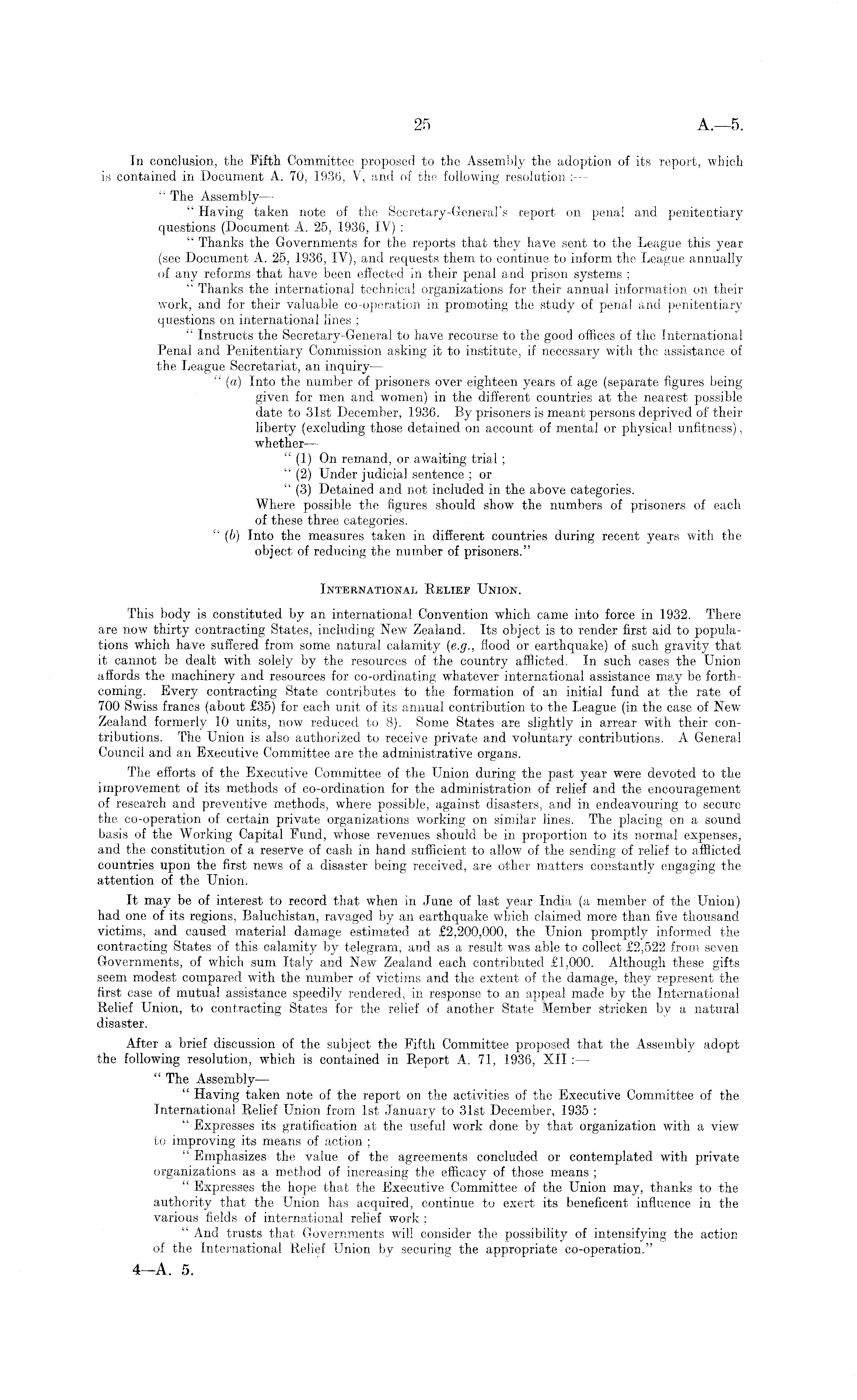 In conclusion, the Fifth Committee proposed to the Assembly the adoption of its report, which is contained in Document A. 70, 1936, V, and of the following resolution : — " The Assembly — " Having taken note of the Secretary-General's report on penal and penitentiary questions (Document A. 25, 1936, IV) : " Thanks the Governments for the reports that they have sent to the League this year (see Document A. 25, 1936, IV), and requests them to continue to inform the League annually of any reforms that have been effected in their penal and prison systems ; " Thanks the international technical organizations for their annual information on their work, and for their valuable co-operation in promoting the study of penal and penitentiary questions on international lines ; " Instructs the Secretary-General to have recourse to the good offices of the International Penal and Penitentiary Commission asking it to institute, if necessary with the assistance of the League Secretariat, an inquiry— " (a) Into the number of prisoners over eighteen years of age (separate figures being given for men and women) in the different countries at the nearest possible date to 31st December, 1936. By prisoners is meant persons deprived of their liberty (excluding those detained on account of mental or physical unfitness), whether — " (1) On remand, or awaiting trial ; " (2) Under judicial sentence ; or " (3) Detained and not included in the above categories. Where possible the figures should show the numbers of prisoners of each of these three categories. " (b) Into the measures taken in different countries during recent years with the object of reducing the number of prisoners." International Relief Union. This body is constituted by an international Convention which came into force in 1932. There are now thirty contracting States, including New Zealand. Its object is to render first aid to populations which have suffered from some natural calamity {e.g., flood or earthquake) of such gravity that it cannot be dealt with solely by the resources of the country afflicted. In such cases the Union affords the machinery and resources for co-ordinating whatever international assistance may be forthcoming. Every contracting State contributes to the formation of an initial fund at the rate of 700 Swiss francs (about £35) for each unit of its annual contribution to the League (in the case of New Zealand formerly 10 units, now reduced to 8). Some States are slightly in arrear with their contributions. The Union is also authorized to receive private and voluntary contributions. A General Council and an Executive Committee are the administrative organs. The efforts of the Executive Committee of the Union during the past year were devoted to the improvement of its methods of co-ordination for the administration of relief and the encouragement of research and preventive methods, where possible, against disasters, and in endeavouring to secure the co-operation of certain private organizations working on similar lines. The placing on a sound basis of the Working Capital Fund, whose revenues should be in proportion to its normal expenses, and the constitution of a reserve of cash in hand sufficient to allow of the sending of relief to afflicted countries upon the first news of a disaster being received, are other matters constantly engaging the attention of the Union. It may be of interest to record that when in June of last year India (a member of the Union) had one of its regions, Baluchistan, ravaged by an earthquake which claimed more than five thousand victims, and caused material damage estimated at £2,200,000, the Union promptly informed the contracting States of this calamity by telegram, and as a result was able to collect £2,522 from seven Governments, of which sum Italy and New Zealand each contributed £1,000. Although these gifts seem modest compared with the number of victims and the extent of the damage, they represent the first case of mutual assistance speedily rendered, in response to an appeal made by the International Relief Union, to contracting States for the relief of another State Member stricken by a natural disaster. After a brief discussion of the subject the Fifth Committee proposed that the Assembly adopt the following resolution, which is contained in Report A. 71, 1936, XII : — " The Assembly— " Having taken note of the report on the activities of the Executive Committee of the International Relief Union from Ist January to 31st December, 1935 : " Expresses its gratification at the useful work done by that organization with a view to improving its means of action ; " Emphasizes the value of the agreements concluded or contemplated with private organizations as a method of increasing the efficacy of those means ; " Expresses the hope that the Executive Committee of the Union may, thanks to the authority that the Union has acquired, continue to exert its beneficent influence in the various fields of international relief work ; " And trusts that Governments will consider the possibility of intensifying the action of the International Relief Union by securing the appropriate co-operation."