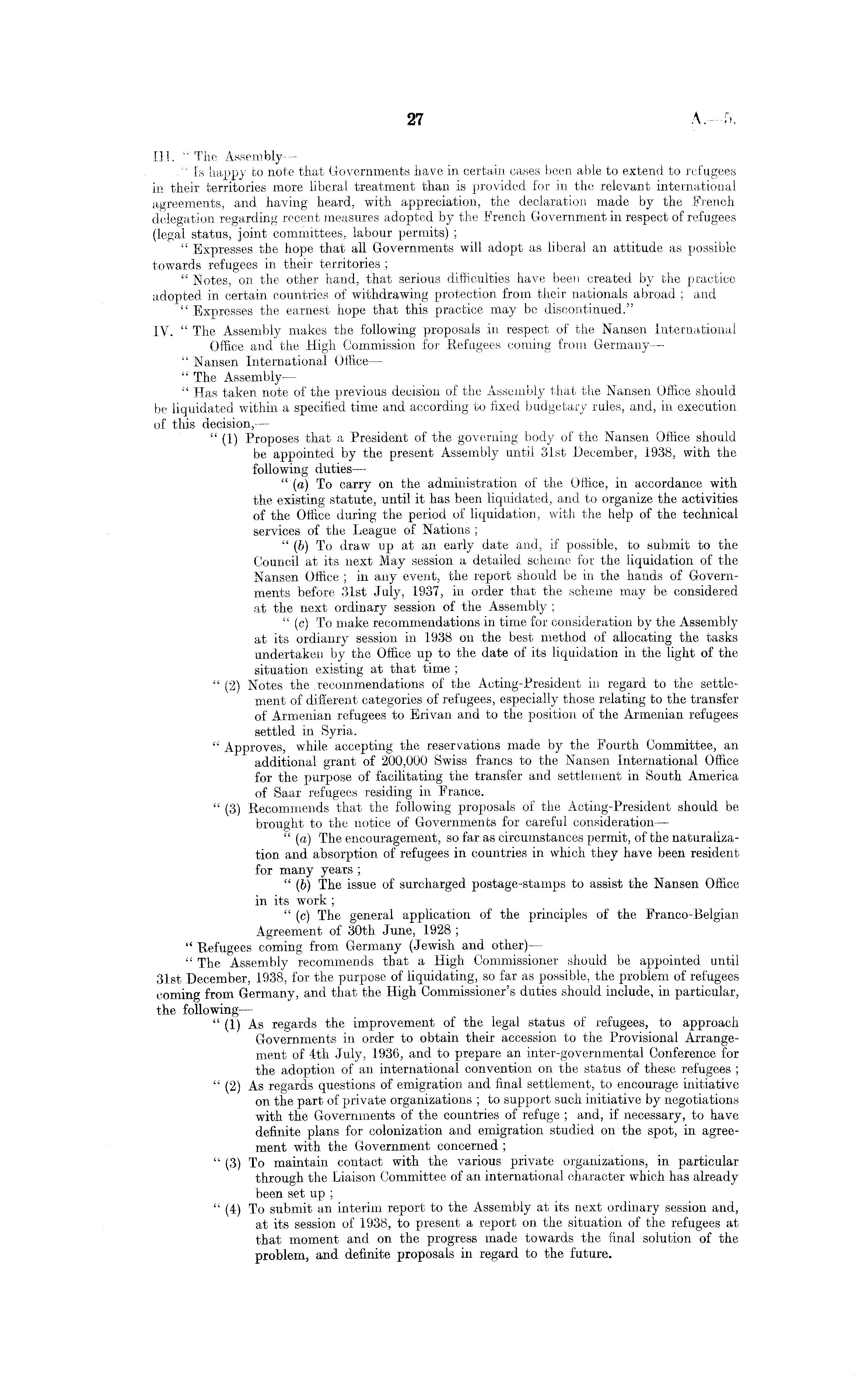 111. " The Assembly— " Is happy to note that Governments have in certain cases been able to extend to refugees in their territories more liberal treatment than is provided for in the relevant international agreements, and having heard, with appreciation, the declaration made by the French delegation regarding recent measures adopted by the French Government in respect of refugees (legal status, joint committees, labour permits) ; " Expresses the hope that all Governments will adopt as liberal an attitude as possible towards refugees in their territories ; " Notes, on the other hand, that serious difficulties have been created by the practice adopted in certain countries of withdrawing protection from their nationals abroad ; and " Expresses the earnest hope that this practice may be discontinued." IV. " The Assembly makes the following proposals in respect of the Nansen International Office and the High Commission for Refugees coming from Germany — " Nansen International Office— " The Assembly — " Has taken note of the previous decision of the Assembly that the Nansen Office should be liquidated within a specified time and according to fixed budgetary rules, and, in execution of this decision, — " (1) Proposes that a President of the governing body of the Nansen Office should be appointed by the present Assembly until 31st December, 1938, with the following duties — " (a) To carry on the administration of the Office, in accordance with the existing statute, until it has been liquidated, and to organize the activities of the Office during the period of liquidation, with the help of the technical services of the League of Nations ; " (b) To draw up at an early date and, if possible, to submit to the Council at its next May session a detailed scheme for the liquidation of the Nansen Office ; in any event, the report should be in the hands of Governments before 31st July, 1937, in order that the scheme may be considered at the next ordinary session of the Assembly ; " (c) To make recommendations in time for consideration by the Assembly at its ordianry session in 1938 on the best method of allocating the tasks undertaken by the Office up to the date of its liquidation in the light of the situation existing at that time ; " (2) Notes the Recommendations of the Acting-President in regard to the settlement of different categories of refugees, especially those relating to the transfer of Armenian refugees to Erivan and to the position of the Armenian refugees settled in Syria. " Approves, while accepting the reservations made by the Fourth Committee, an additional grant of 200,000 Swiss francs to the Nansen International Office for the purpose of facilitating the transfer and settlement in South America of Saar refugees residing in France. " (3) Recommends that the following proposals of the Acting-President should be brought to the notice of Governments for careful consideration— " (a) The encouragement, so far as circumstances permit, of the naturalization and absorption of refugees in countries in which they have been resident for many years ; " (b) The issue of surcharged postage-stamps to assist the Nansen Office in its work ; " (c) The general application of the principles of the Franco-Belgian Agreement of 30th June, 1928 ; " Refugees coming from Germany (Jewish and other) — " The Assembly recommends that a High Commissioner should be appointed until 31st December, 1938, for the purpose of liquidating, so far as possible, the problem of refugees coming from Germany, and that the High Commissioner's duties should include, in particular, the following— " (1) As regards the improvement of the legal status of refugees, to approach Governments in order to obtain their accession to the Provisional Arrangement of 4th July, 1936, and to prepare an inter-governmental Conference for the adoption of an international convention on the status of these refugees ; " (2) As regards questions of emigration and final settlement, to encourage initiative on the part of private organizations ; to support such initiative by negotiations with the Governments of the countries of refuge ; and, if necessary, to have definite plans for colonization and emigration studied on the spot, in agreement with the Government concerned ; " (3) To maintain contact with the various private organizations, in particular through the Liaison Committee of an international character which has already been set up ; " (4) To submit an interim report to the Assembly at its next ordinary session and, at its session of 1938, to present a report on the situation of the refugees at that moment and on the progress made towards the final solution of the problem, and definite proposals in regard to the future.