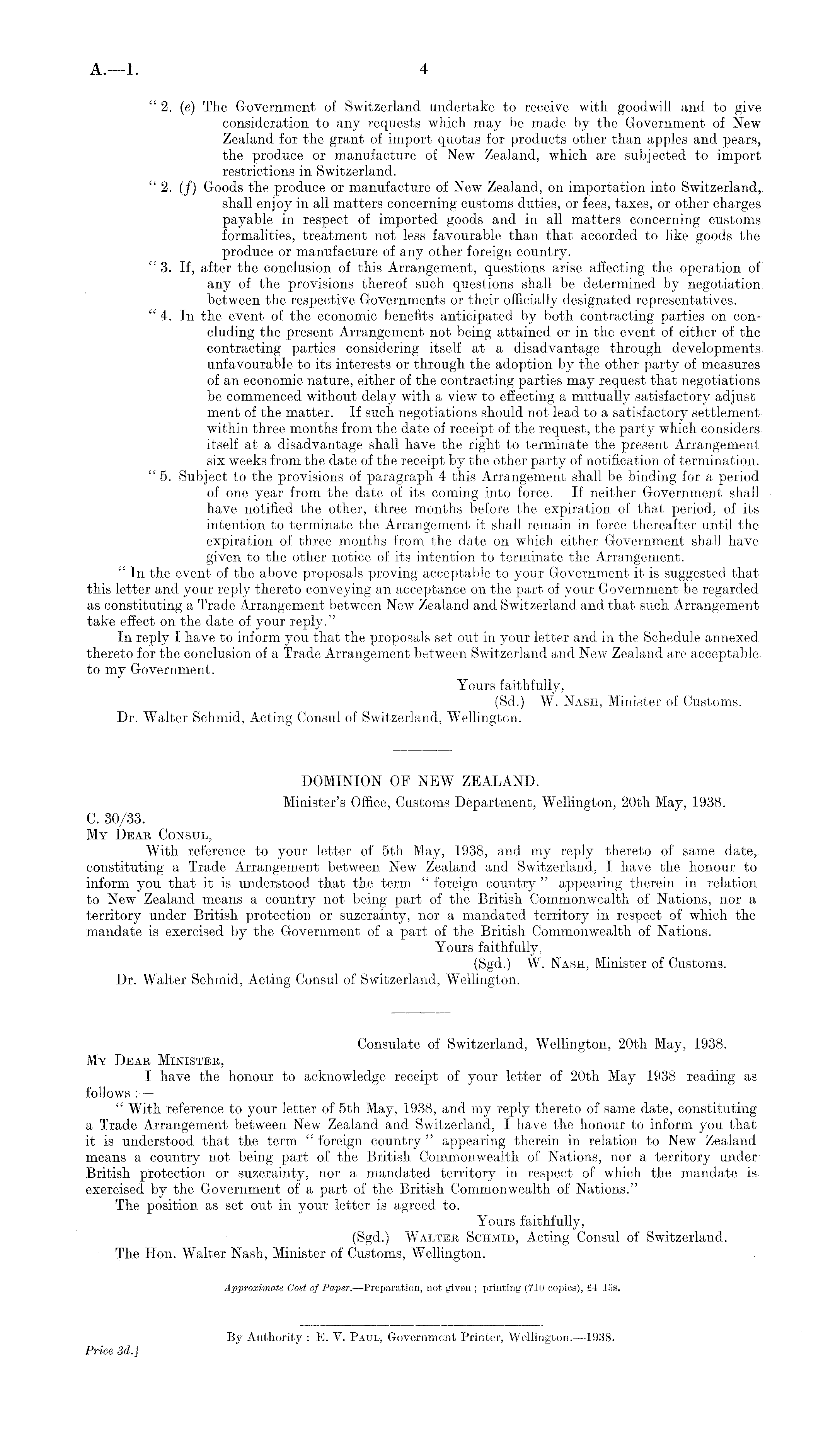 DOMINION OF NEW ZEALAND. Minister's Office, Customs Department, Wellington, 20th May, 1938. C. 30/33. My Dear Consul, With reference to your letter of sth May, 1938, and my reply thereto of same date r constituting a Trade Arrangement between New Zealand and Switzerland, I have the honour to inform you that it is understood that the term " foreign country " appearing therein in relation to New Zealand means a country not being part of the British Commonwealth of Nations, nor a territory under British protection or suzerainty, nor a mandated territory in respect of which the mandate is exercised by the Government of a part of the British Commonwealth of Nations. Yours faithfully, (Sgd.) W. Nash, Minister of Customs. Dr. Walter Schmid, Acting Consul of Switzerland, Wellington.