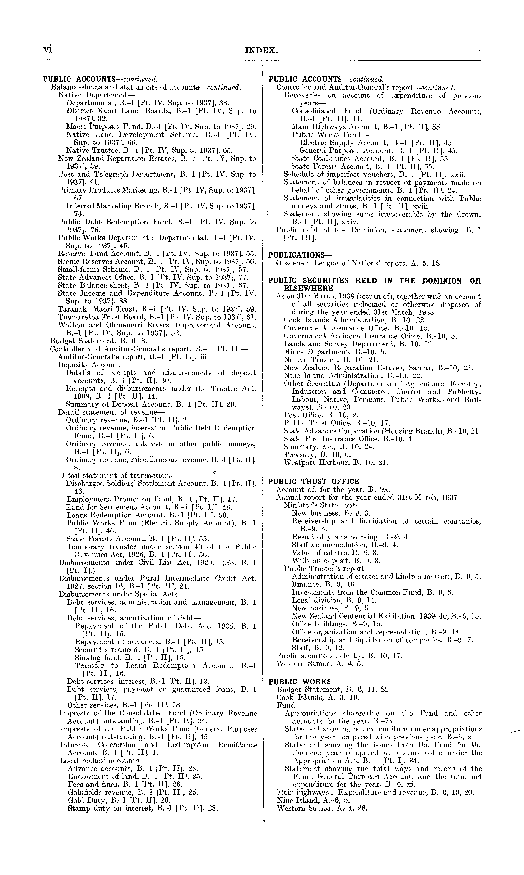 PUBLIC ACCOUNTS —continued. Balance-sheets and statements of accounts—continued. Native Department— Departmental, 8.-l [Pt. IV, Sup. to 1937], 38. District Maori Land Boards, 8.-l [Pt. IV, Sup. to 1937], 32. Maori Purposes Fund, 8.-l [Pt. IV, Sup. to 1937], 29. Native Land Development Scheme, 8.-l [Pt. IV, Sup. to 1937], 66. Native Trustee, 8.-l [Pt. IV, Sup. to 1937], 65. New Zealand Reparation Estates, 8.-l [Pt. IV, Sup. to 1937], 39. Post and Telegraph Department, 8.-l [Pt. IV, Sup. to 1937], 41. Primary Products Marketing, 8.-l [Pt. IV, Sup. to 1937], 67. Internal Marketing Branch, 8.-l [Pt. IV, Sup. to 1937], 74. Public Debt Redemption Fund, 8.-l [Pt. IV, Sup. to 1937], 76. Public Works Department: Departmental, 8.-l [Pt. IV, Sup. to 1937], 45. Reserve Fund Account, 8.-l [Pt. IV, Sup. to 1937], 55. Scenic Reserves Account, 8.-l [Pt. IV, Sup. to 1937], 56. Small-farms Scheme, 8.-l [Pt. IV, Sup. to 1937], 57. State Advances Office, 8.-l [Pt. IV, Sup. to 1937], 77. State Balance-sheet, 8.-l [Pt. IV, Sup. to 1937], 87. State Income and Expenditure Account, 8.-l [Pt. IV, Sup. to 1937], 88. Taranaki Maori Trust, 8.-l [Pt. IV, Sup. to 1937], 59. Tuwharetoa Trust Board, 8.-l [Pt. IV, Sup. to 1937], 61. Waihou and Ohinemuri Rivers Improvement Account, 8.-l [Pt. IV, Sup. to 1937], 52. Budget Statement, B. 6, 8. Controller and Auditor-General's report, 8.-l [Pt. II] — Auditor-General's report, 8.-l [Pt. ll], iii. Deposits Account — Details of receipts and disbursements of deposit accounts, 8.-l [Pt. ll], 30. Receipts and disbursements under the Trustee Act, 1908, 8.-l [Pt. ll], 44. Summary of Deposit Account, 8.-l [Pt. ll], 29. Detail statement of revenue — Ordinary revenue, 8.-l [Pt. ll], 2. Ordinary revenue, interest on Public Debt Redemption Fund, 8.-l [Pt. ll], 6. Ordinary revenue, interest on other public moneys, 8.-l [Pt. ll], 6. Ordinary revenue, miscellaneous revenue, 8.-l [Pt. ll], 8. Detail statement of transactions— Discharged Soldiers' Settlement Account, 8.-l [Pt. 111, 46. Employment Promotion Fund, 8.-l [Pt. ll], 47. Land for Settlement Account, 8.-l [Pt. ll], 48. Loans Redemption Account, 8.-l [Pt. ll], 50. Public Works Fund (Electric Supply Account), 8.-l [Pt. ll], 46. State Forests Account, 8.-l [Pt. ll], 55. Temporary transfer under section 40 of the Public Revenues Act, 1926, 8.-l [Pt. ll], 56. Disbursements under Civil List Act, 1920. (See 8.-l [Pt. I].) Disbursements under Rural Intermediate Credit Act, 1927, section 16, 8.-l [Pt. ll], 24. Disbursements under Special Acts — Debt services, administration and management, 8.-l [Pt. ll], 16. Debt services, amortization of debt— Repayment of the Public Debt Act, 1925, 8.-l [Pt. ll], 15. Repayment of advances, 8.-l [Pt. ll], 15. Securities reduced, 8.-l [Pt. ll], 15. Sinking fund, 8.-l [Pt. ll], 15. Transfer to Loans Redemption Account, 8.-l [Pt. ll], 16. Debt services, interest, 8.-l [Pt. ll], 13. Debt services, payment on guaranteed loans, 8.-l [Pt. ll], 17. Other services, 8.-l [Pt. ll], 18. Imprests of the Consolidated Fund (Ordinary Revenue Account) outstanding, 8.-l [Pt. ll], 24. Imprests of the Public Works Fund (General Purposes Account) outstanding, 8.-l [Pt. ll], 45. Interest, Conversion and Redemption Remittance Account, 8.-l [Pt. ll], 1. Local bodies' accounts — Advance accounts, 8.-l [Pt. ll], 28. Endowment of land, 8.-l [Pt. ll], 25. Fees and fines, 8.-l [Pt. ll], 26. Goldfields revenue, 8.-l [Pt. ll], 25. Gold Duty, 8.-l [Pt. ll], 26. Stamp duty on interest, 8.-l [Pt. ll], 28.