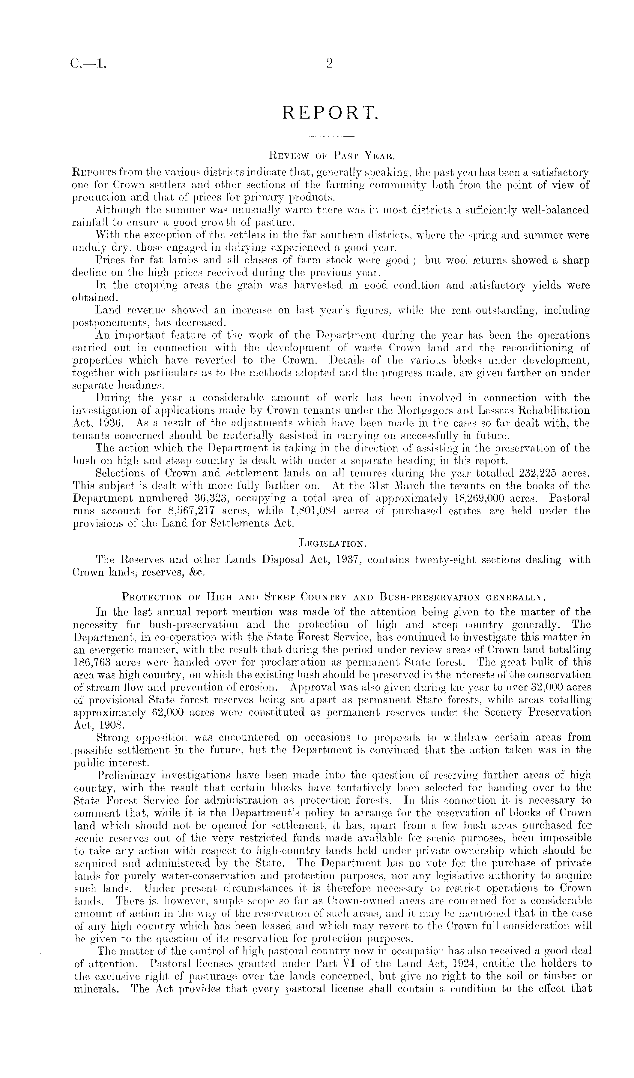 Review of Past Year. Reports from the various districts indicate that, generally speaking, the past yeai has been a satisfactory one for Crown settlers and other sections of the farming community both froifi the point of view of production and that of prices for primary products. Although the summer was unusually warm there was in most districts a sufficiently well-balanced rainfall to ensure a good growth of pasture. With the exception of the settlers in the far southern districts, where the sjring and summer were unduly dry, those engaged in dairying experienced a good year. Prices for fat lambs and all classes of farm stock were good ; but wool returns showed a sharp decline on the high prices received during the previous year. In the cropping areas the grain was harvested in good condition and satisfactory yields were obtained. Land revenue showed an increase on last year's figures, while the rent outstanding, including postponements, has decreased. An important feature of the work of the Department during the year las been the operations carried out in connection with the development of waste Crown land and the reconditioning of properties which have reverted to the Crown. Details of the various blocks under development, together with particulars as to the methods adopted and the progress made, are given farther on under separate headings. During the year a considerable amount of work has been involved in connection with the investigation of applications made by Crown tenants under the Mortgagors and Lessees Rehabilitation Act, 1936. As a result of the adjustments which have been made in the cases so far dealt with, the tenants concerned should be materially assisted in carrying on successfully in future. The action which the Department is taking in the direction of assisting in the preservation of the bush on high and steep country is dealt with under a separate heading in this report. Selections of Crown and settlement lands on all tenures during the year totalled 232,225 acres. This subject is dealt with more fully farther on. At the 31st March the tenants on the books of the Department numbered 36,323, occupying a total area of approximately 18,269,000 acres. Pastoral runs account for 8,567,217 acres, while 1,801,084 acres of purchased estates are held under the provisions of the Land for Settlements Act. Legislation. The Reserves and other Lands Disposal Act, 1937, contains twenty-eight sections dealing with Crown lands, reserves, &c. Protection of High and Steep Country and Bush-preservation generally. In the last annual report mention was made bf the attention being given to the matter of the necessity for bush-preservation and the protection of high and steep country generally. The Department, in co-operation with the State Forest Service, has continued to investigate this matter in an energetic manner, with the result that during the period under review areas of Crown land totalling 186,763 acres were handed over for proclamation as permanent State forest. The great bulk of this area was high country, on which the existing bush should be preserved in the interests of the conservation of stream flow and prevention of erosion. Approval was also given during the year to over 32,000 acres of provisional State forest reserves being set apart as permanent State forests, while areas totalling approximately 62,000 acres were constituted as permanent reserves under the Scenery Preservation Act, 1908. Strong opposition was encountered on occasions to proposals to withdraw certain areas from possible settlement in the future, but the Department is convinced that the action taken was in the public interest. Preliminary investigations have been made into the question of reserving further areas of high country, with the result that certain blocks have tentatively been selected for handing over to the State Forest Service for administration as protection forests. In this connection it is necessary to comment that, while it is the Department's policy to arrange for the reservation of blocks of Crown land which should not be opened for settlement, it has, apart from a few bush areas purchased for scenic reserves out of the very restricted funds made available for scenic purposes, been impossible to take any action with respect to high-country lands held under private ownership which should be acquired and administered by the State. The Department has no vote for the purchase of private lands for purely water-conservation and protection purposes, nor any legislative authority to acquire such lands. Under present circumstances it is therefore necessary to restrict operations to Crown lands. There is, however, ample scope so far as Crown-owned areas are concerned for a considerable amount of action in the way of the reservation of such areas, and it may be mentioned that in the case of any high country which has been leased and which may revert to the Crown full consideration will be given to the question of its reservation for protection purposes. The matter of the control of high pastoral country now in occupation has also received a good deal of attention. Pastoral "licenses granted under Part VI of the Land Act, 1924, entitle the holders to the exclusive right of pasturage over the lands concerned, but give no right to the soil or timber or minerals. The Act provides that every pastoral license shall contain a condition to the effect that
