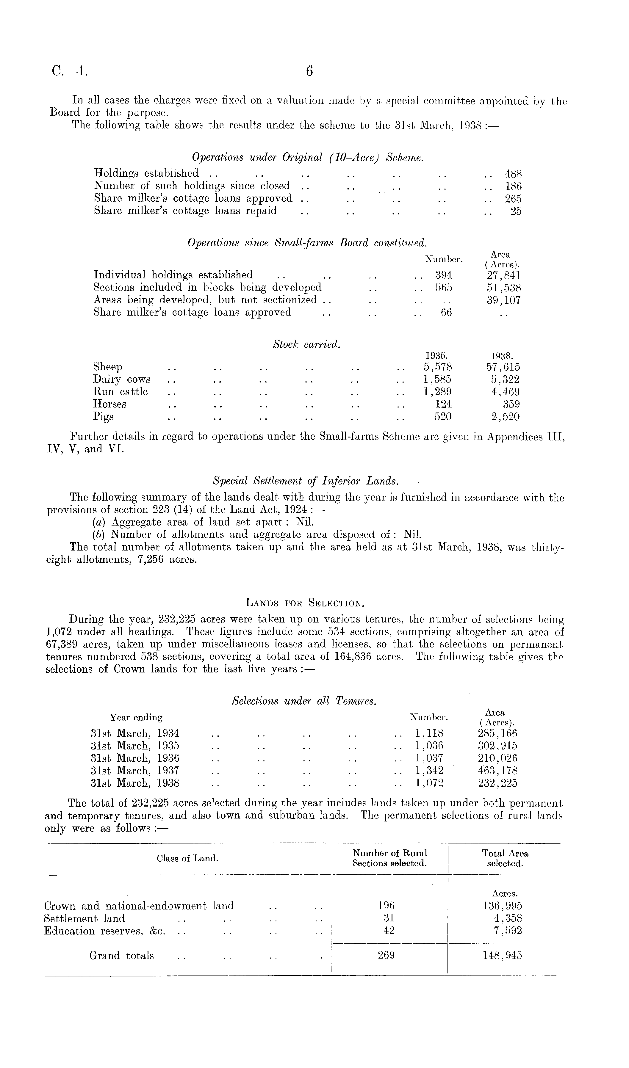 In all oases the charges were fixed on a valuation made by a special committee appointed by the Board for the purpose. The following table shows the results under the scheme to the 31st March, 1938 :— Operations under Original (10-Acre) Scheme. Holdings established .. .. .. .. .. .. .. 488 Number of such holdings since closed .. .. .. .. 186 Share milker's cottage loans approved .. .. .. .. .. 265 Share milker's cottage loans repaid .. .. .. .. 25 Operations since Small-farms Board constituted. Number. , 4" roa . (Acres). Individual holdings established .. .. .. .. 394 27,841 Sections included in blocks being developed .. .. 565 51,538 Areas being developed, but not sectionized .. .. .. .. 39,107 Share milker's cottage loans approved .. .. 66 Stock carried. 1935. 1938. Sheep .. .. .. .. .. .. 5,578 57,615 Dairy cows .. .. .. .. .. .. 1,585 5,322 Run cattle .. .. .. .. .. .. 1,289 4,469 Horses .. .. .. .. .. .. 124 359 Pigs .. .. .. .. .. .. 520 2,520 Further details in regard to operations under the Small-farms Scheme are given in Appendices 111, IV, V, and VI. Special Settlement of Inferior Lands. The following summary of the lands dealt with during the year is furnished in accordance with the provisions of section 223 (14) of the Land Act, 1924 : — (a) Aggregate area of land set apart: Nil. (b) Number of allotments and aggregate area disposed of : Nil. The total number of allotments taken up and the area held as at 31st March, 1938, was thirtyeight allotments, 7,256 acres. Lands for Selection. During the year, 232,225 acres were taken up on various tenures, the number of selections being 1,072 under all headings. These figures include some 534 sections, comprising altogether an area of 67,389 acres, taken up under miscellaneous leases and licenses, so that the selections on permanent tenures numbered 538 sections, covering a total area of 164,836 acres. The following table gives the selections of Crown lands for the last five years : —• Selections under all Tenures. Year ending Number. Acres) 31st March, 1934 .. .. .. .. .. 1,118 285,166 31st March, 1935 .. .. .. .. .. 1,036 302,915 31st March, 1936 .. .. .. .. .. 1,037 210,026 31st March, 1937 .. .. .. .. .. 1,342 ' 463,178 31st March, 1938 .. .. .. .. .. 1,072 232,225 The total of 232,225 acres selected during the year includes lands taken up under both permanent and temporary tenures, and also town and suburban lands. The permanent selections of rural lands only were as follows