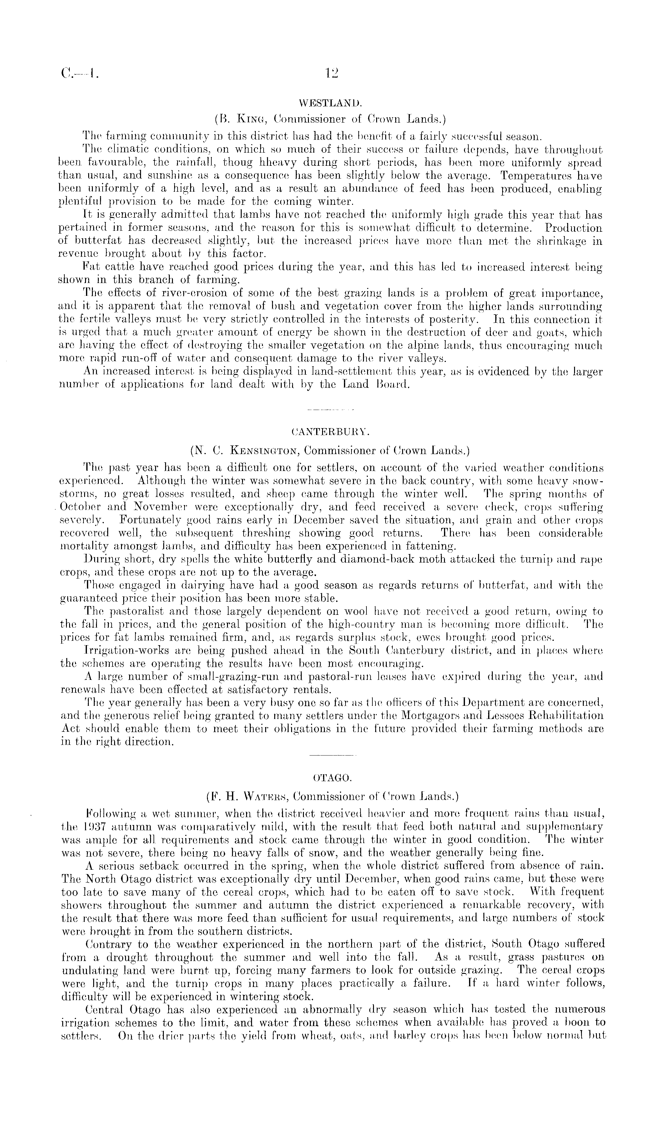 OTAGO. (F. H. Waters, Commissioner of Crown Lands.) Following a wet summer, when the district received heavier and more frequent rains than usual, the 1937 autumn was comparatively mild, with the result that feed both natural and supplementary was ample for all requirements and stock came through the winter in good condition. The winter was not severe, there being no heavy falls of snow, and the weather generally being fine. A serious setback occurred in the spring, when the whole district suffered from absence of rain. The North Otago district was exceptionally dry until December, when good rains came, but these were too late to save many of the cereal crops, which had to be eaten off to save stock. With frequent showers throughout the summer and autumn the district experienced a remarkable recovery, with the result that there was more feed than sufficient for usual requirements, and large numbers of stock were brought in from the southern districts. Contrary to the weather experienced in the northern part of the district, South Otago suffered from a drought throughout the summer and well into the fall. As a result, grass pastures on undulating land were burnt up, forcing many farmers to look for outside grazing. The cereal crops were light, and the turnip crops in many places practically a failure. If a hard winter follows, difficulty will be experienced in wintering stock. Central Otago has also experienced an abnormally dry season which has tested the numerous irrigation schemes to the limit, and water from these schemes when available has proved a boon to settlers. On the drier parts the yield from wheat, oats, and barley crops has been below normal but