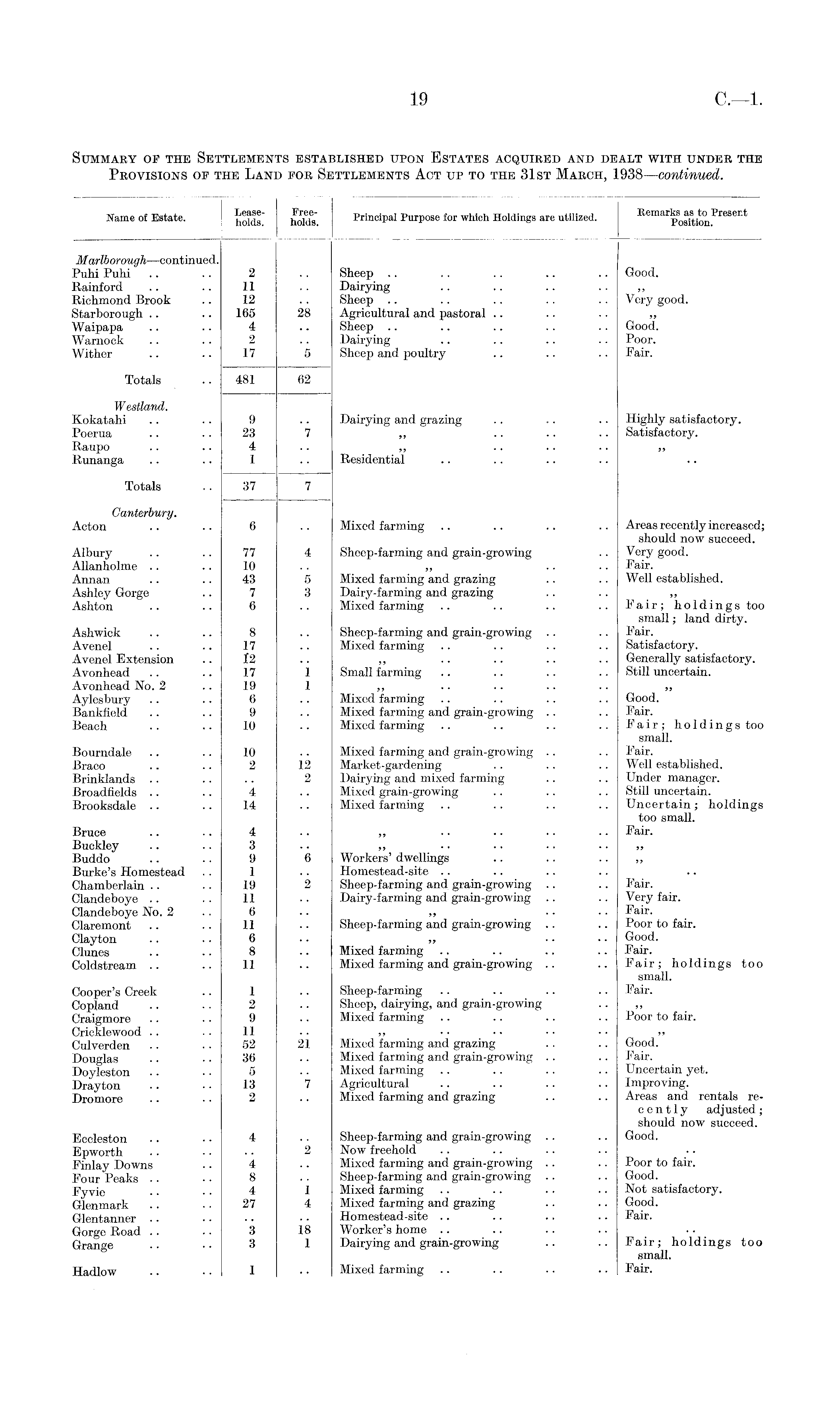 Summary of the Settlements established upon Estates acquired and dealt with under the Provisions of the Land for Settlements Act up to the 31st March, 1938 —continued.