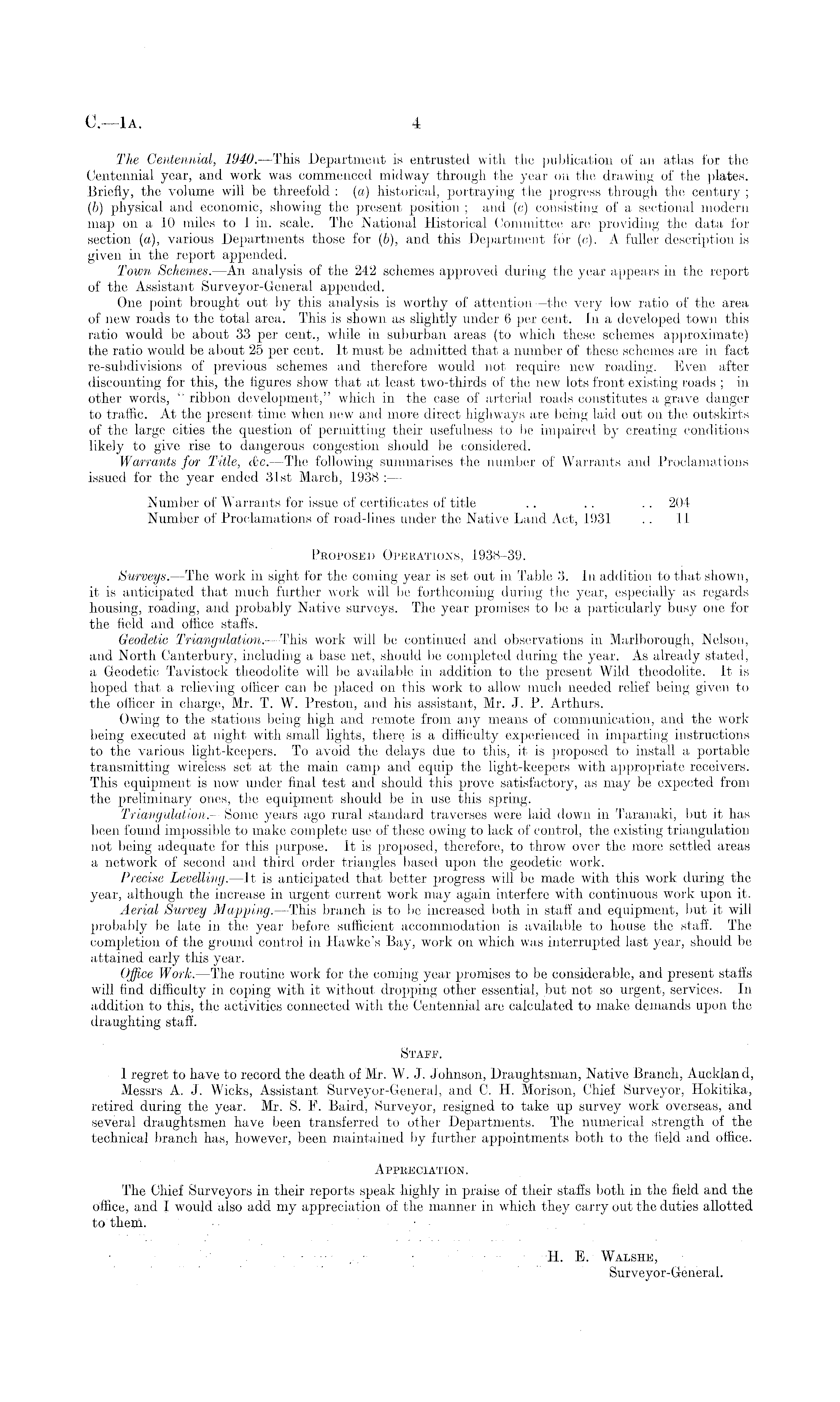 The Centennial, 1940. —This Department is entrusted with the publication of an atlas for the Centennial year, and work was commenced midway through the year on the drawing of the plates. Briefly, the volume will be threefold : (a) historical, portraying the progress through the century ; (b) physical and economic, showing the present position ; and (c) consisting of a sectional modern map on a 10 miles to 1 in. scale. The National Historical Committee are providing the data for section (a), various Departments those for (b), and this Department for (c). A fuller description is given in the report appended. Town Schemes. —Ail analysis of the 242 schemes approved during the year appears in the report of the Assistant Surveyor-General appended. One point brought out by this analysis is worthy of attention—the very low ratio of the area of new roads to the total area. This is shown as slightly under 6 per cent. In a developed town this ratio would be about 33 per cent., while in suburban areas (to which these schemes approximate) the ratio would be about 25 per cent. It must be admitted that a number of these schemes are in fact re-subdivisions of previous schemes and therefore would not require new roading. Even after discounting for this, the figures show that at least two-thirds of the new lots front existing roads ; in other words, " ribbon development," which in the case of arterial roads constitutes a grave danger to traffic. At the present time when new and more direct highways are being laid out on the outskirts of the large cities the question of permitting their usefulness to be impaired by creating conditions likely to give rise to dangerous congestion should be considered. Warrants for Title, &c.—The following summarises the number of Warrants and Proclamations issued for the year ended 31st March, 1938 : — Number of Warrants for issue of certificates of title .. .. .. 204 Number of Proclamations of road-lines under the Native Land Act, 1931 .. 11 Proposed Operations, 1938-39. Surveys.—The work in sight for the coming year is set out in Table 3. In addition to that shown, it is anticipated that much further work will be forthcoming during the year, especially as regards housing, roading, and probably Native surveys. The year promises to be a particularly busy one for the field and office staffs. Geodetic Triangulation: —This work will be continued and observations in Marlborough, Nelson, and North Canterbury, including a base net, should be completed during the year. As already stated, a Geodetic Tavistock theodolite will be available in addition to the present Wild theodolite. It is hoped that a relieving officer can be placed on this work to allow much needed relief being given to the officer in charge, Mr. T. W. Preston, and his assistant, Mr. J. P. Arthurs. Owing to the stations being high and remote from any means of communication, and the work being executed at night with small lights, there is a difficulty experienced in imparting instructions to the various light-keepers. To avoid the delays due to this, it is proposed to install a portable transmitting wireless set at the main camp and equip the light-keepers with appropriate receivers. This equipment is now under final test and should this prove satisfactory, as may be expected from the preliminary ones, the equipment should be in use this spring. Triangulation.—Some years ago rural standard traverses were laid down in Taranaki, but it has been found impossible to make complete use of these owing to lack of control, the existing triangulation not being adequate for this purpose. It is proposed, therefore, to throw over the more settled areas a network of second and third order triangles based upon the geodetic work. Precise Levelling.—lt is anticipated that better progress will be made with this work during the year, although the increase in urgent current work may again interfere with continuous work upon it. Aerial Survey Mapping. —This branch is to be increased both in staff and equipment, but it will probably be late in the year before sufficient accommodation is available to house the staff. The completion of the ground control in Hawke's Bay, work on which was interrupted last year, should be attained early this year. Office Work. —The routine work for the coming year promises to be considerable, and present staffs will find difficulty in coping with it without dropping other essential, but not so urgent, services. In addition to this, the activities connected with the Centennial are calculated to make demands upon the draughting staff. Staff. I regret to have to record the death of Mr. W. J. Johnson, Draughtsman, Native Branch, Auckland, Messrs A. J. Wicks, Assistant Surveyor-General, and C. H. Morison, Chief Surveyor, Hokitika, retired during the year. Mr. S. F. Baird, Surveyor, resigned to take up survey work overseas, and several draughtsmen have been transferred to other Departments. The numerical strength of the technical branch has, however, been maintained by further appointments both to the field and office. Appreciation. The Chief Surveyors in their reports speak highly in praise of their staffs both in the field and the office, and I would also add my appreciation of the manner in which they carry out the duties allotted to them. • H. E. Walshe, Surveyor-General.