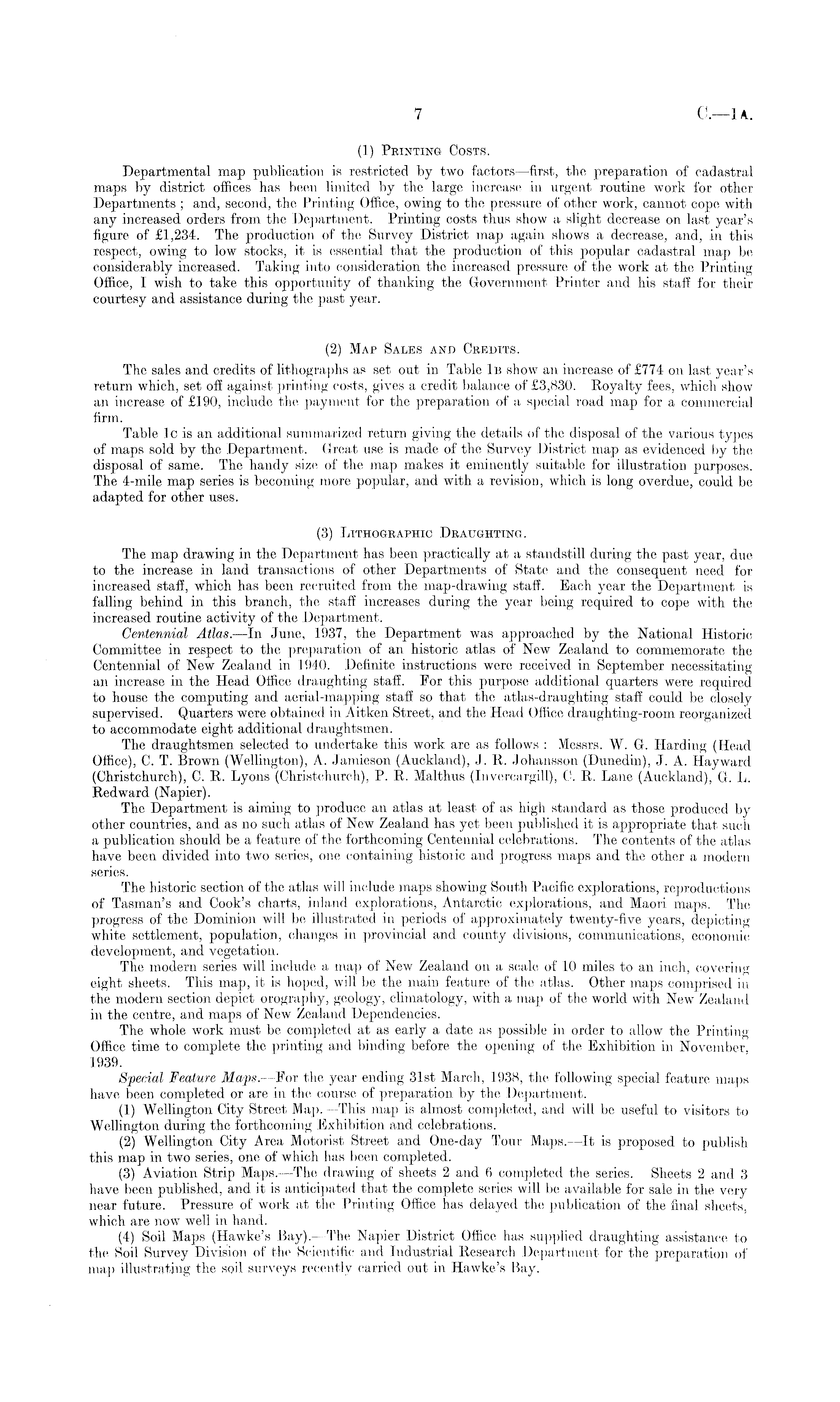 (1) Printing Costs. Departmental map publication is restricted by two factors —first, the preparation of cadastral maps by district offices has been limited by the large increase in urgent routine work for other Departments ; and, second, the Printing Office, owing to the pressure of other work, cannot cope with any increased orders from the Department. Printing costs thus show a slight decrease on last year's figure of £1,234. The production of the Survey District map again shows a decrease, and, in this respect, owing to low stocks, it is essential that the production of this popular cadastral map be considerably increased. Taking into consideration the increased pressure of the work at the Printing Office, I wish to take this opportunity of thanking the Government Printer and his staff for their courtesy and assistance during the past year. (2) Map Sales and Credits. The sales and credits of lithographs as set out in Table 1b show an increase of £774 on last year's return which, set off against printing costs, gives a credit balance of £3,830. Royalty fees, which show an increase of £190, include the payment for the preparation of a special road map for a commercial firm. Table lc is an additional summarized return giving the details of the disposal of the various types of maps sold by the Department. Great use is made of the Survey District map as evidenced by the disposal of same. The handy size of the map makes it eminently suitable for illustration purposes. The 4-mile map series is becoming more popular, and with a revision, which is long overdue, could be adapted for other uses. (3) Lithographic Draughting. The map drawing in the Department has been practically at a standstill during the past year, due to the increase in land transactions of other Departments of State and the consequent need for increased staff, which has been recruited from the map-drawing staff. Bach year the Department is falling behind in this branch, the staff increases during the year being required to cope with the increased routine activity of the Department. Centennial Atlas.—ln June, 1937, the Department was approached by the National Historic Committee in respect to the preparation of an historic atlas of New Zealand to commemorate the Centennial of New Zealand in 1940. Definite instructions were received in September necessitating an increase in the Head Office draughting staff. For this purpose additional quarters were required to house the computing and aerial-mapping staff so that the atlas-draughting staff could be closely supervised. Quarters were obtained in Aitken Street, and the Head Office draughting-room reorganized to accommodate eight additional draughtsmen. The draughtsmen selected to undertake this work are as follows : Messrs. W. G. Harding (Head Office), C. T. Brown (Wellington), A. Jamieson (Auckland), J. R. Johansson (Dunedin), J. A. Hayward (Christchurch), C. R. Lyons (Christchurch), P. R. Malthus (Invercargill), C. R. Lane (Auckland), G. L. Redward (Napier). The Department is aiming to produce an atlas at least of as high standard as those produced by other countries, and as no such atlas of New Zealand has yet been published it is appropriate that such a publication should be a feature of the forthcoming Centennial celebrations. The contents of the atlas have been divided into two series, one containing historic and progress maps and the other a modern series. The historic section of the atlas will include maps showing South Pacific explorations, reproductions of Tasman's and Cook's charts, inland explorations, Antarctic explorations, and Maori maps. The progress of the Dominion will be illustrated in periods of approximately twenty-five years, depicting white settlement, population, changes in provincial and county divisions, communications, economic development, and vegetation. The modern series will include a map of New Zealand on a scale of 10 miles to an inch, covering eight sheets. This map, it is hoped, will be the main feature of the atlas. Other maps comprised in the modern section depict orography, geology, climatology, with a map of the world with New Zealand in the centre, and maps of New Zealand Dependencies. The whole work must be completed at as early a date as possible in order to allow the Printing Office time to complete the printing and binding before the opening of the Exhibition in November, 1939. Special Feature Maps. —For the year ending 31st March, 1938, the following special feature maps have been completed or are in the course of preparation by the Department. (1) Wellington City Street Map. —This map is almost completed, and will be useful to visitors to Wellington during the forthcoming Exhibition and celebrations. (2) Wellington City Area Motorist Street and One-day Tour Maps. —It is proposed to publish this map in two series, one of which has been completed. (3) Aviation Strip Maps. —The drawing of sheets 2 and 6 completed the series. Sheets 2 and 3 have been published, and it is anticipated that the complete series will be available for sale in the very near future. Pressure of work at the Printing Office has delayed the publication of the final sheets, which are now well in hand. (4) Soil Maps (Hawke's Bay). —The Napier District Office has supplied draughting assistance to the Soil Survey Division of the Scientific and Industrial Research Department for the preparation of map illustrating the soil surveys recently carried out in Hawke's Bay.