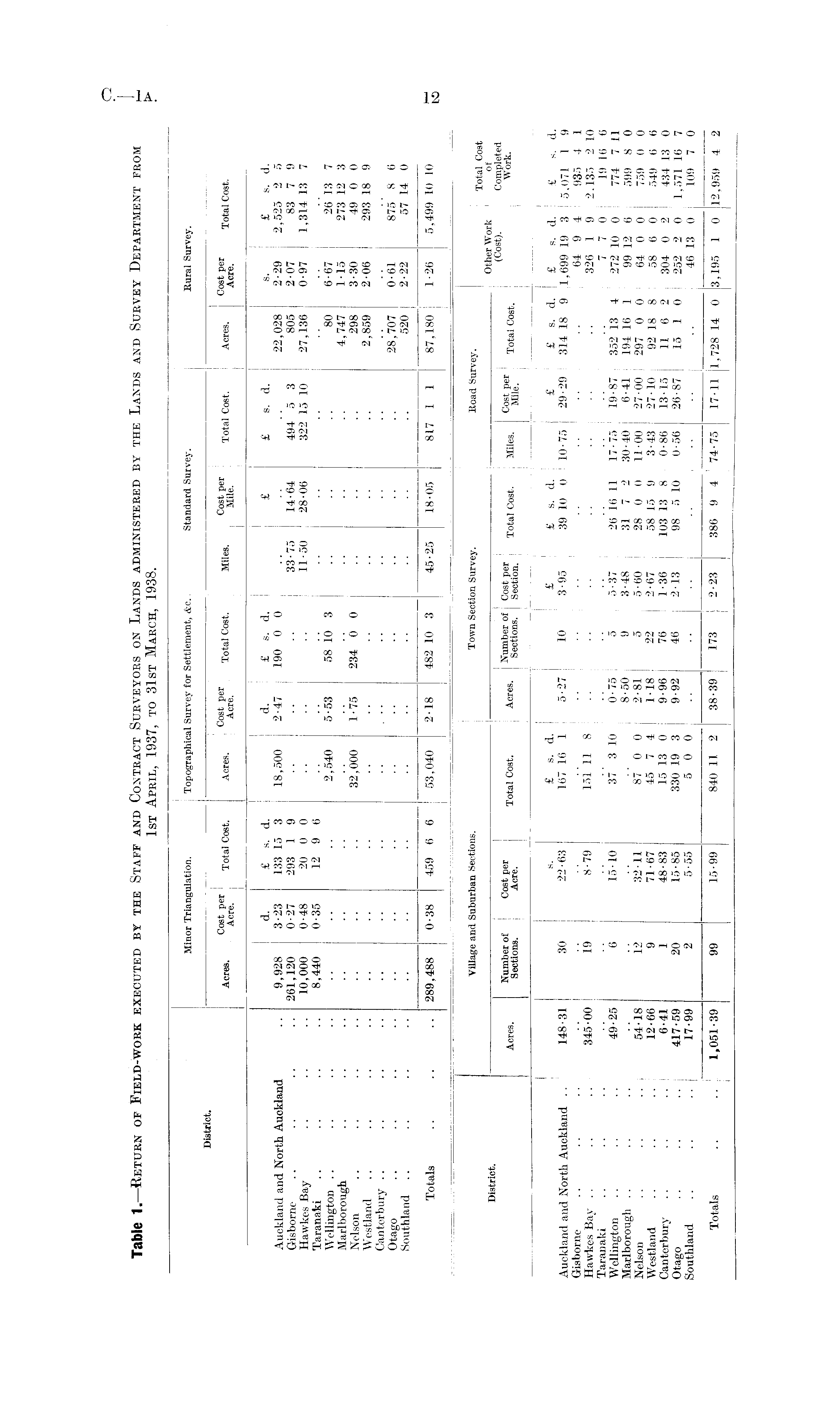 Table 1.—Return of Field-work executed by the Staff and Contract Surveyors on Lands administered by the Lands and Survey Department from 1st April, 1937, to 31st March, 1938.