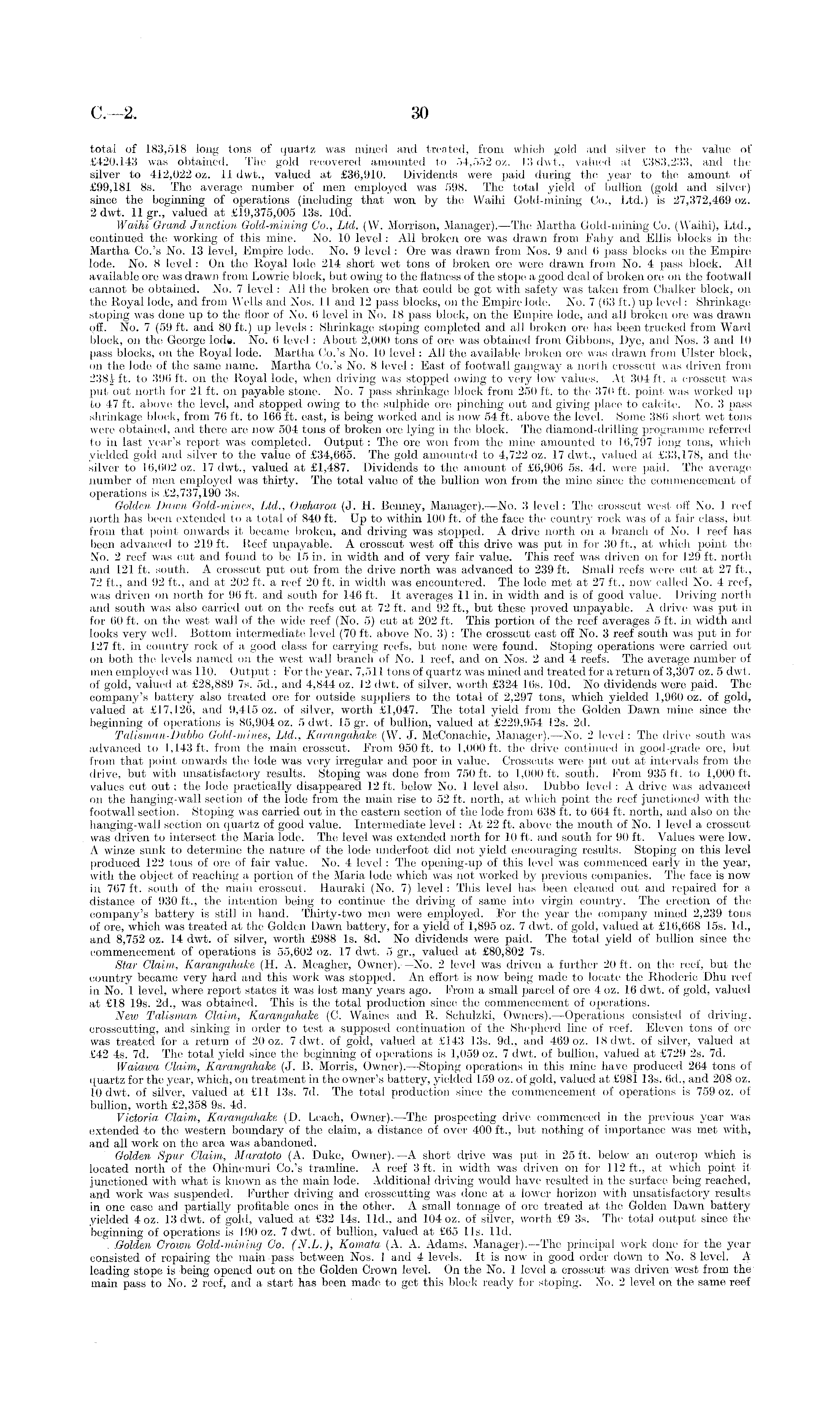 total of 183,518 long tons of quartz was mined and treated, from which gold and silver to the value of £420,143 was obtained. The gold recovered amounted to 54,552 oz. 13 dwt., valued at £383,233, and the silver to 412,022 oz. 11 dwt., valued at £36,910. Dividends were paid during the year to the amount of £99,181 Bs. The average number of men employed was 598. The total yield of bullion (gold and silver) since the beginning of operations (including that won by the Waihi Gold-mining Co., Ltd.) is 27,372,469 oz. 2 dwt. 11 gr., valued at £19,375,005 13s. lOd. Waihi Grand Junction Gold-mining Go., Ltd. (W. Morrison, Manager).—The Martha Gold-mining Co. (Waihi), Ltd., continued the working of this mine. No. 10 level: All broken ore was drawn from Fahy and Ellis blocks in the Martha Co.'s No. 13 level, Empire lode. No. 9 level: Ore was drawn from Nos. 9 and 6 pass blocks on the Empire lode. No. 8 level: On the Royal lode 214 short wet tons of broken ore were drawn from No. 4 pass block. All available ore was drawn from Lowrie block, but owing to the flatness of the stope a good deal of broken ore on the footwall cannot be obtained. No. 7 level: All the broken ore that could be got with safety was taken from Chalker block, on the Royal lode, and from Wells and Nos. 11 and 12 pass blocks, on the Empire lode. No. 7 (63 ft.) up level: Shrinkage stoping was done up to the floor of No. 6 level in No. 18 pass block, on the Empire lode, and all broken ore was drawn pff. No. 7 (59 ft. and 80 ft.) up levels : Shrinkage stoping completed and all broken ore has been trucked from Ward block, on the George lod#. No. 6 level: About 2,000 tons of ore was obtained from Gibbons, Dye, and Nos. 3 and 10 pass blocks, on the Royal lode. Martha Co.'s No. 10 level: All the available broken ore was drawn from Ulster block, on the lode of the same name. Martha Co.'s No. 8 level: East of footwall gangway a north crosscut was driven from 238| ft. to 396 ft. on the Royal lode, when driving was stopped owing to very low values. At 304 ft. a crosscut was put out north for 21 ft. on payable stone. No. 7 pass shrinkage block from 250 ft. to the 370 ft. point was worked up to 47 ft. above the level, and stopped owing to the sulphide ore pinching out and giving place to calcite. No. 3 pass shrinkage block, from 76 ft. to 166 ft. east, is being worked and is now 54 ft. above the level. Some 386 short wet tons were obtained, and there are now 504 tons of broken ore lying in the block. The diamond-drilling programme referred to in last year's report was completed. Output: The ore won from the mine amounted to 16,797 long tons, which yielded gold and silver to the value of £34,665. The gold amounted to 4,722 oz. 17 dwt., valued at £33,178, and the silver to 16,602 oz. 17 dwt., valued at £1,487. Dividends to the amount of £6,906 ss. 4d. were paid. The average number of men employed was thirty. The total value of the bullion won from the mine since the commencement of operations is £2,737,190 3s. Golden Davm Gold-mines, Ltd., Owharoa (J. H. Benney, Manager). —No. 3 level: The crosscut west off No. 1 reef north has been extended to a total of 840 ft. Up to within 100 ft. of the face the country rock was of a fair class, but from that point onwards it became broken, and driving was stopped. A drive north on a branch of No. 1 reef has been advanced to 219 ft. Reef unpayable. A crosscut west off this drive was put in for 30 ft., at which point the No. 2 reef was cut and found to be 15 in. in width and of very fair value. This reef was driven on for 129 ft. north and 121 ft. south. A crosscut put out from the drive north was advanced to 239 ft. Small reefs were cut at 27 ft., 72 ft., and 92 ft., and at 202 ft. a reef 20 ft. in width was encountered. The lode met at 27 ft., now called No. 4 reef, was driven on north for 96 ft. and south for 146 ft. It averages 11 in. in width and is of good value. Driving north and south was also carried out on the reefs cut at 72 ft. and 92 ft., but these proved unpayable. A drive was put in for 60 ft. on the west wall of the wide reef (No. 5) cut at 202 ft. This portion of the reef averages 5 ft. in width and looks very well. Bottom intermediate level (70 ft. above No. 3) : The crosscut east off No. 3 reef south was put in for 127 ft. in country rock of a good class for carrying reefs, but none were found. Stoping operations were carried out on both the levels named on the west wall branch of No. 1 reef, and on Nos. 2 and 4 reefs. The average number of men employed was 110. Output: For the year, 7,511 tons of quartz was mined and treated for a return of 3,307 oz. 5 dwt. of gold, valued at £28,889 7s. 5d., and 4,844 oz. 12 dwt. of silver, worth £324 16s. lOd. No dividends were paid. The company's battery also treated ore for outside suppliers to the total of 2,297 tons, which yielded 1,960 oz. of gold, valued at £17,126, and 9,415 oz. of silver, worth £1,047. The total yield from the Golden Dawn mine since the beginning of operations is 86,904 oz. 5 dwt. 15 gr. of bullion, valued at £229,954 12s. 2d. Talisman-Dubbo Gold-mines, Ltd., Karangahake (W. J. McConachie, Manager).—No. 2 level: The drive south was advanced to 1,143 ft. from the main crosscut. From 950 ft. to 1,000 ft. the drive continued in good-grade ore, but from that point onwards the lode was very irregular and poor in value. Crosscuts were put out at intervals from the drive, but with unsatisfactory results. Stoping was done from 750 ft. to 1,000 ft. south. From 935 ft. to 1,000 ft. values cut out; the lode practically disappeared 12 ft. below No. 1 level also. Dubbo level: A drive was advanced on the hanging-wall section of the lode from the main rise to 52 ft. north, at which point the reef functioned with the footwall section. Stoping was carried out in the eastern section of the lode from 638 ft. to 664 ft. north, and also on the hanging-wall section on quartz of good value. Intermediate level: At 22 ft. above the mo