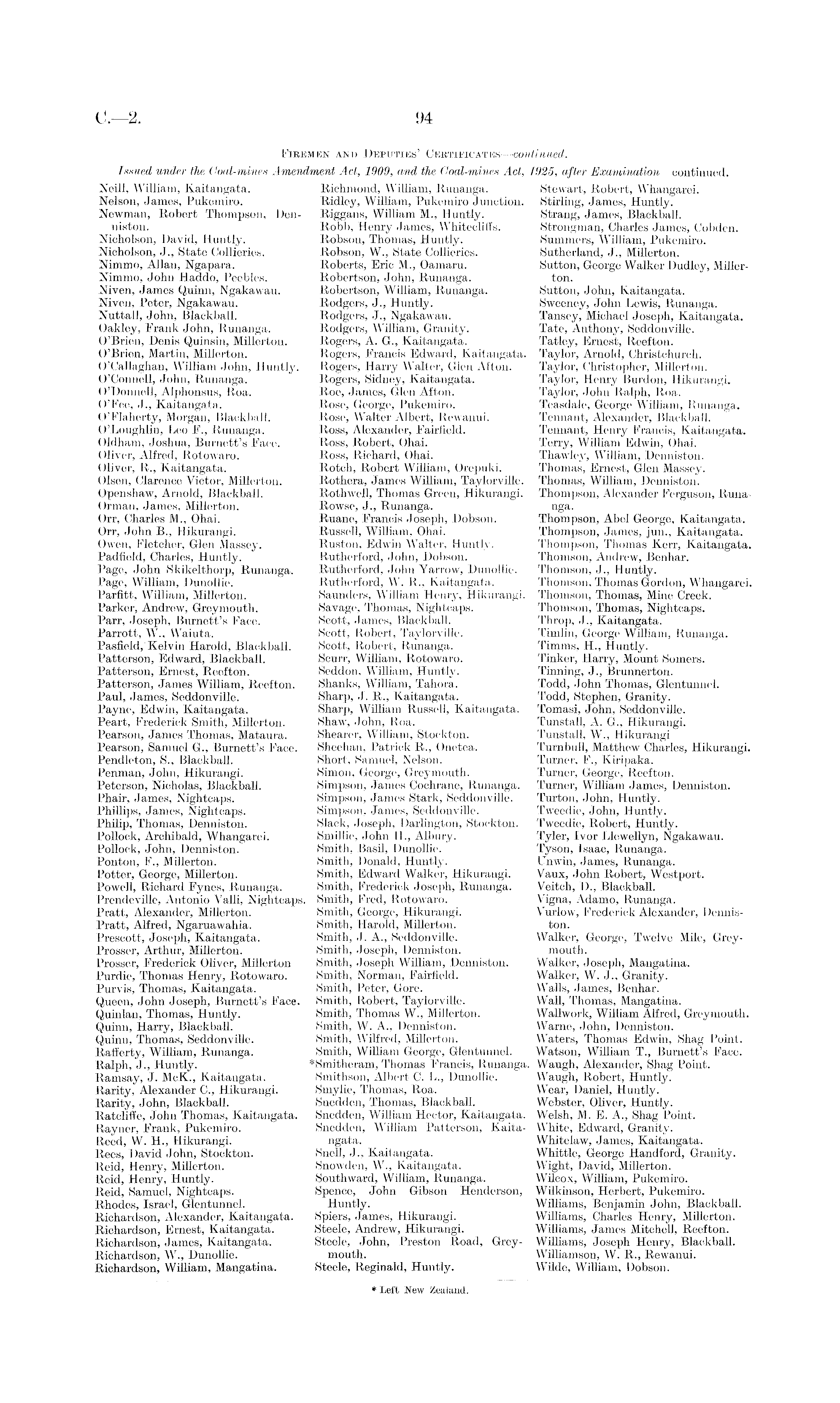 Firemen and Deputies' Certificates —continued. Issued under the Goal-mines Amendment Act, 1909, and the Coal-mines Act, 1925, after Examination continued. Neill, William, Kaitangata. Richmond, William, Runanga. Stewart, Robert, Whangarei. Nelson, James, Pukemiro. Ridley, William, Pukemiro Junction. Stirling, James, Huntly. Newman, Robert Thompson, Den- Riggans, William M., Huntly. Strang, James, Blackball. niston. Robb, Henry James, Whitecliffs. Strongman, Charles James, Cobden. Nicholson, David, Huntly. Robson, Thomas, Huntly. Summers, William, Pukemiro. Nicholson, J., State Collieries. Robson, W., State Collieries. Sutherland, J., Millerton. Nimmo, Allan, Ngapara. Roberts, Eric M., Oamaru. Sutton, George Walker Dudley, Miller - Nimmo, John Haddo, Peebles. Robertson, John, Runanga. ton. Niven, James Quinn, Ngakawau. Robertson, William, Runanga. Sutton, John, Kaitangata. Niven, Peter, Ngakawau. Rodgers, J., Huntly. Sweeney, John Lewis, Runanga. Nuttall, John, Blackball. Rodgers, J., Ngakawau. Tansey, Michael Joseph, Kaitangata. Oakley, Frank John, Runanga. Rodgers, William, Granity. Tate, Anthony, Seddonville. O'Brien, Denis Quinsin, Millerton. Rogers, A. G., Kaitangata. Tatley, Ernest, Reef ton. O'Brien, Martin, Millerton. Rogers, Francis Edward, Kaitangata. Taylor, Arnold, Christchurch. O'Callaghan, William John, Huntly. Rogers, Harry Walter, Glen Afton. Taylor, Christopher, Millerton. O'Connell, John, Runanga. Rogers, Sidney, Kaitangata. Taylor, Henry Burdon, Hikurangi. O'Donnell, Alphonsus, Roa. Roe, James, Glen Afton. Taylor, John Ralph, Roa. O'Fee, J., Kaitangata. Rose, George, Pukemiro. Teasdale, George William, Runanga. O'Flaherty, Morgan, Blackball. Rose, Walter Albert, Rewanui. Tennant, Alexander, Blackball. O'Loughlin, Leo F., Runanga. Ross, Alexander, Fairfield. Tennant, Henry Francis, Kaitangata. Oldham, Joshua, Burnett's Face. Ross, Robert, Ohai. Terry, William Edwin, Ohai. Oliver, Alfred, Rotowaro. Ross, Richard, Ohai. Thawley, William, Denniston. Oliver, R., Kaitangata. Rotch, Robert William, Orepuki. Thomas, Ernest, Glen Massey. Olsen, Clarence Victor, Millerton. Rothera, James William, Taylorville. Thomas, William, Denniston. Openshaw, Arnold, Blackball. Rothwell, Thomas Green, Hikurangi. Thompson, Alexander Ferguson, RunaOrman, James, Millerton. Rowse, J., Runanga. nga. Orr, Charles M., Ohai. Ruane, Francis Joseph, Dobson. Thompson, Abel George, Kaitangata. Orr, John 8., Hikurangi. Russell, William, Ohai. Thompson, James, jun., Kaitangata. Owen, Fletcher, Glen Massey. Ruston, Edwin Walter, Huntly. Thompson, Thomas Kerr, Kaitangata. Padfield, Charles, Huntly. Rutherford, John, Dobson. Thomson, Andrew, Benhar. Page, John Skikelthorp, Runanga. Rutherford, John Yarrow, Dutiollie. Thomson, J., Huntly. Page, William, Dunollie. Rutherford, W. R., Kaitangata. Thomson, Thomas Gordon, Whangarei. Parfitt, William, Millerton. Saunders, William Henry, Hikurangi. Thomson, Thomas, Mine Creek. Parker, Andrew, Greymouth. Savage, Thomas, Nightcaps. Thomson, Thomas, Nightcaps. Parr, Joseph, Burnett's Face. Scott, James, Blackball. Throp, J., Kaitangata. Parrott, W., Waiuta. Scott, Robert, Taylorville. Timlin, George William, Runanga. Pasfield,'Kelvin Harold, Blackball. Scott, Robert, Runanga. Timms, H., Huntly. Patterson, Edward, Blackball. Scurr, William, Rotowaro. Tinker, Harry, Mount Somers. Patterson, Ernest, Reefton. Seddon, William, Huntly. Tinning, J., Brunnerton. Patterson, James William, Reefton. Shanks, William, Tahora. Todd, John Thomas, Glentunnel. Paul, James, Seddonville. Sharp, J. R., Kaitangata. Todd, Stephen, Granity. Payne, Edwin, Kaitangata. Sharp, William Russell, Kaitangata. Tomasi, John, Seddonville. Peart, Frederick Smith, Millerton. Shaw, John, Roa. Tunstall, A. G., Hikurangi. Pearson, James Thomas, Mataura. Shearer, William, Stockton. Tunstall, W., Hikurangi Pearson, Samuel G., Burnett's Face. Sheehan, Patrick R., Onetea. Turnbull, Matthew Charles, Hikurangi. Pendleton, S., Blackball. Short, Samuel, Nelson. Turner, F., Kiripaka. Penman, John, Hikurangi. Simon, George, Greymouth. Turner, George, Reefton. Peterson, Nicholas, Blackball. Simpson, James Cochrane, Runanga. Turner, William James, Denniston. Phair, James, Nightcaps. Simpson, James Stark, Seddonville. Turton, John, Huntly. Phillips, James, Nightcaps. Simpson, James, Seddonville. Tweedie, John, Huntly. Philip, Thomas, Denniston. Slack, Joseph, Darlington, Stockton. Tweedie, Robert, Huntly. Pollock, Archibald, Whangarei. Smillie, John H., Albury. Tyler, Ivor Llewellyn, Ngakawau. Pollock, John, Denniston. Smith, Basil, Dunollie. Tyson, Isaac, Runanga. Ponton, F., Millerton. Smith, Donald, Huntly. Unwin, James, Runanga. Potter, George, Millerton. Smith, Edward Walker, Hikurangi. Vaux, John Robert, Westport. Powell, Richard Fynes, Runanga. Smith, Frederick Joseph, Runanga. Veitch, D., Blackball. Prendeville, Antonio Valli, Nightcaps. Smith, Fred, Rotowaro. Vigna, Adamo, Runanga. Pratt, Alexander, Millerton. Smith, George, Hikurangi. Vurlow, Frederick Alexander, DeunisPratt, Alfred, Ngaruawahia. Smith, Harold, Millerton. ton. Prescott, Joseph, Kaitangata. Smith, J. A., Seddonville. Walker, George, Twelve Mile, GreyProsser, Arthur, Millerton. Smith, Joseph, Denniston. mouth. Prosser, Frederick Oliver, Millerton Smith, Joseph William, Denniston. Walker, Joseph, Mangatina. Purdie, Thomas Henry, Rotowaro. Smith, Norman, Fairfield. Walker, W. J., Granity. Purvis, Thomas, Kaitangata. Smith, Peter, Gore. Walls, James, Benhar. Queen, John Joseph, Burnett's Face. Smith, Robert, Taylorville. Wall, Thomas, Mangatina. Quinlan, Thomas, Huntly. Smith, Thomas W., Millerton. Wallwork, William Alfred, Greymouth. Quinn, Harry, Blackball. Smith, W. A., Denniston. Warne, John, Denniston. Quinn, Thomas, Seddonville. Smith, Wilfred, Millerton. Waters, Thomas Edwin, Shag Point. Raflerty, William, Runanga. Smith, William George, Glentunnel. Watson, William T., Burnett's Face. Ralph, J., Huntly. *Smitheram, Thomas Francis, Runanga. W